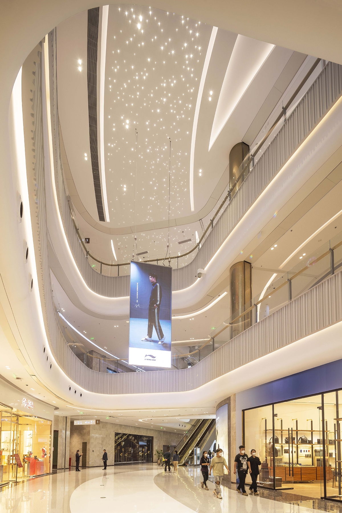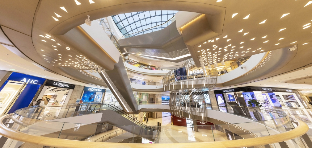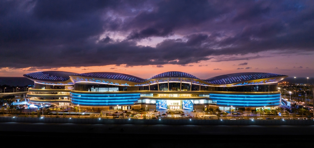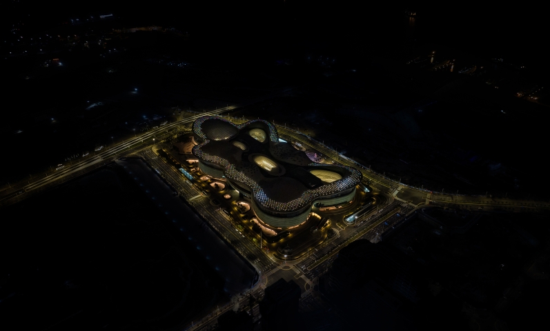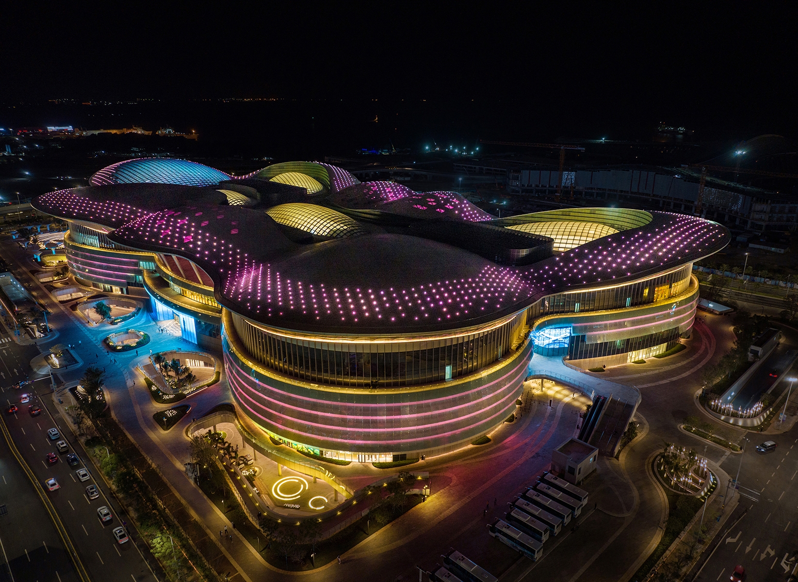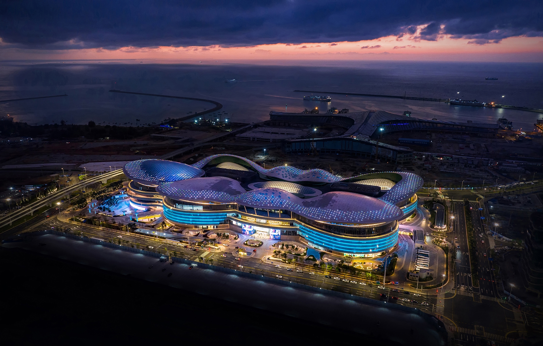 With its unique geographical location, the architectural design team created the cdf Haikou International Duty Free City with natural elements from the surrounding areas that are integrated into the architectural design which is based on the concept of the "Auspicious Clouds in Jiuzhou,the Crown of the South China Sea". The landscape merges symbiotically into the overall architecture with natural and elegant wavy curves made of metal panels and glass curtain wall allowing natural light into the building where necessary.