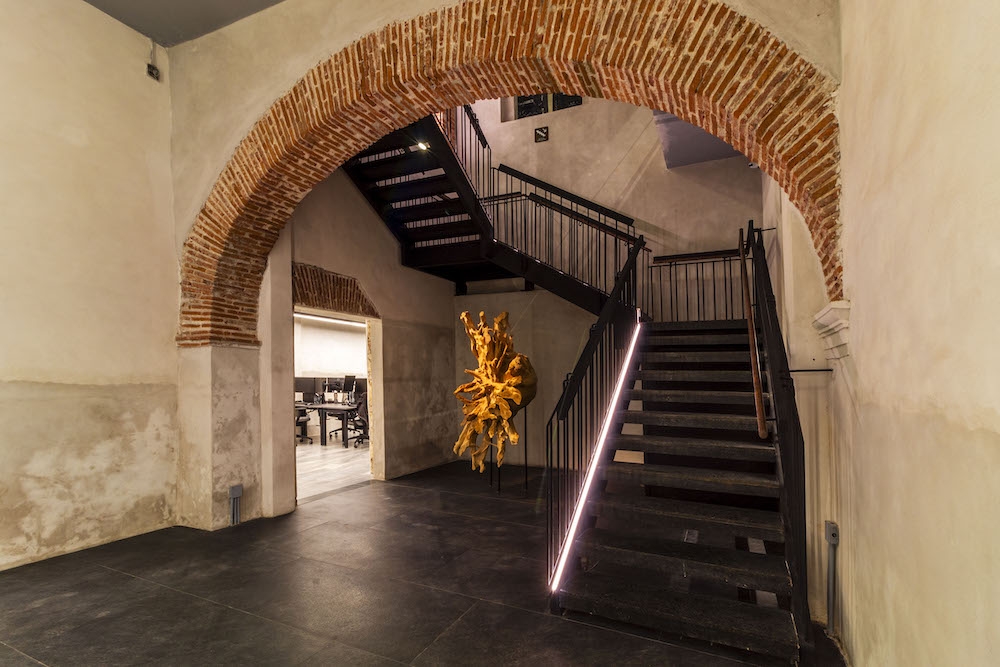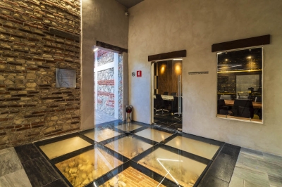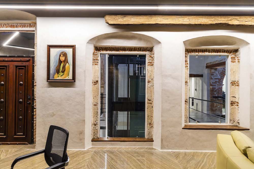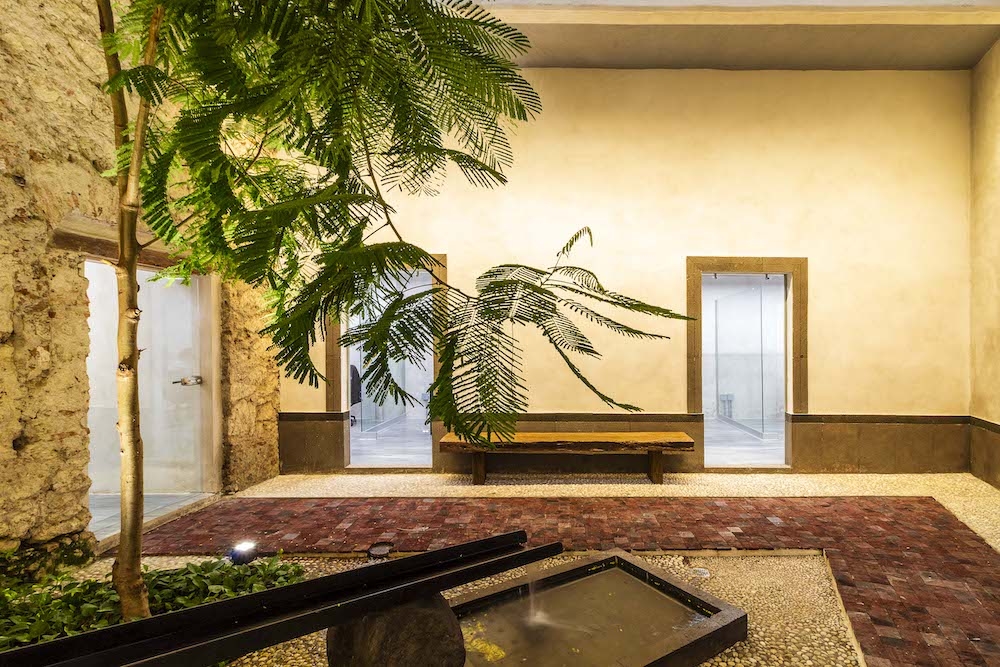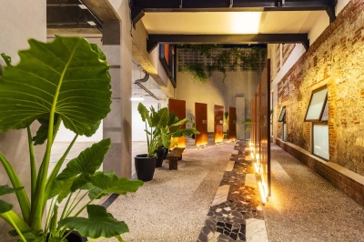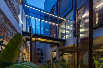Skylights crown open spaces with exposed concrete finishing. Access is via a vestibule ending in a red brick arch, leading to another space housing a staircase and elevator to the upper level. The original courtyard has been irregularly restored, with a frangipani tree and a glass structure showcasing an old rainwater collection cistern in a meeting room.