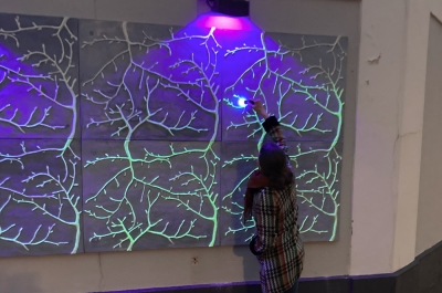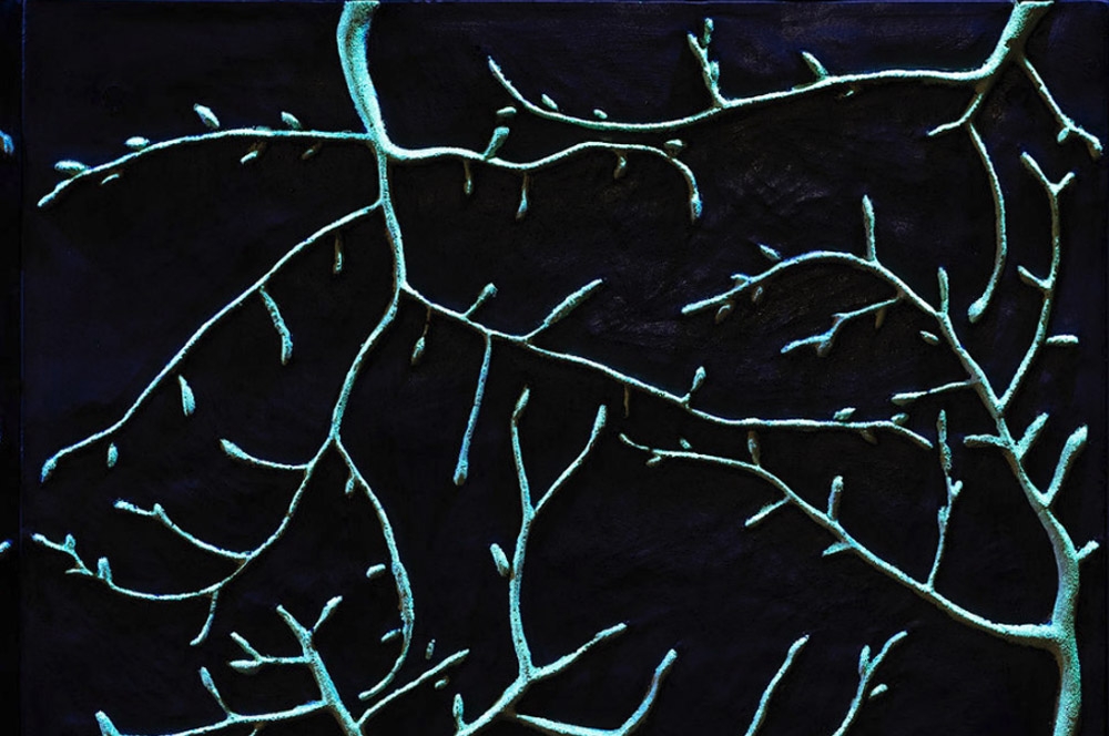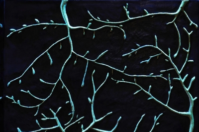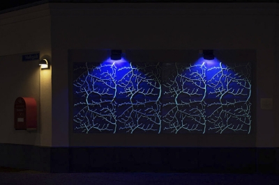 In daylight, the work show shades of blue with twisted branches. In darkness, a luminous green net of roots is drawn.