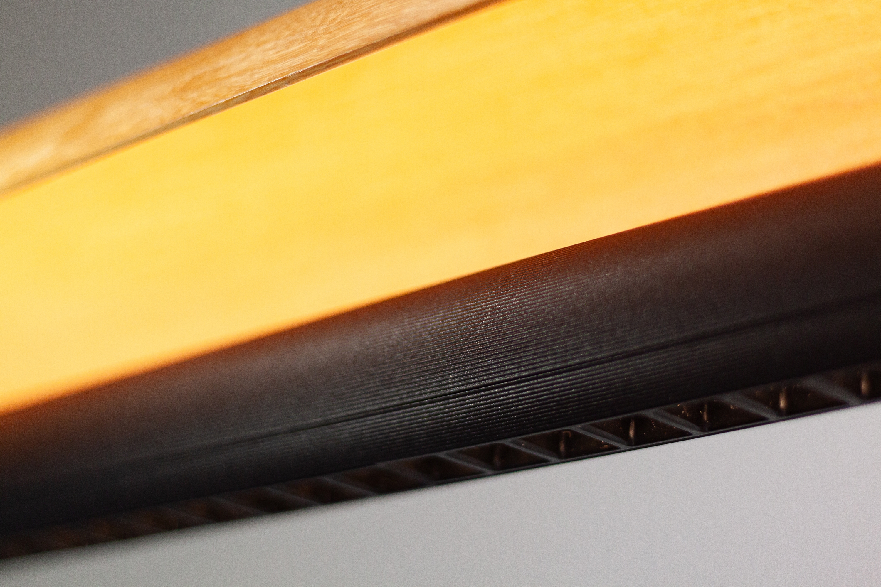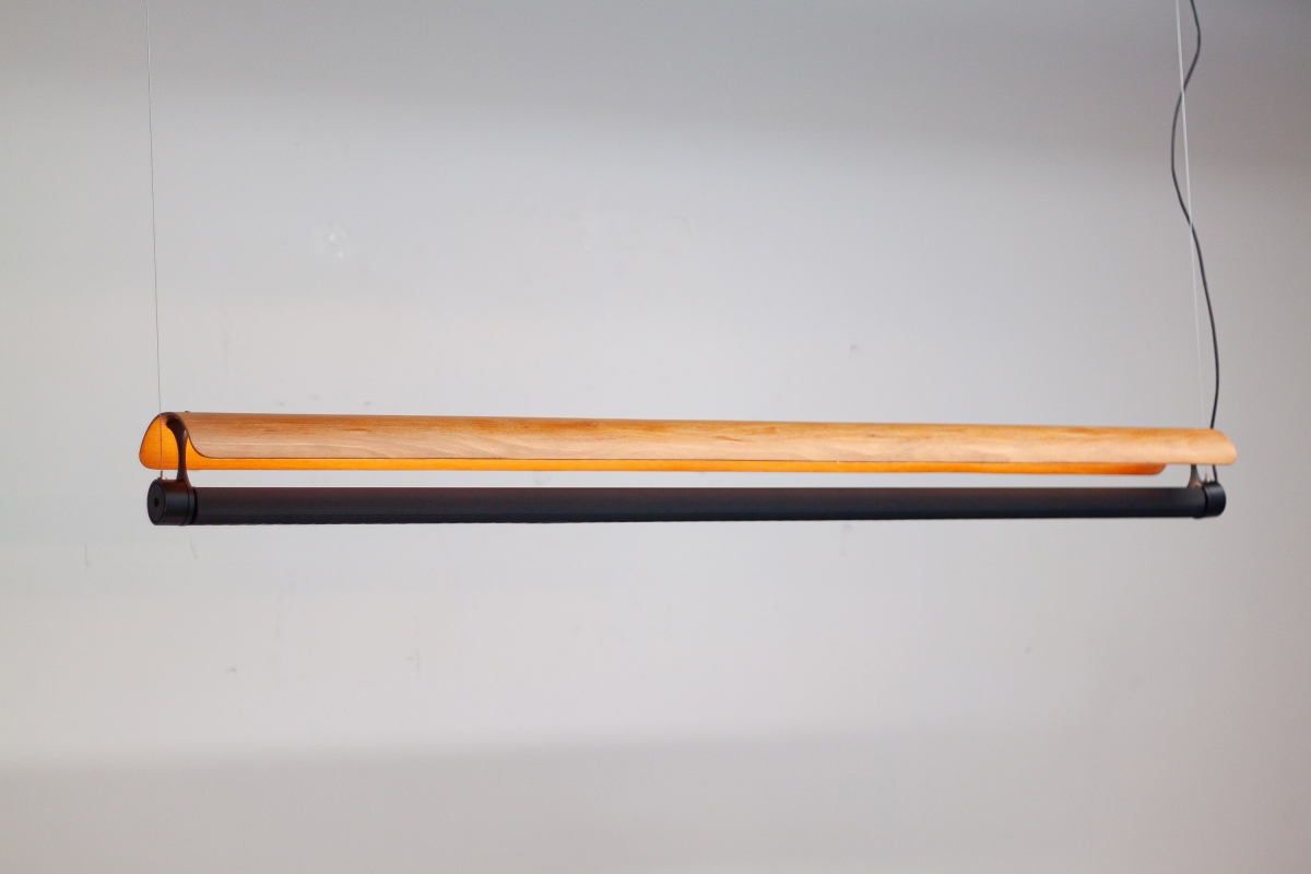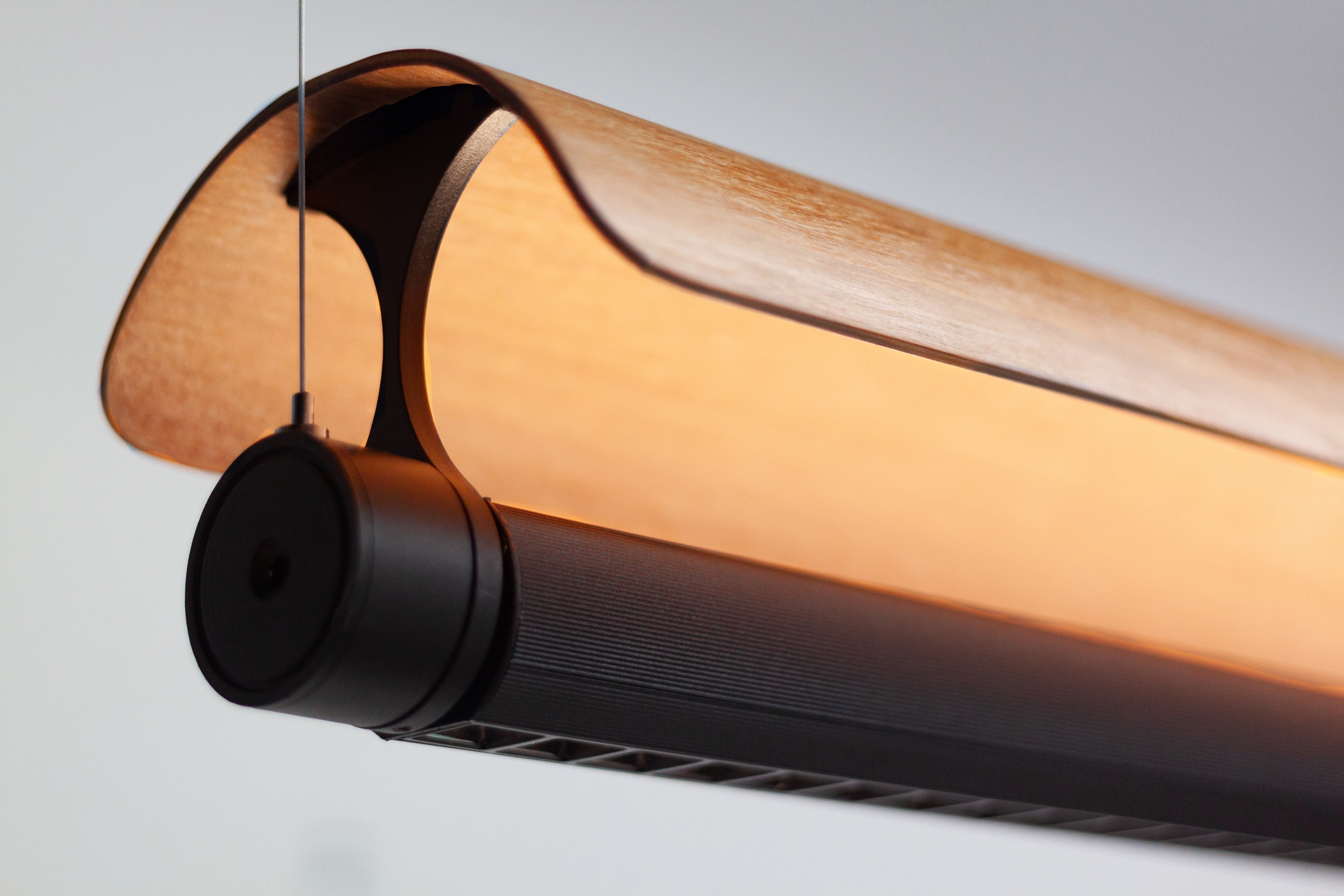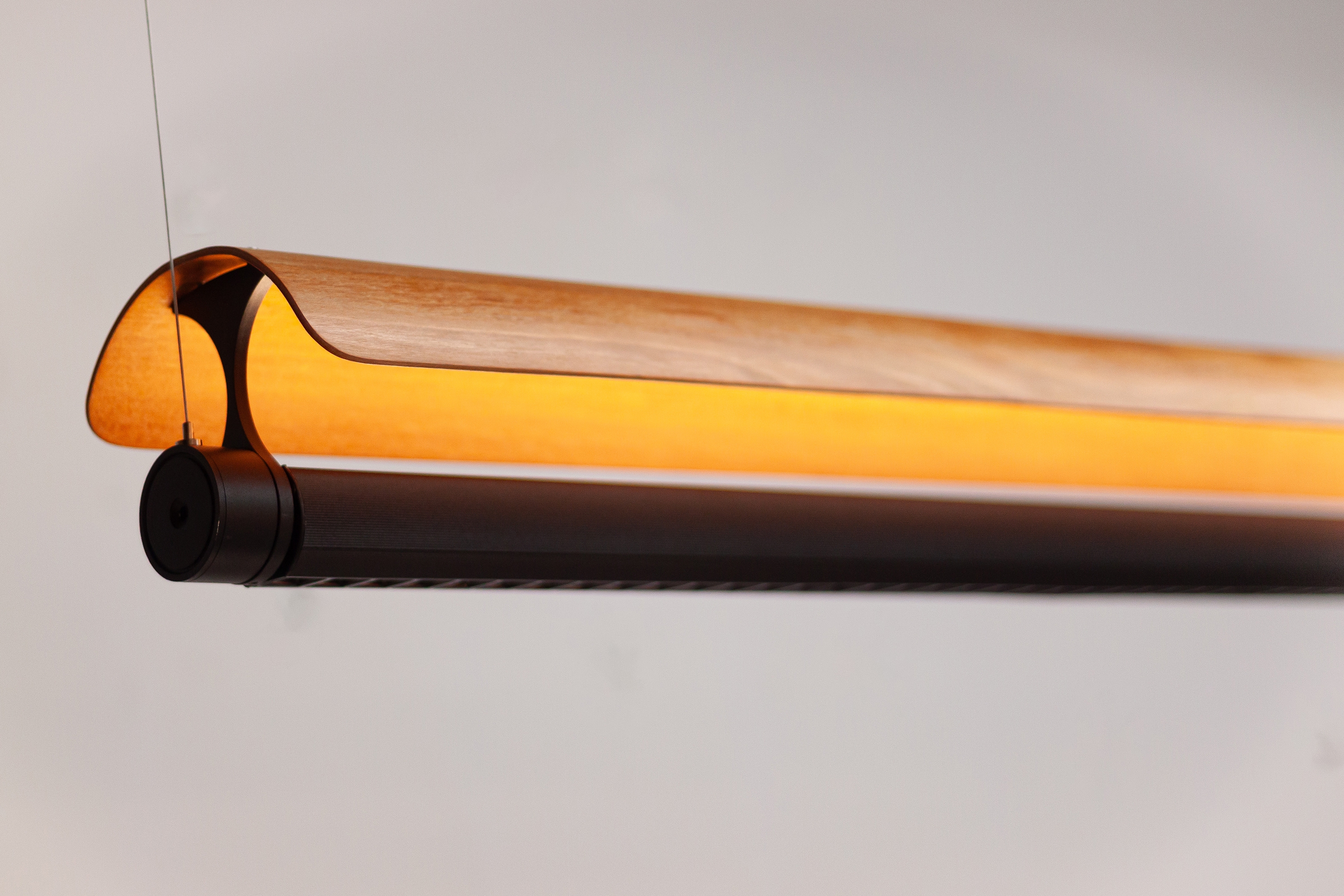 and the forces of nature that shape the world. Your profile is sculpted in extruded aluminum while your deflector is made in curved wood. When lit, it emits a soft light reminiscent of the golden rays of the setting sun, bringing a sense of peace and connection with nature to any environment.