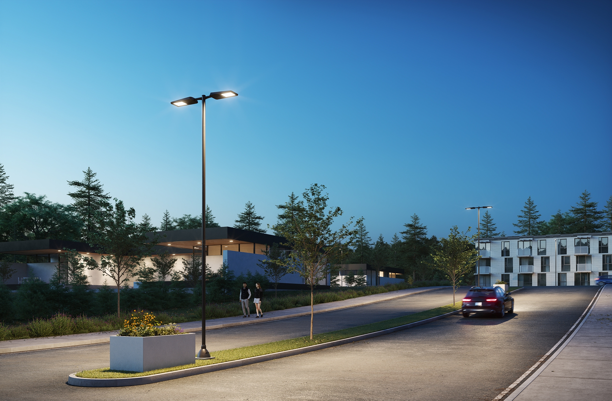 Tribeca’s thin, refined aesthetic has also been designed with city installers in mind. The clean surface has a discreet push-button latch that allows tool-free access for installation and maintenance. Despite the thin design, Tribeca hides advanced thermal management to enable efficient delivery of 12 different performance packages up to 34 000 lumens. This light engine is precisely paired with optics, maximizing efficiency by eliminating the need for a glass face to make the fixture watertight. These class-leading optics are available in 14 standard roadway distribution types. They can also be innovatively configured to beautifully light both the roadway and the pedestrian path from a single luminaire head. Tribeca has the form and function that landscape architects and city planners desire and require.