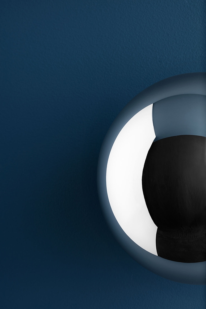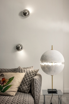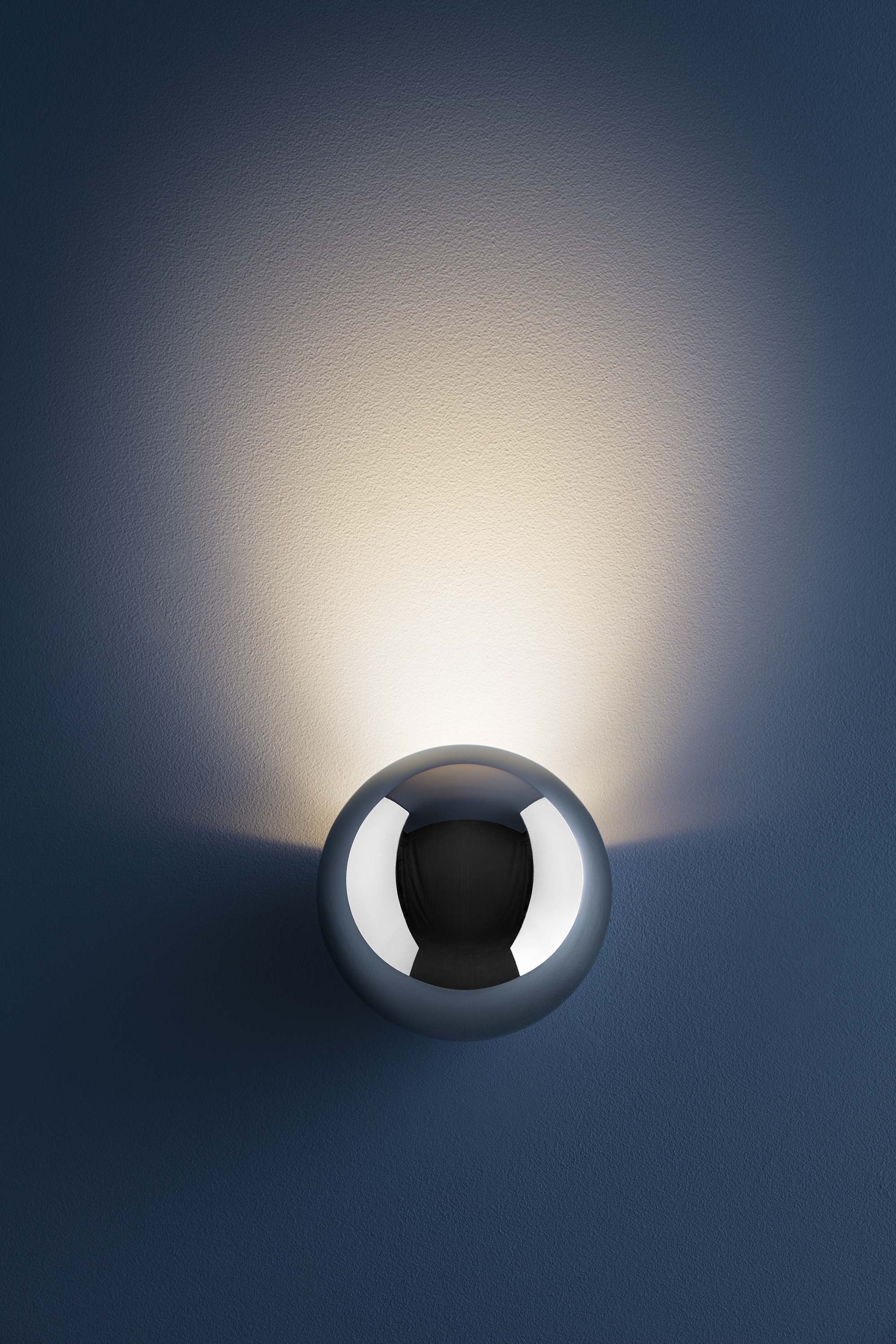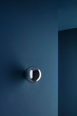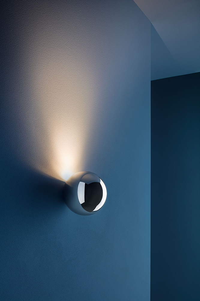 Conceived as a sphere touching the wall, it has no visible mechanical fastening, and the direction of the beam of light emitted can be chosen when the lamp is fitted, depending on how the bracket is