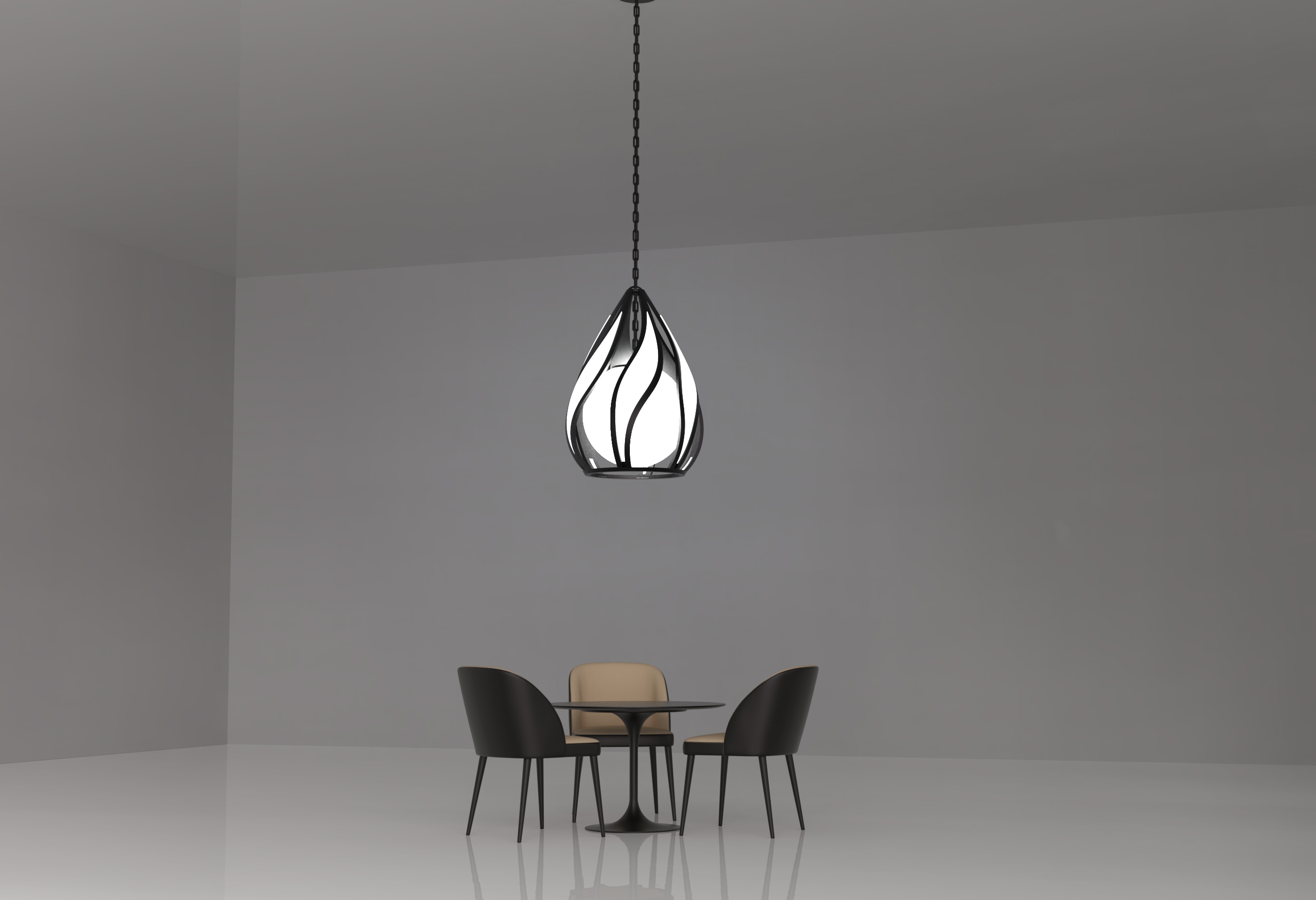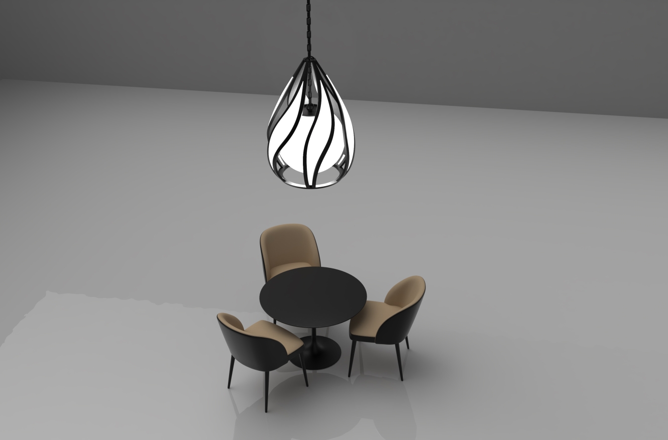 FLAMES is made from a coated metal frame. Flame shapes frame is set with led panels. In the center of the frame there is a spherical glass pendant with a standard led bulb. A combination of the two lighting types in one lamp provides a whimsical outer glow and at the same time has enough brightness for a large space. The lamp is intended as an architectural centerpiece for private or commercial spaces.