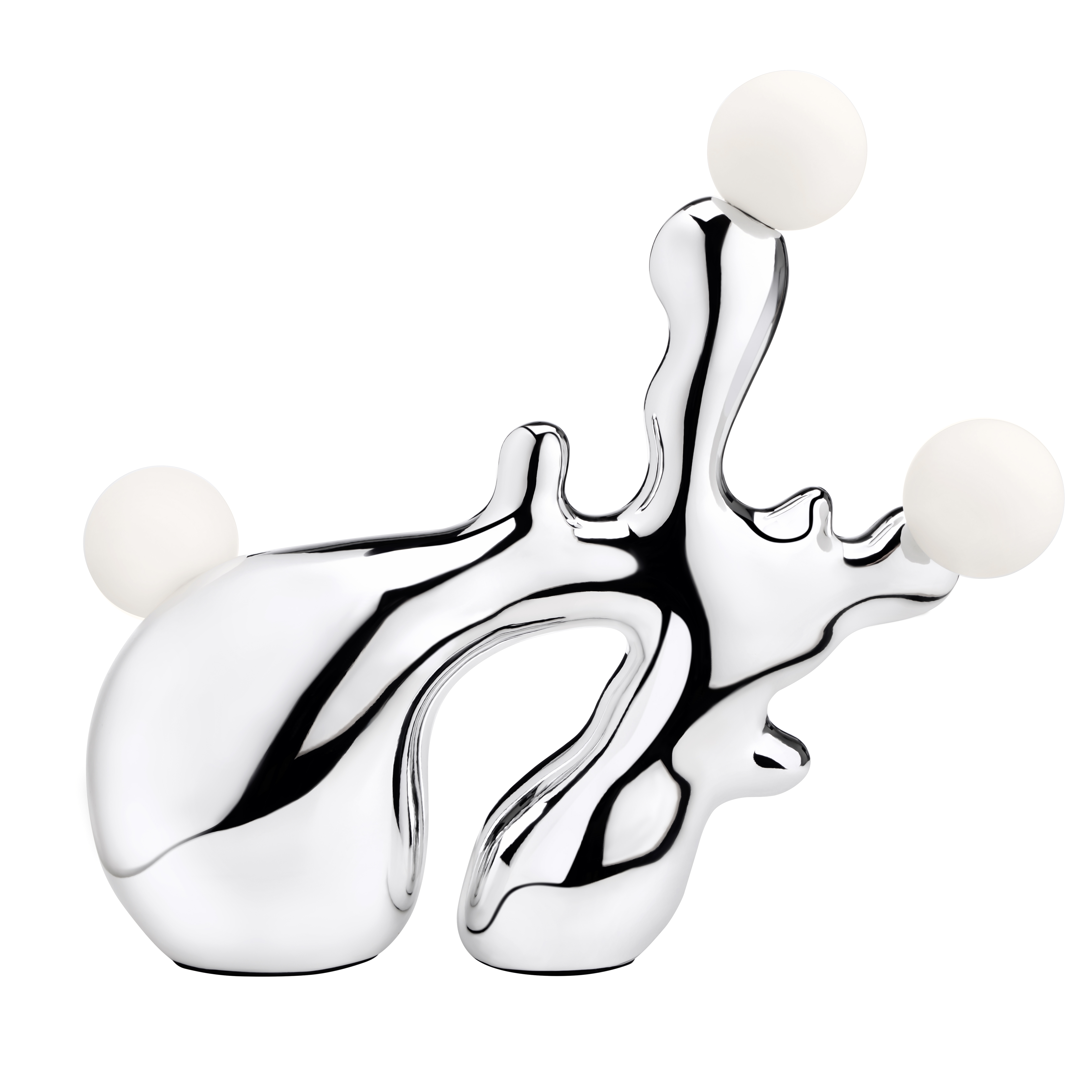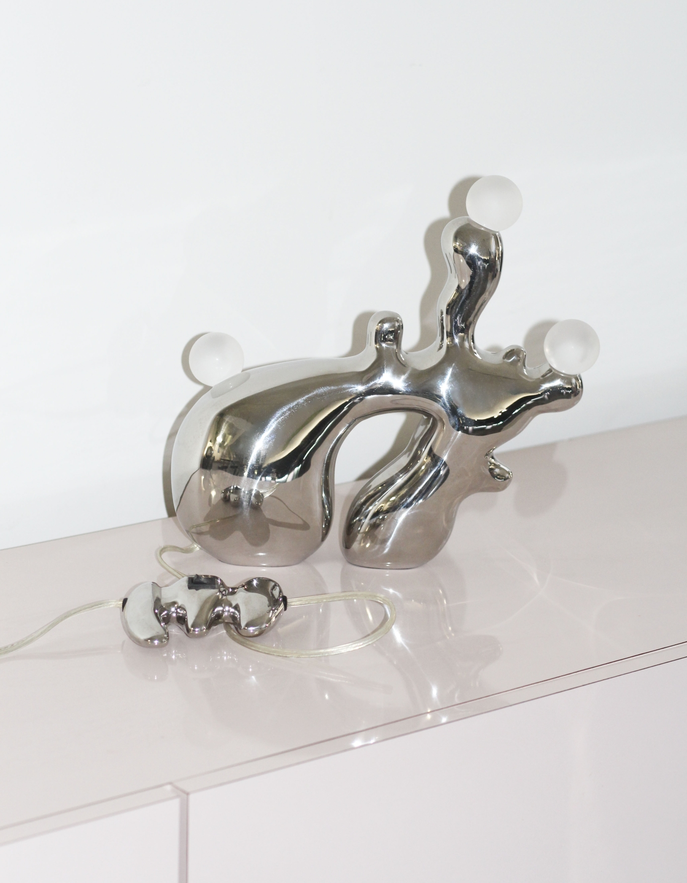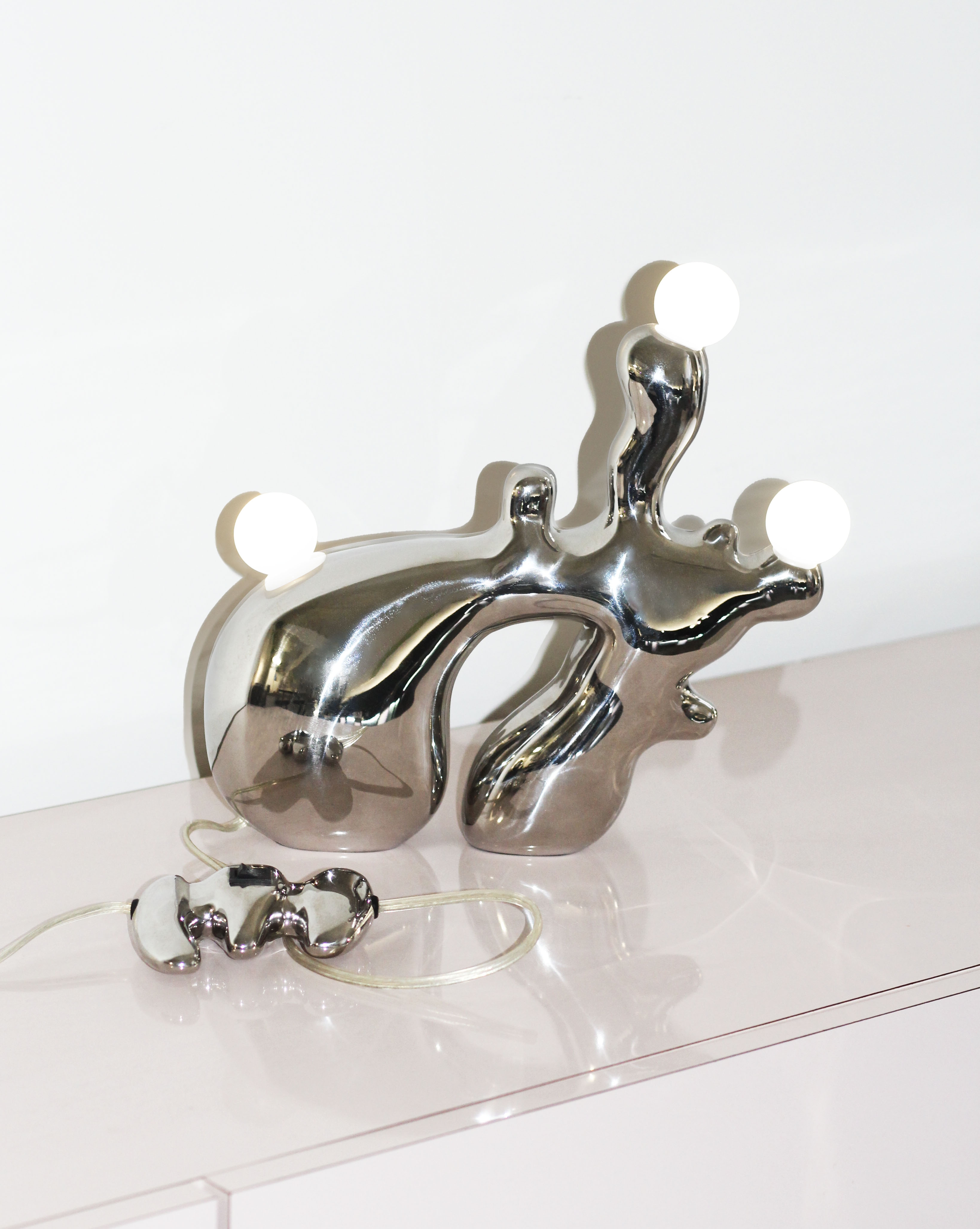 in Hannah Jewett’s jewelry. Its fluid shape holds 3 LED illuminated matte opal glass bulbs paired with a decoratively designed switch. Inspired by AI elements, liquid metal and amorphous shapes. This design is an amalgamation of functional sculptures, fusing virtual artistry and futuristic silhouettes.