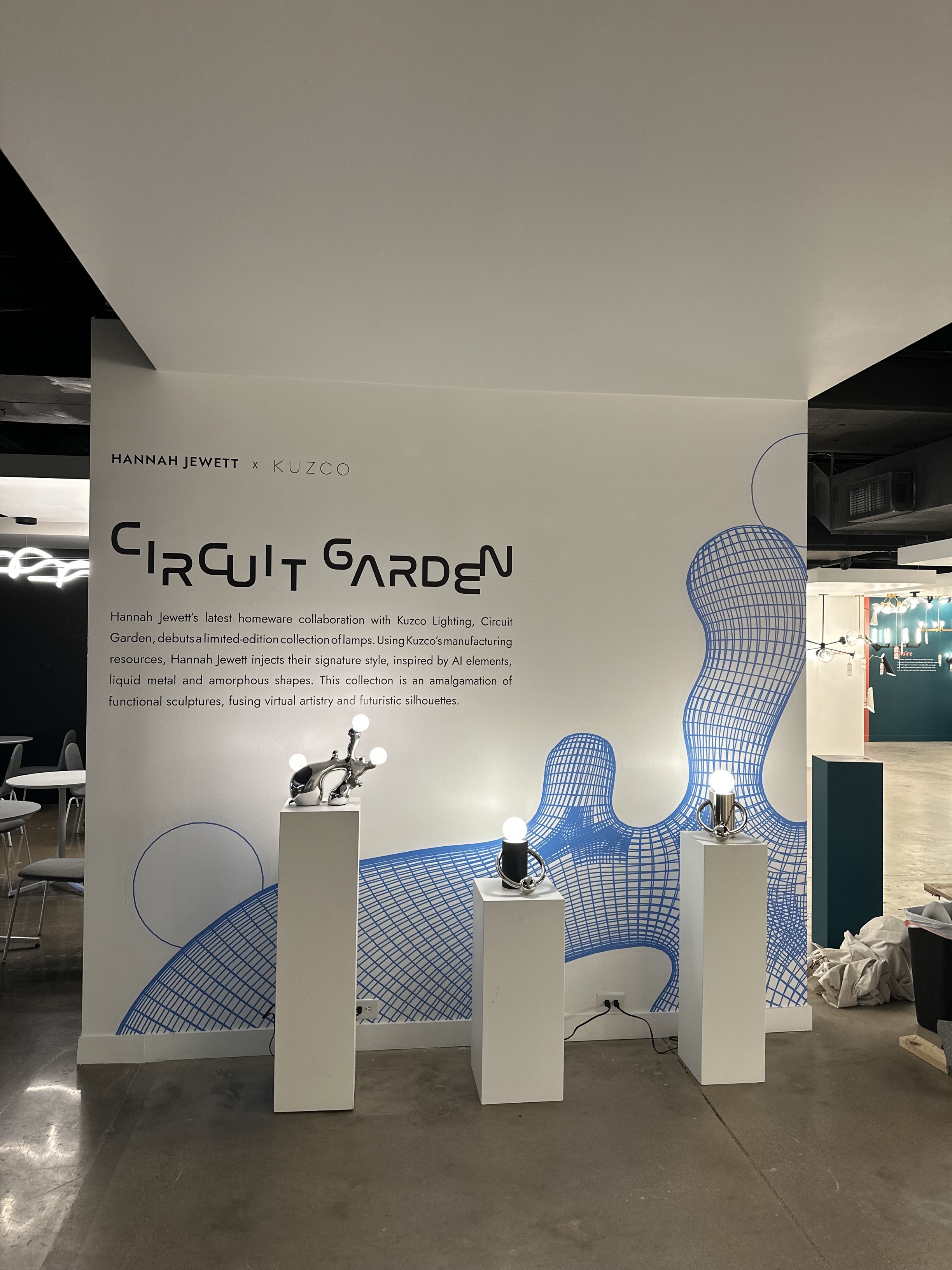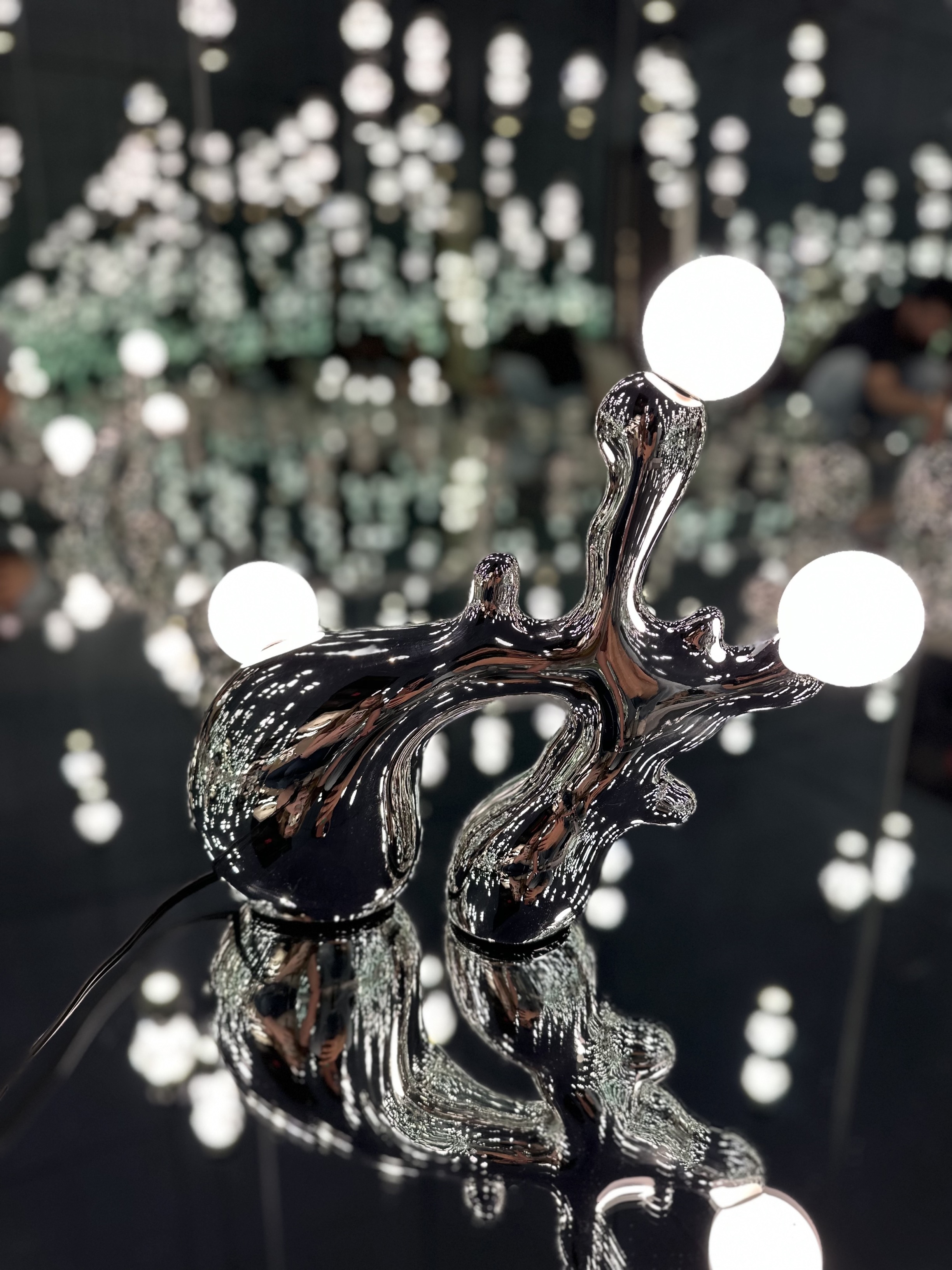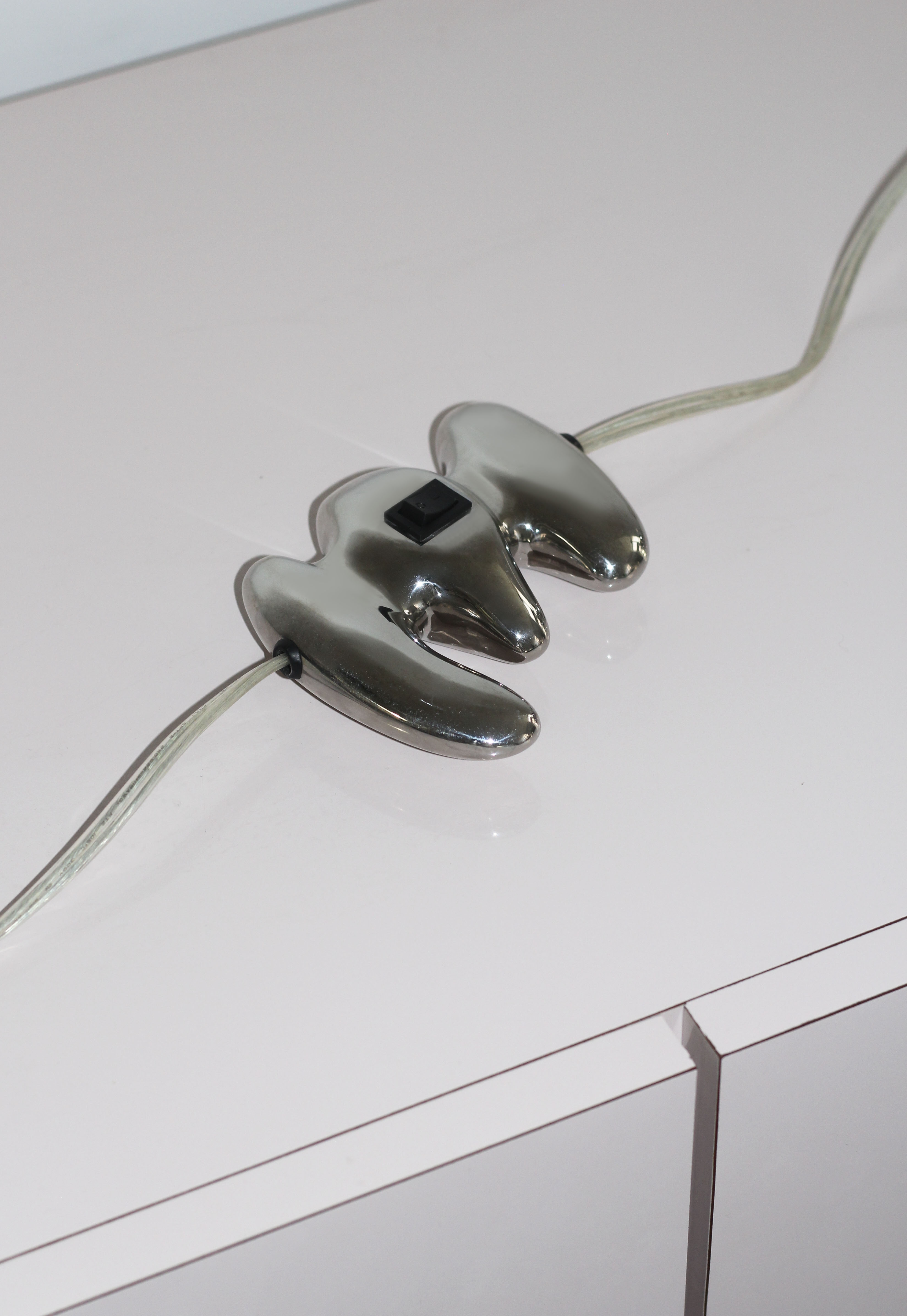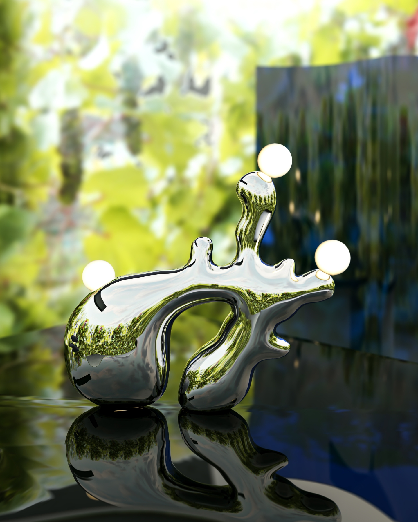 in Hannah Jewett’s jewelry. Its fluid shape holds 3 LED illuminated matte opal glass bulbs paired with a decoratively designed switch. Inspired by AI elements, liquid metal and amorphous shapes. This design is an amalgamation of functional sculptures, fusing virtual artistry and futuristic silhouettes.