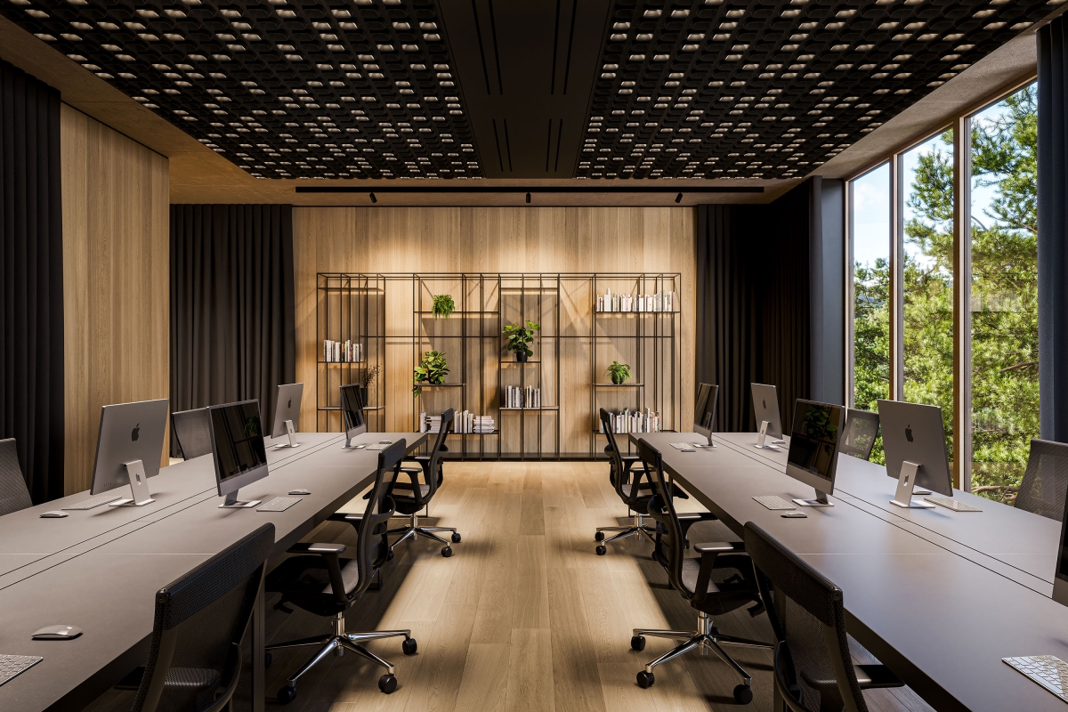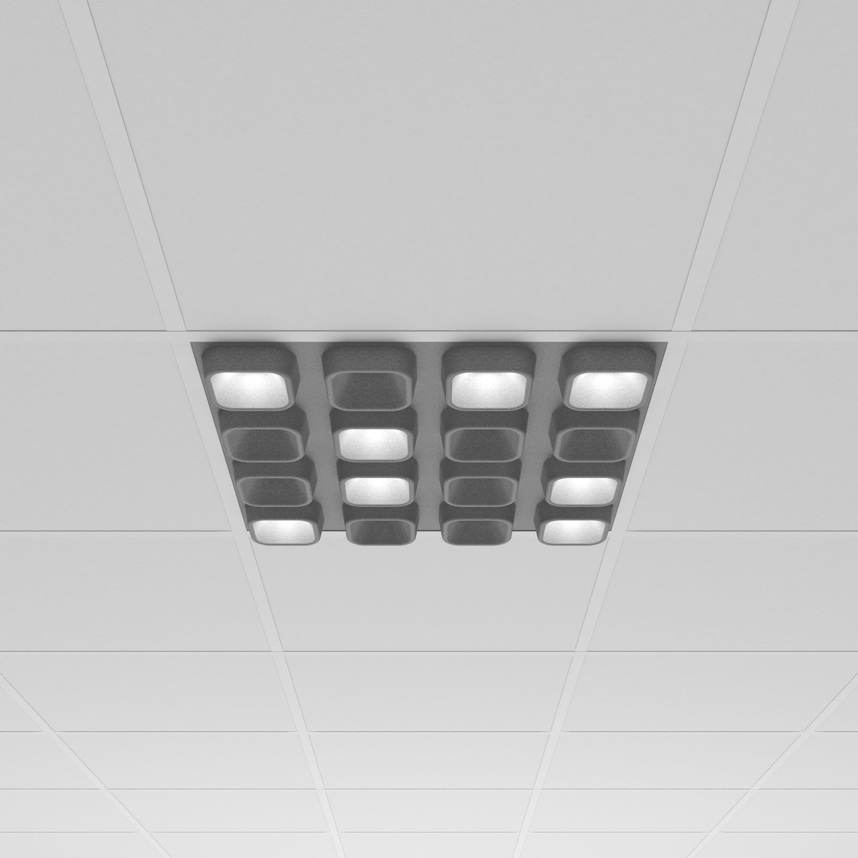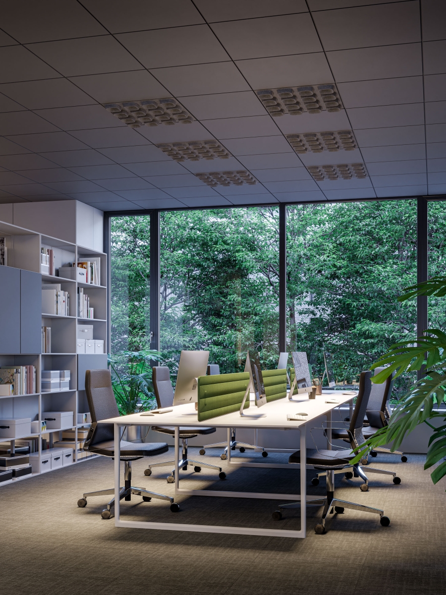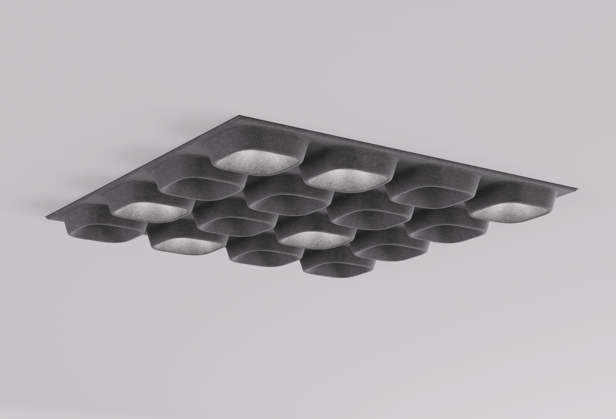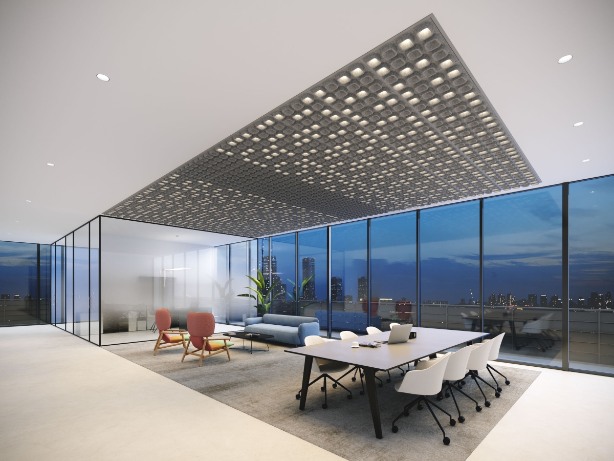 It's a luminaire and it's a ceiling and it solves three problems at once: it improves the acoustics, offers high-quality illumination with absolutely no glare, and replaces the false ceiling. It is able to create various scenarios and personalized micro ambiances.