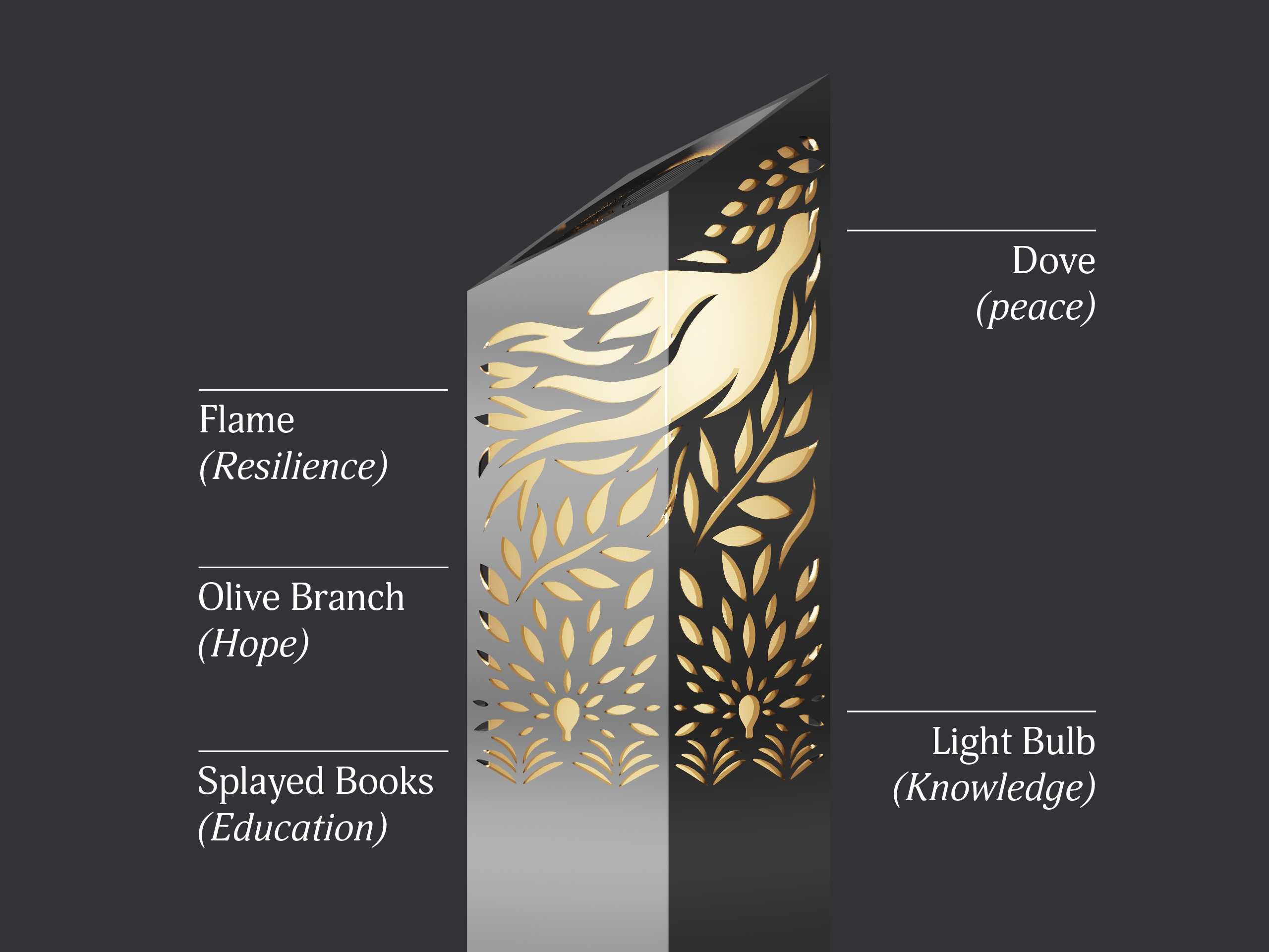 In Latin, 'Spiritum' means breath, air, soul, and life. The pulsing light through the detailed shell emulates a meditative breathing pattern and represents how the soul or memory of the departed still lives on with the memorial.