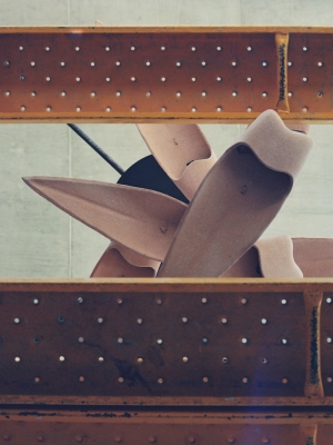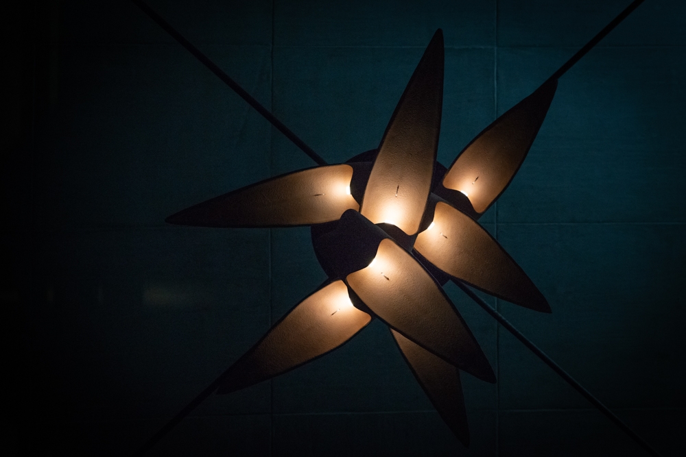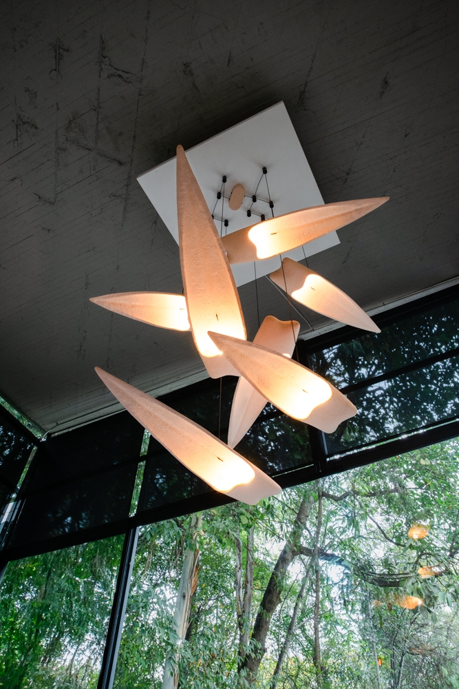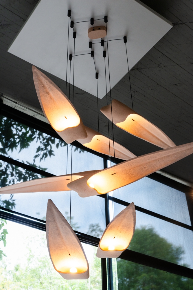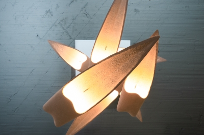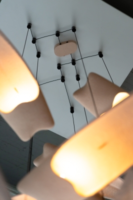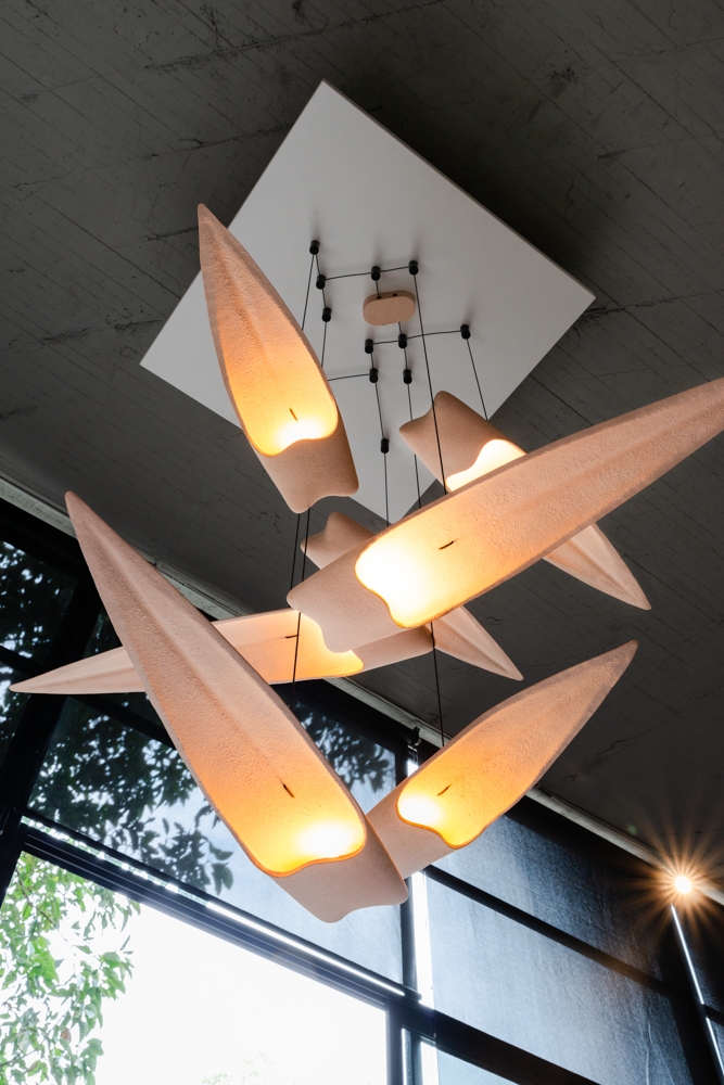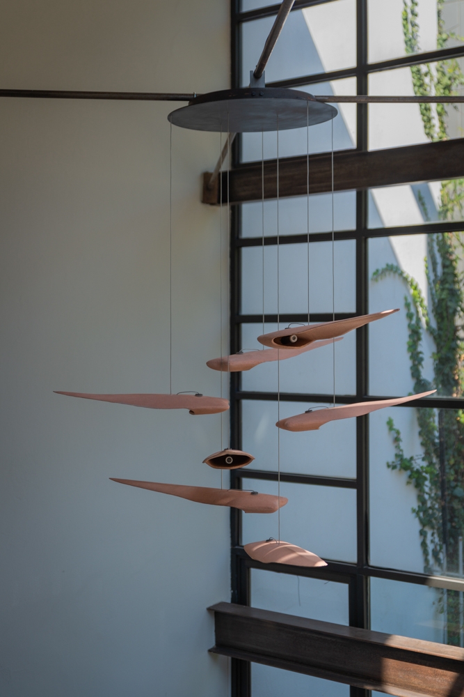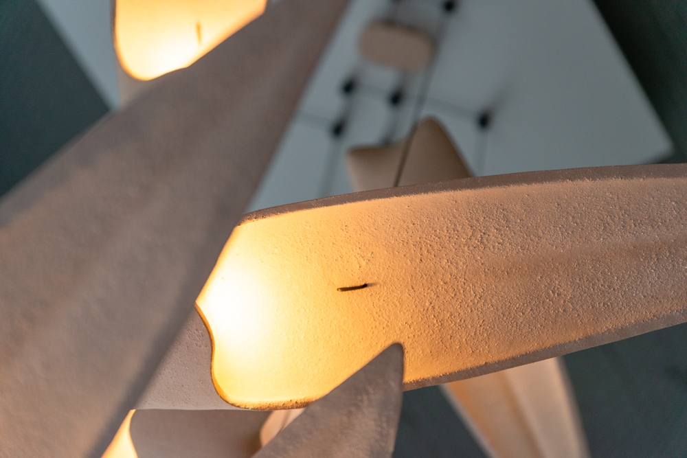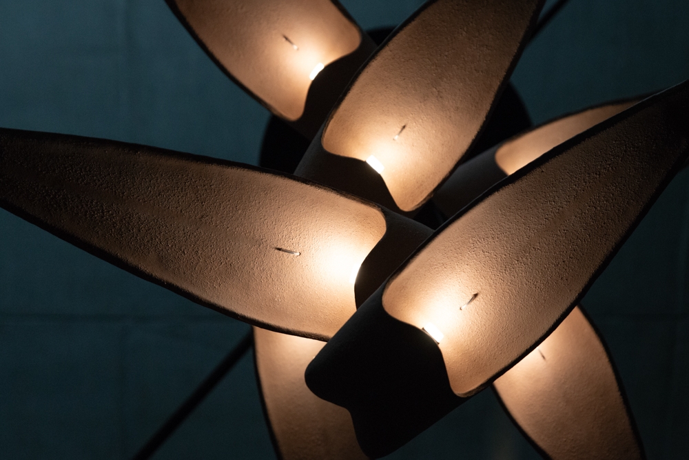 Rosetta is a ceiling lamp that draws inspiration from the agave. It combines the texture of its coarse earthenware with a sleek and organic shape to create a composition that is reminiscent of the piñata. The contrast created by the blued steel and raw ceramic finish alludes to the syncretism during Mexico’s 16th century and highlights the roots the long-lasting Mexican tradition, portrayed by the 7 pencas (agave leaves) which represent the seven deadly sins found in the traditional piñata.
