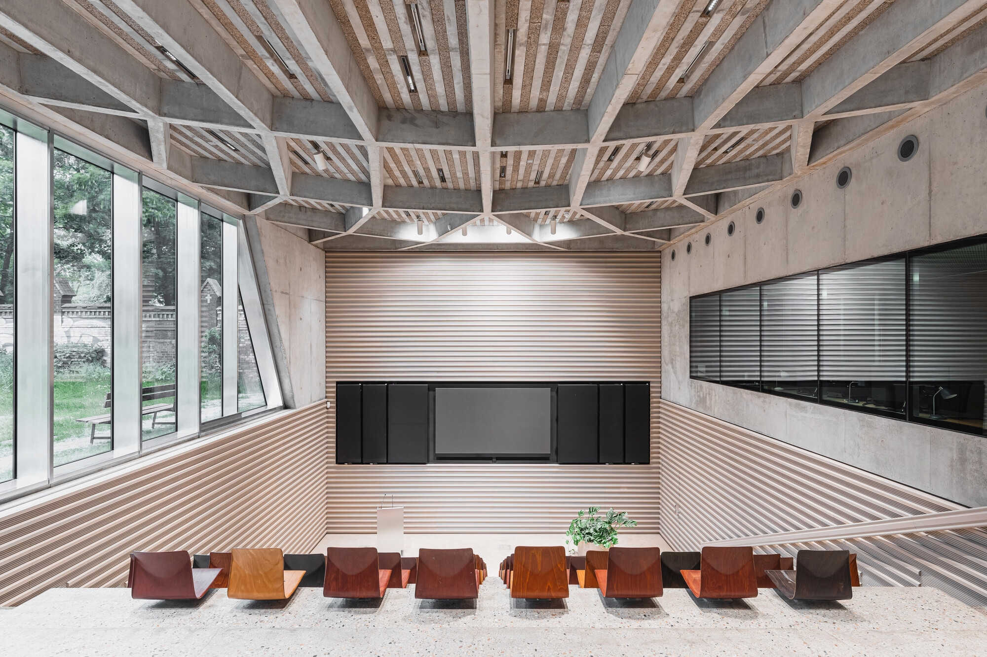 Entry DescriptionThe fundamental goal of the Spore Initiative is to promote dialogue between figures in politics, society, and the arts to harmonize culture and nature, and support projects that encourage ecological change. Its foyer area is characterized by a striking ceiling structure of coffered concrete cells and the lighting concept picks up on the graphic design language by integrating linear lighting elements into the ribs in a dissolved arrangement. In the auditorium, the height difference is compensated in terms of lighting by wide and medium-beam linear surface-mounted luminaires on the ground floor and narrow- and medium-beam luminaires in the deeper areas of the room. To accentuate the speaker and stage areas, narrow-beam track head luminaires are directed at the lectern from the lateral zones. Freely distributed lighting tracks allow for additional spotlights to be installed here as well. A wall-mounted control panel allows an easy adjustment of the lighting to the respective requirements. The lounge and cafeteria are oriented towards the forecourt and create a connection to the open space with its outside terrace via the generous glass facade. The ambient illumination is supplemented in the counter area by powerful light from medium-beam ceiling luminaires, which thus create good orientation within the space and accentuation of the gastronomic area.