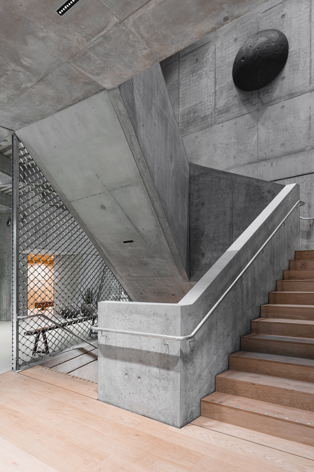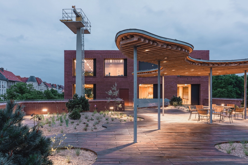 and ecological topics and projects, sustainability is also mirrored in the architecture and construction of the building in particular for the material and resource efficiency. Parts of the furniture, including the luminaires, are reused or recycled. The use of energy-saving control gear and LED light sources is provided in the whole building. Lamps in sanitary rooms, corridors, storage rooms and other ancillary rooms are controlled via presence detectors. There's also daylight-adaptive light intensity control in selected areas. Light pollution is reduced enormously by mostly eliminating exterior facade lighting. The staircase inside is crowned by a skylight, which allows a certain amount of daylight into the building and reduces the need for artificial light.