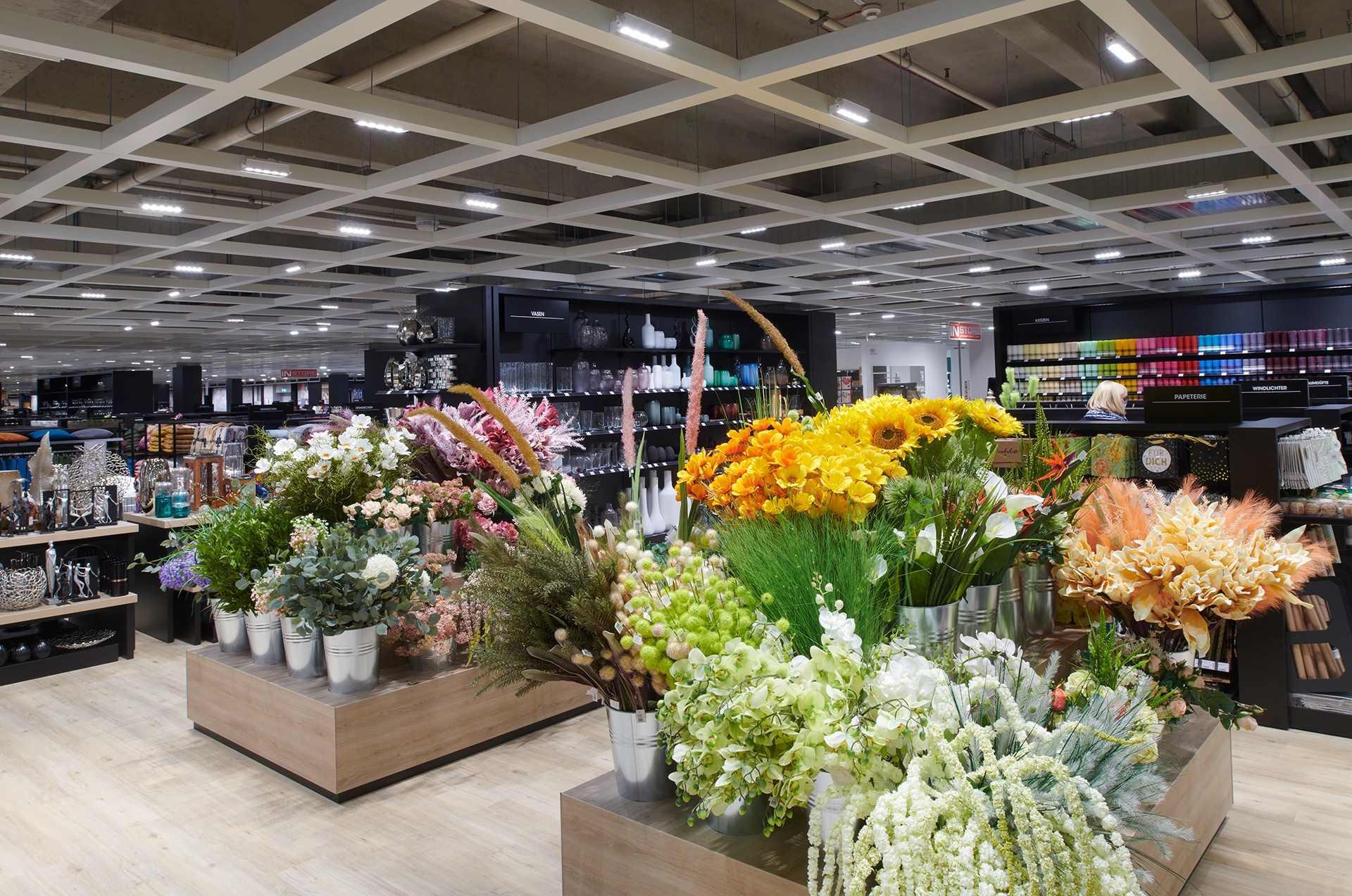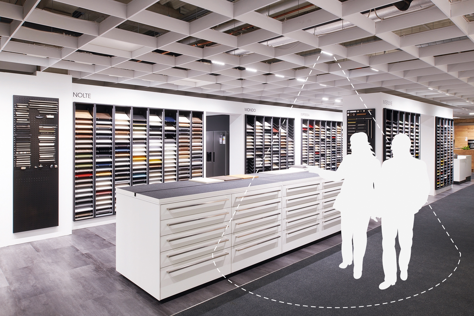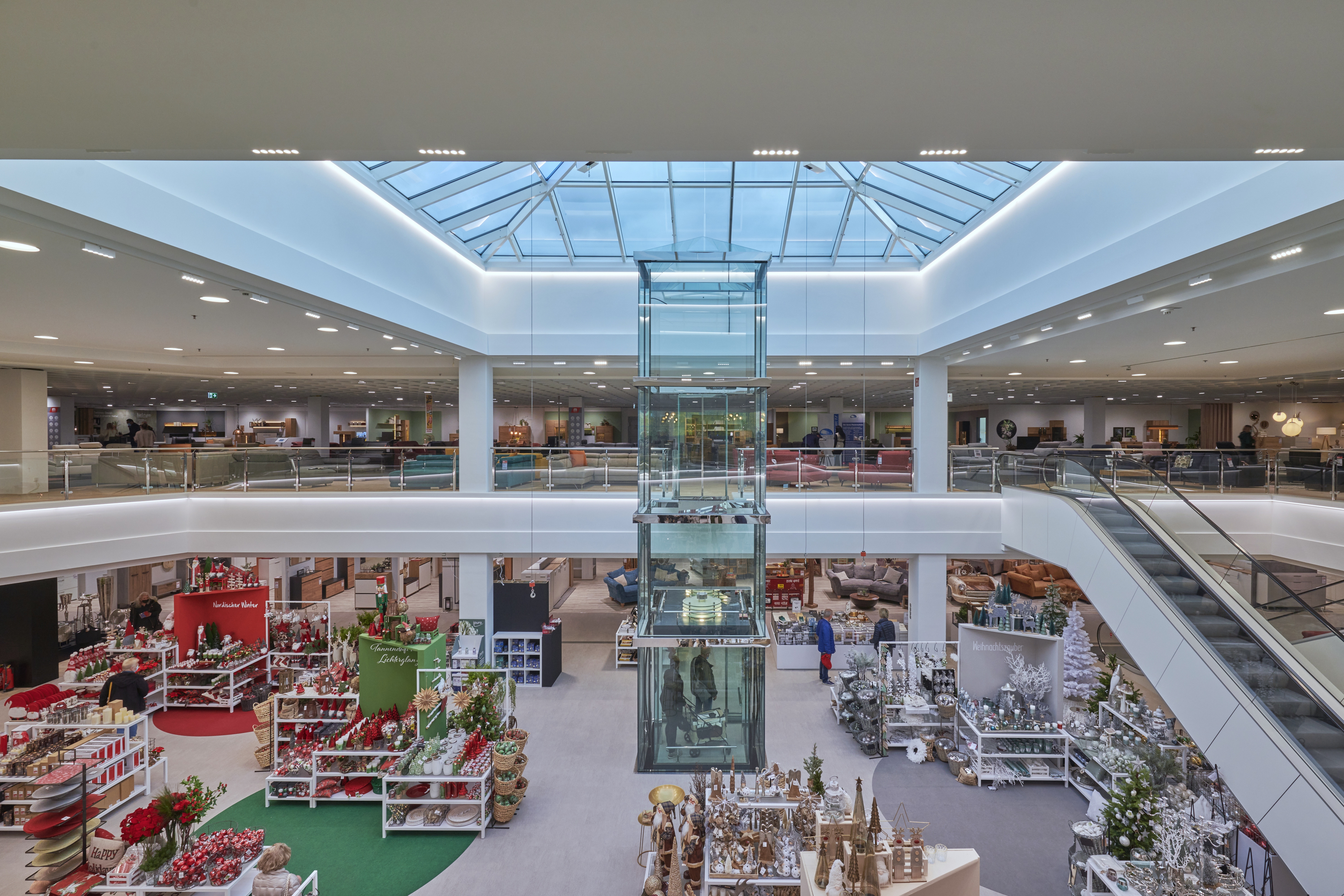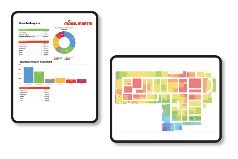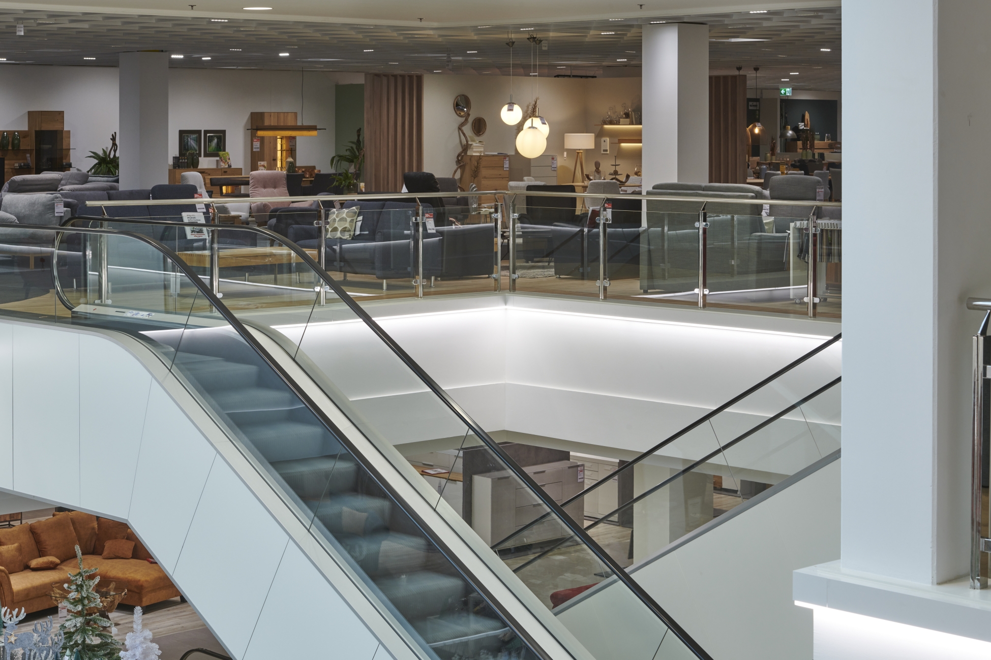 Möbel Martin in Ensdorf is the first furniture store to have implemented adaptive lighting across its entire sales area of 30,000 m². The traditional way of thinking, that all lighting must always be dimmed to 100%, has changed to one of sustainable and energy-efficient lighting. We are familiar with sensor-controlled lighting in corridors or offices, but on the sales area of a large store with its nested booths and interior situations, dimming via motion detectors is a very special challenge, because it must not happen that a customer suddenly finds themselves in a darkened area. Therefore, a great amount of effort was put into the strategically clever placement and interlinking of luminaires to sensors. When customers are present, the lighting dims to 100%; otherwise, the lighting dims to 30% in a fairly short period of time.