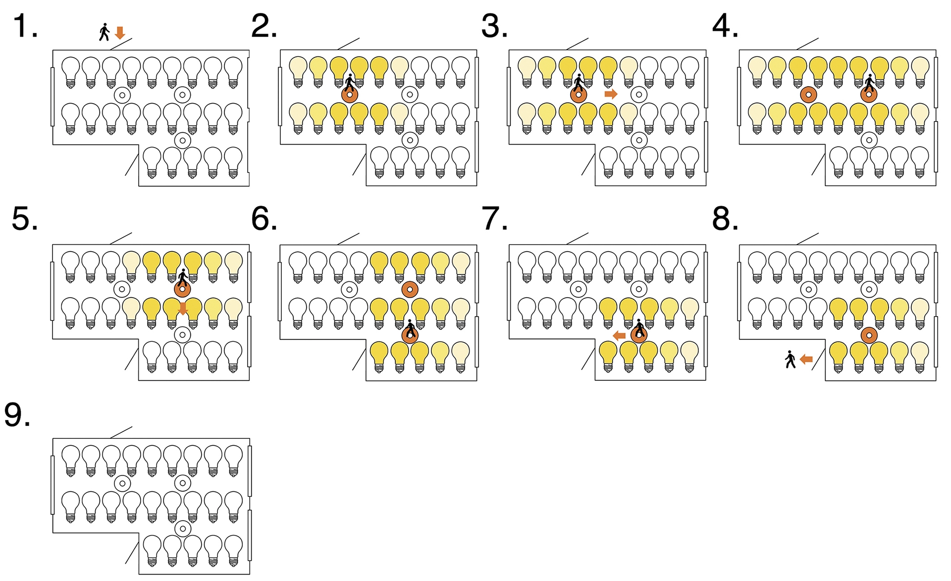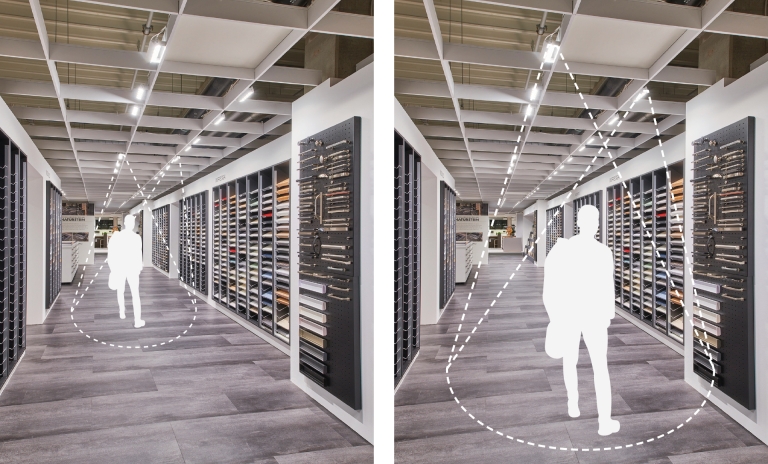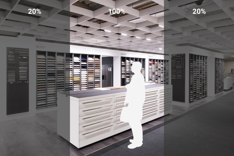 The positive effect: the customer feels valued because the lighting is „switched on just for them“. In addition, the dimming up explicitly brings the furnishing situation into the focus of perception.