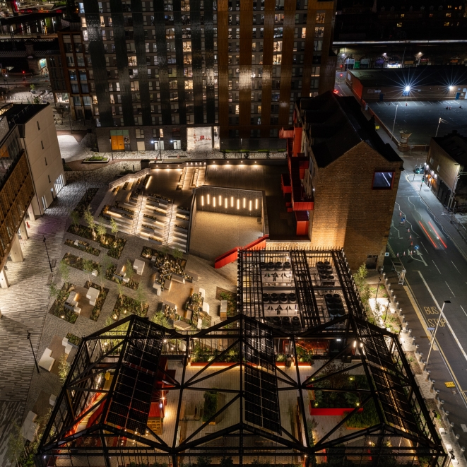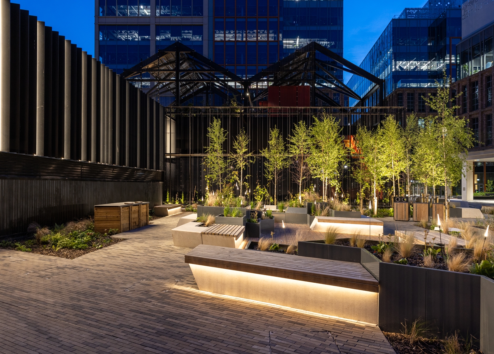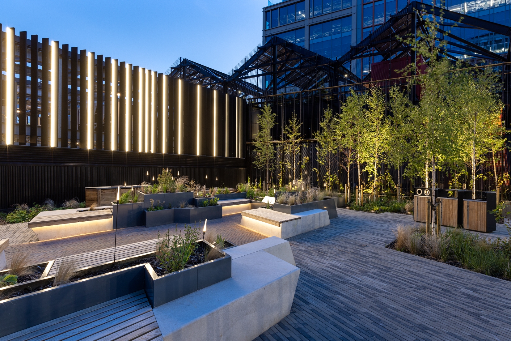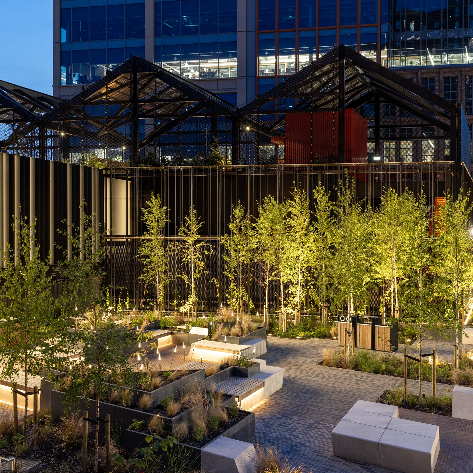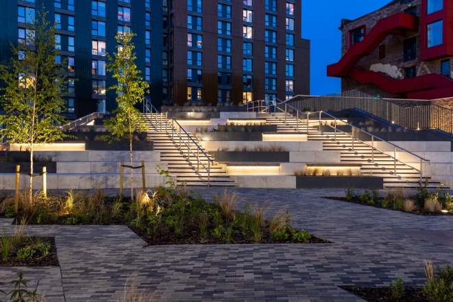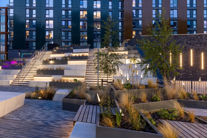Vertical integrated lighting to the energy centre grazes the planters, with spike-mounted feature lighting, creating a well-lit vibrant vista. Low level handrail lighting and integrated wall lights safely illuminate the steps.