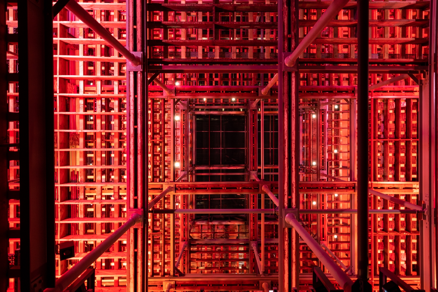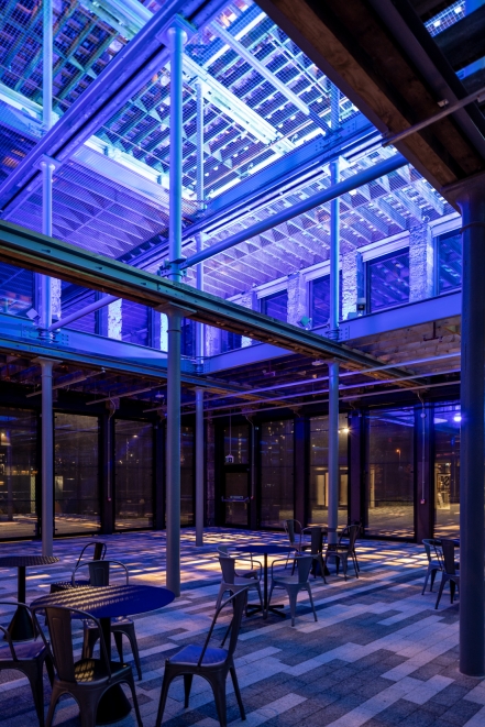 The void is flooded with RBGW light from each level. The shipbuilding narrative links the moving effects to the weather; winds, temperature, general visibility or sky conditions. The RGBW uplighting responds to changes in atmospheric visibility, and the downlighting to changes in wind speed, simulating movement. DMX allows individual control of RGBW floodlighting and narrow beam downlighting. A network interface extracts live data from the internet to drive an immersive installation that offers an ever-changing experience of vacillating visual effects.
