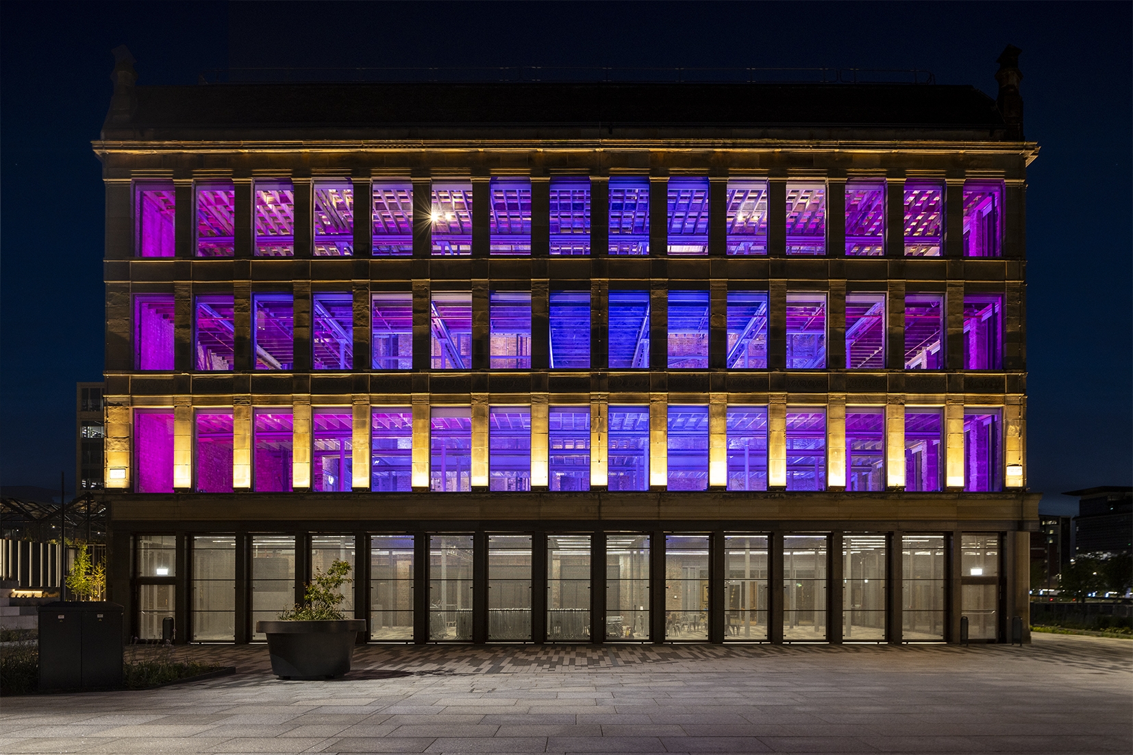 The campus restaurant used 99 reclaimed ship lanterns, salvaged from a broker’s yard, refurbished and refitted with LED lamps. The warehouse was lit purely internally, continuing the shipbuilding narrative and metaphor of a glowing lighthouse/lantern. Light spill was mitigated where possible, mindful of local biodiversity.