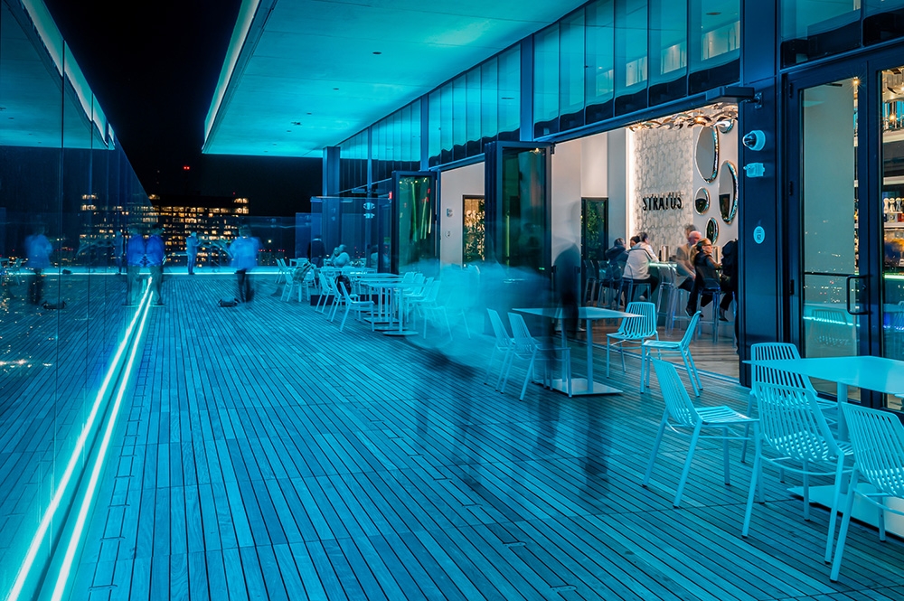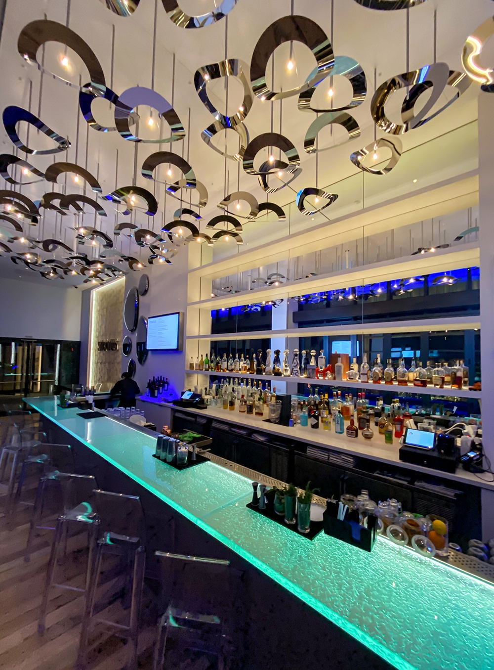 On Floor 51, the Stratus Bar offers a welcoming glow, with indirect lighting enhancing the cast-glass bar top and recessed lighting behind the shelving to minimize reflections.