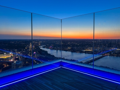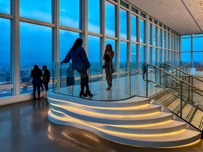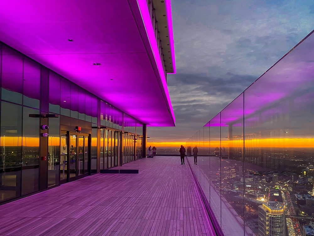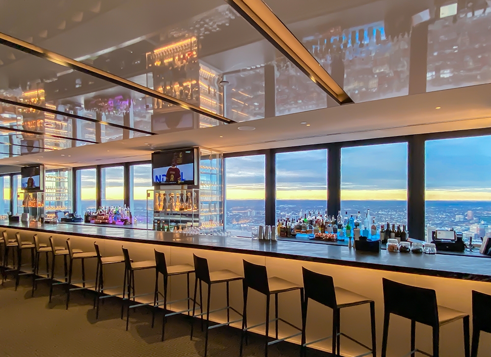 The experience begins with a descent down an escalator or stairwell, where concealed fixtures uplight ceiling graphics. Guests are whisked up 52 floors in an elevator, arriving at a breathtaking panorama of the city.