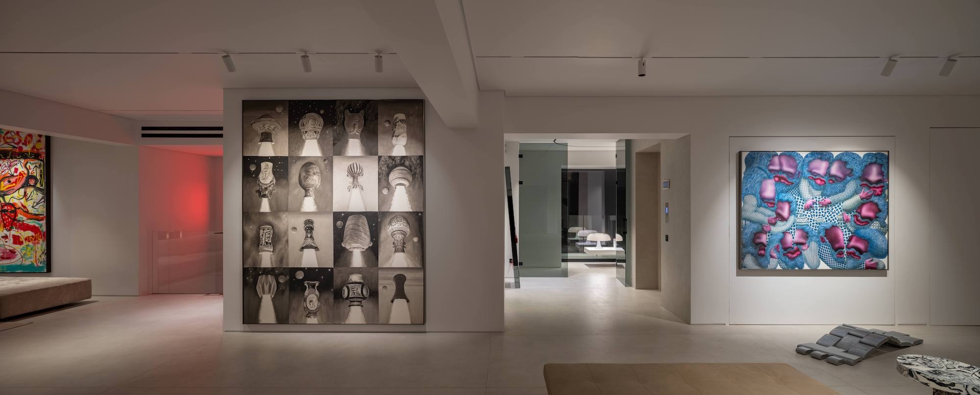 Custom CRI97+, full spectrum, 2 Macadam step LED chips were utilized, in order to enhance the vibrancy of the colorful art pieces. A 3000K color temperature was chosen to not distort the cool colors of the walls, floor ceiling and general ambience and to also provide for a relatively neutral background against which the artworks can stand out.