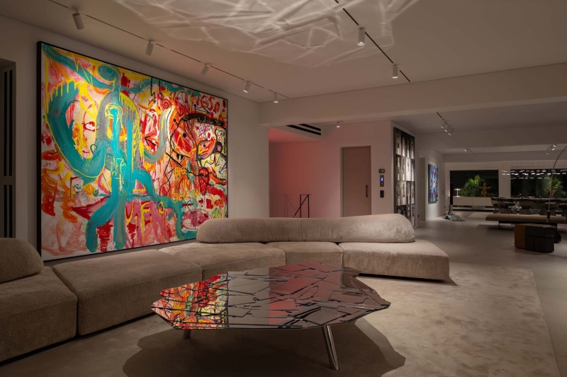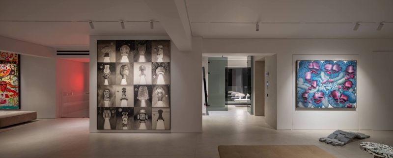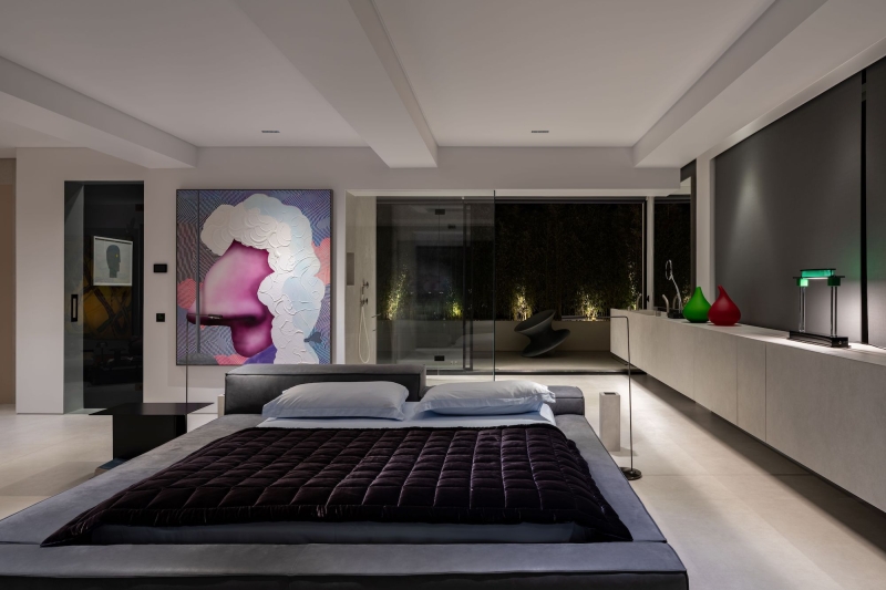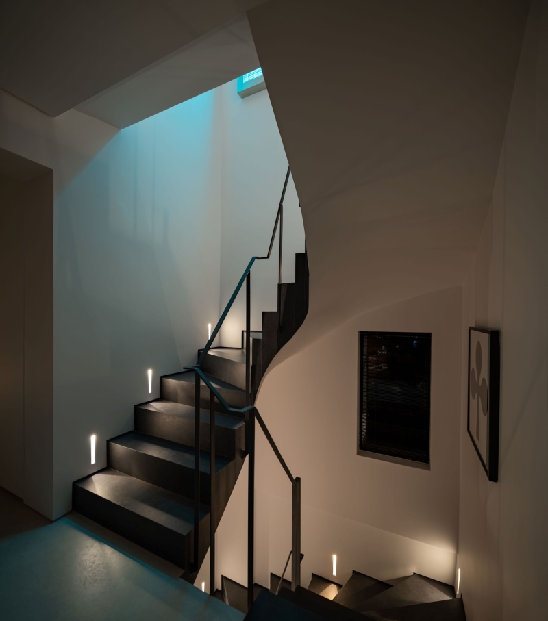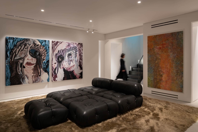 Glare was minimized through the choice of luminaires, beams and accessories and luminance contrasts were programmed on a DALI/KNX system, giving the owner various lighting scenarios, while maintaining the desired ambience and contrasts between the artworks and the interior elements.