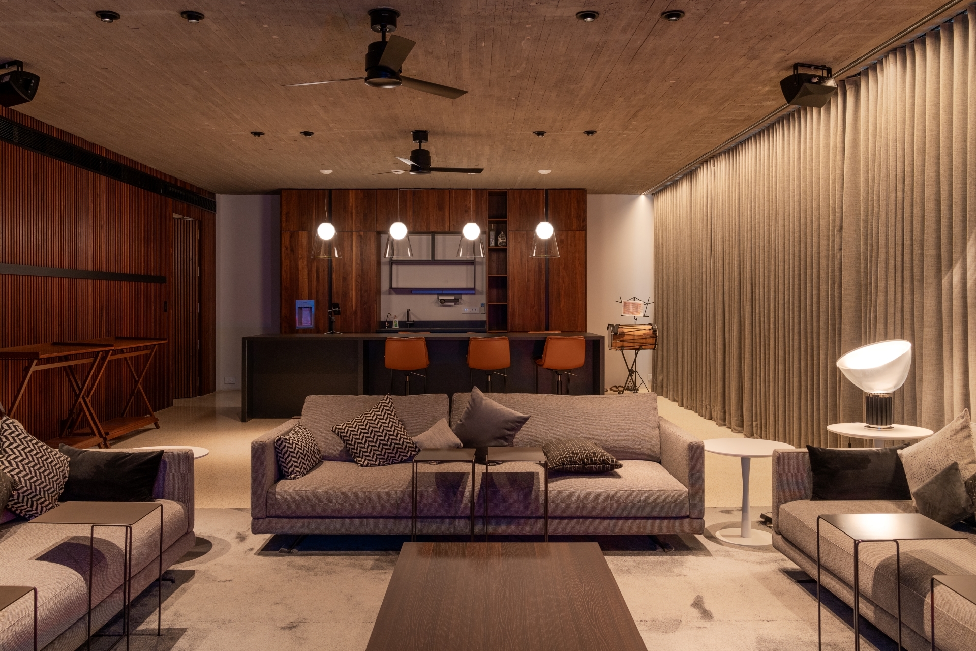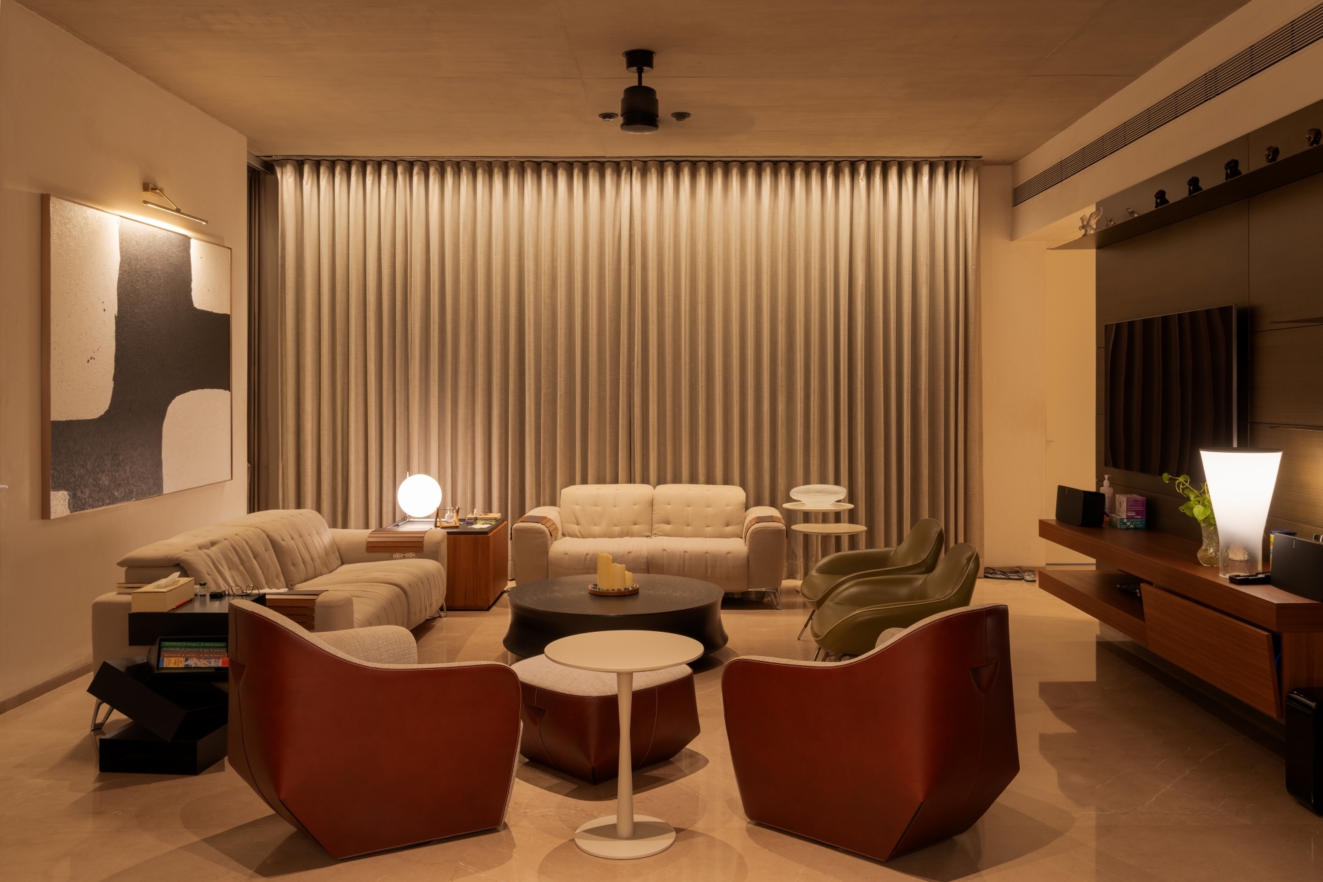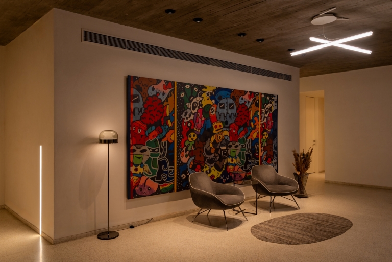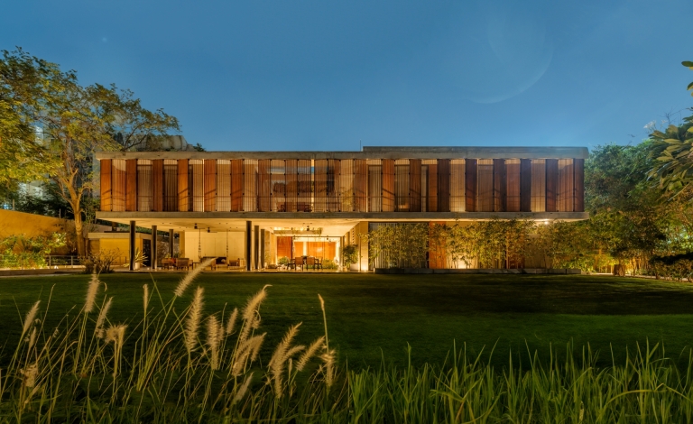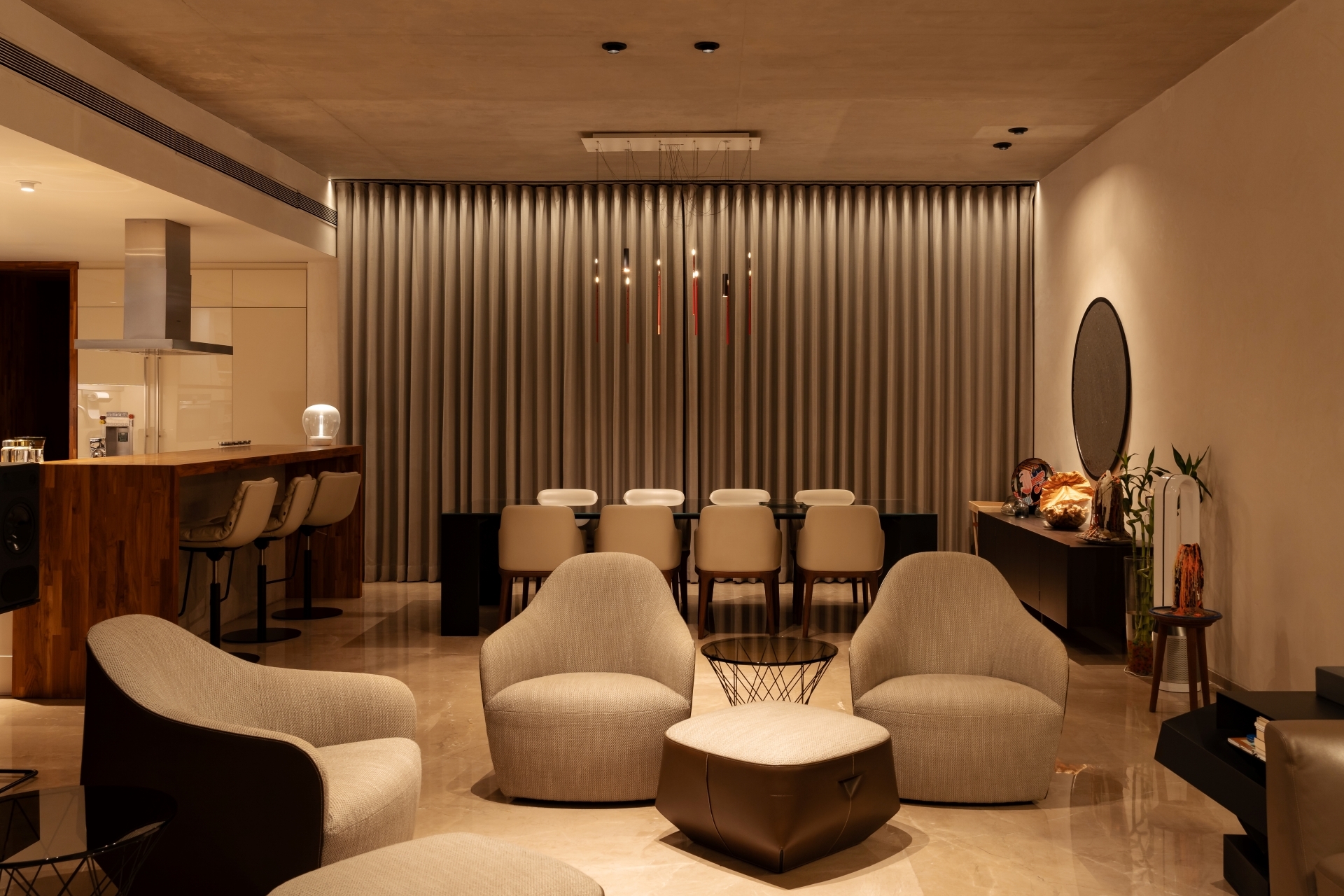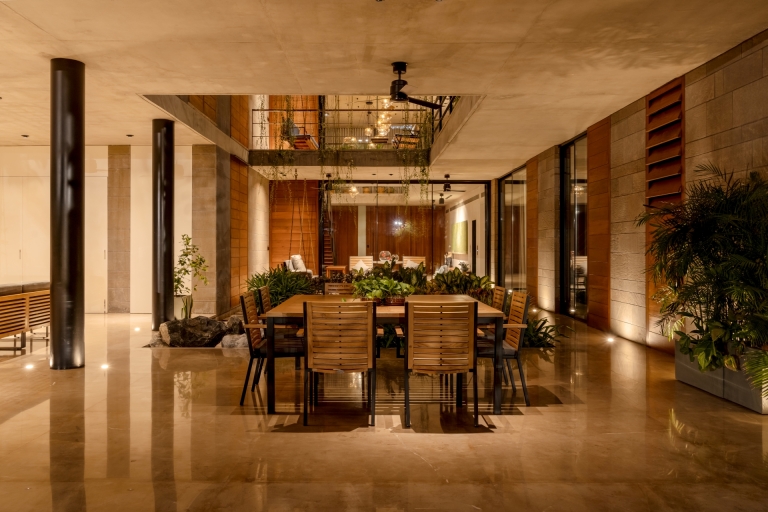 Entry DescriptionResidence of the three generations cherish nature, is designed as a courtyard house using natural materials like timber and exposed reinforced concrete. The exterior features lime-plastered walls, while wooden screens and louvers provide shade, ensuring cool interiors filled with indirect light. Although luxurious, we aimed for an understated, humble space with low light levels and striking contrasts with focuse on designer luminaires. The house is fully automated for energy efficiency, offering comfortable, darker lighting at night. Extensive discussions with family members informed the design, ensuring each generation's lifestyle and lighting needs were met. The lighting concept harmonizes with natural daylight, using electric circuits that balance indoor brightness, with warm 2700K lighting in living areas and RGBW lights in entertainment zones. Ceiling lights align with the concrete slab's structure, while the strategy includes adjustable downlights, curtain grazers for accents, and decorative fixtures to complement the furniture. A bespoke glass luminaire in the foyer enhances the welcoming atmosphere. Bedrooms feature low-level step lights and bedside lamps for indirect illumination. The veranda, covered with wooden screens, is subtly lit by indirect light, highlighting the timber's beauty. The entertainment zone is equipped with layered lighting and RGBW lights.