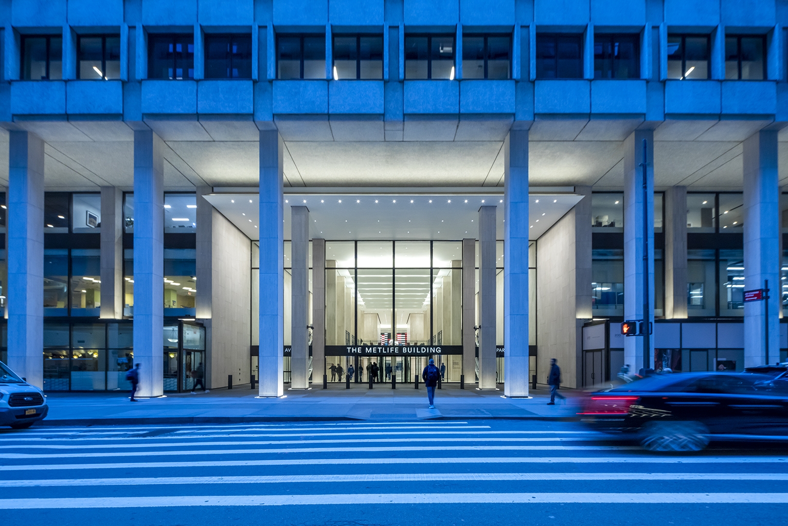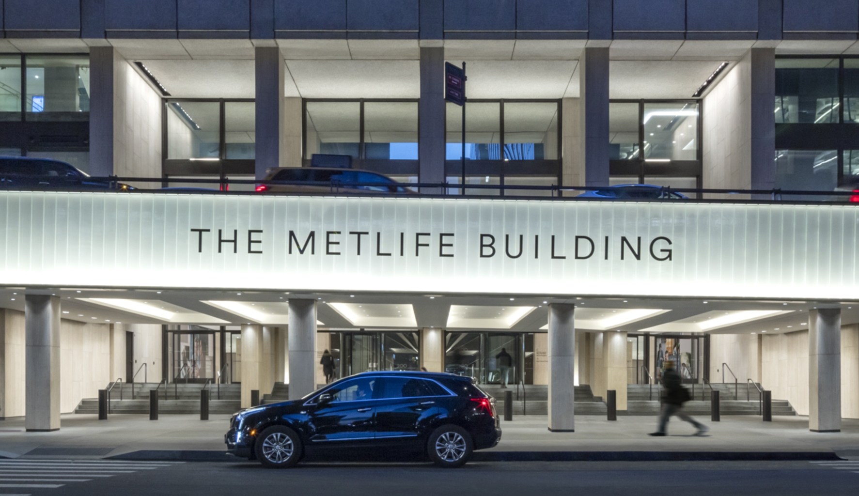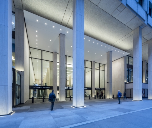 At Vanderbilt Avenue, an elevated roadway had created a dark single-height zone in front of the double-height lobby. Lighting transformed this entrance by washing architectural surfaces and cladding the roadway parapet with luminous channel glass.
