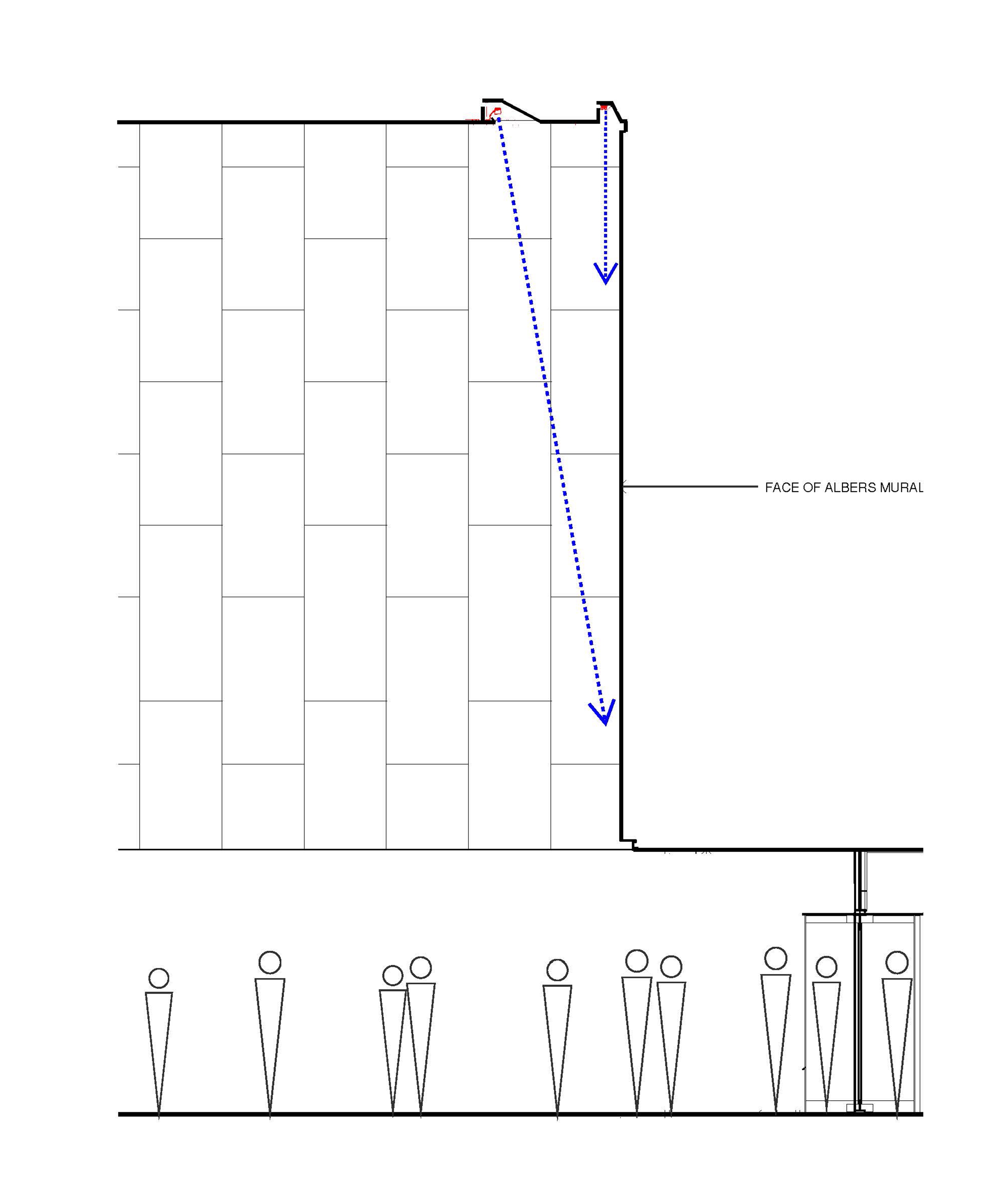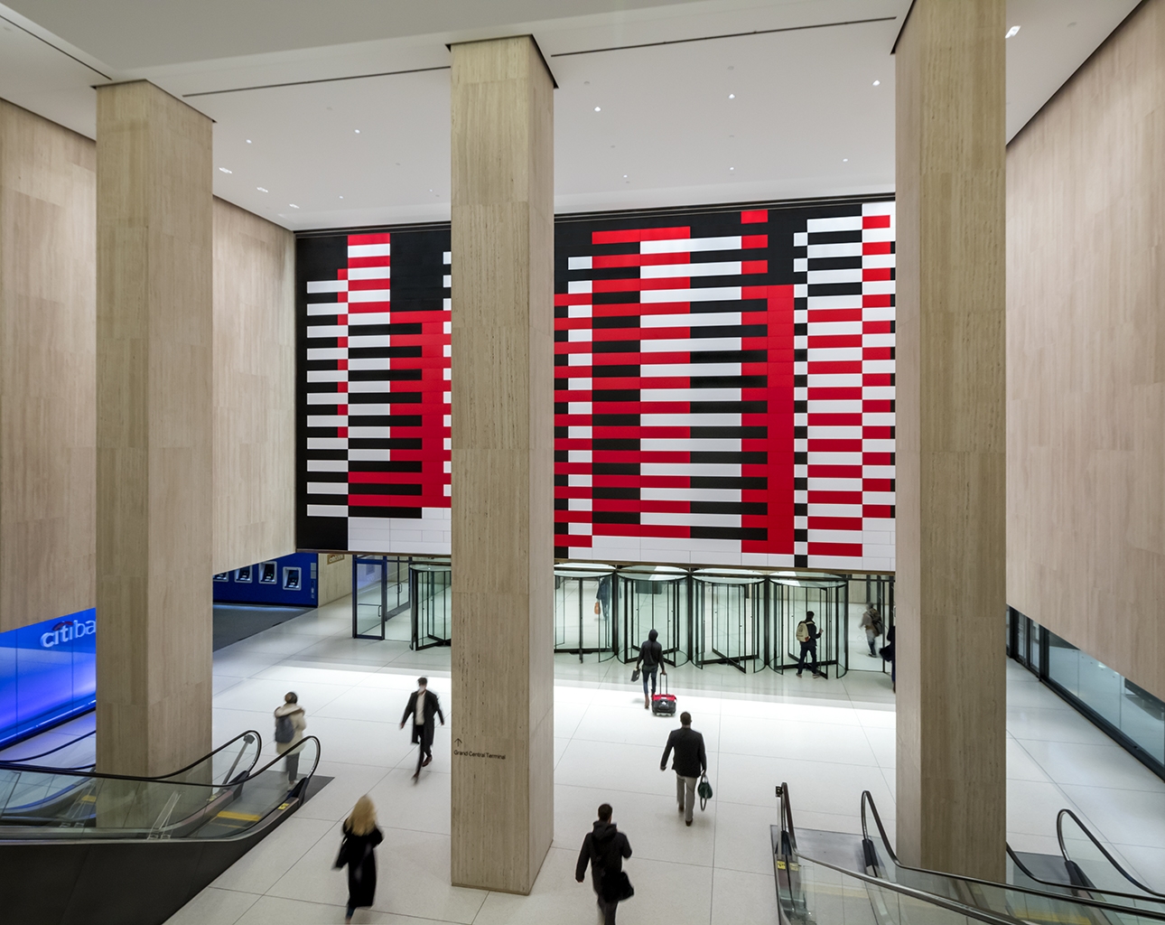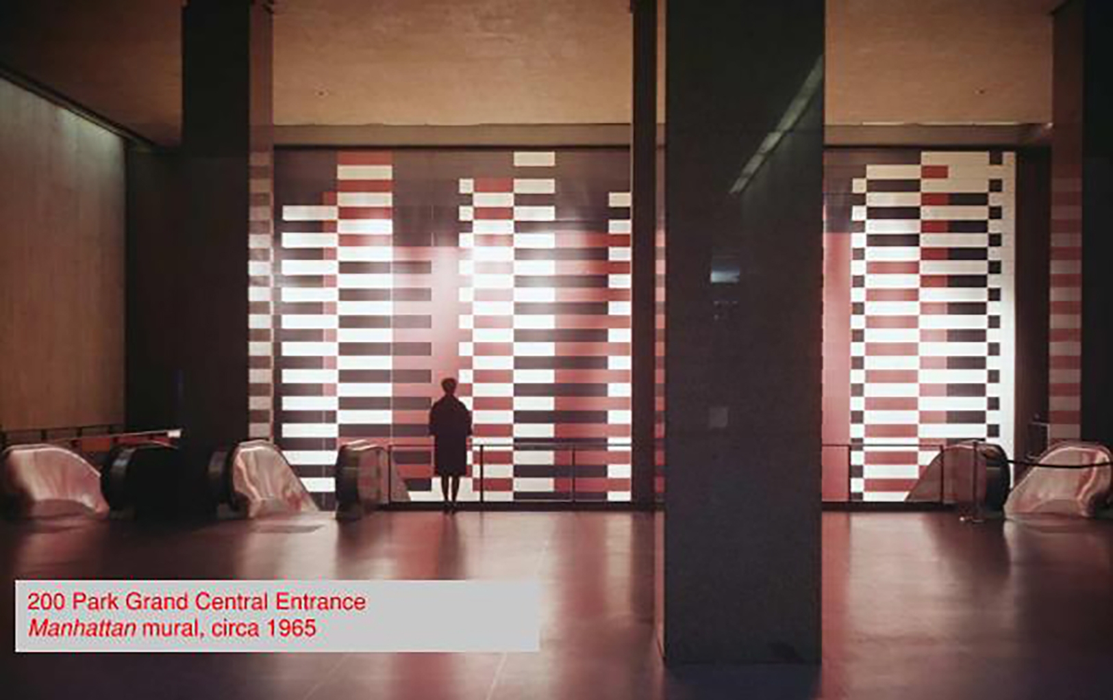 In a prior renovation of the Grand Central entrance, Josef Albers’ expansive mural Manhattan had been removed and destroyed. Now meticulously recreated, all light sources are concealed, and no reflections are visible from typical viewing angles.