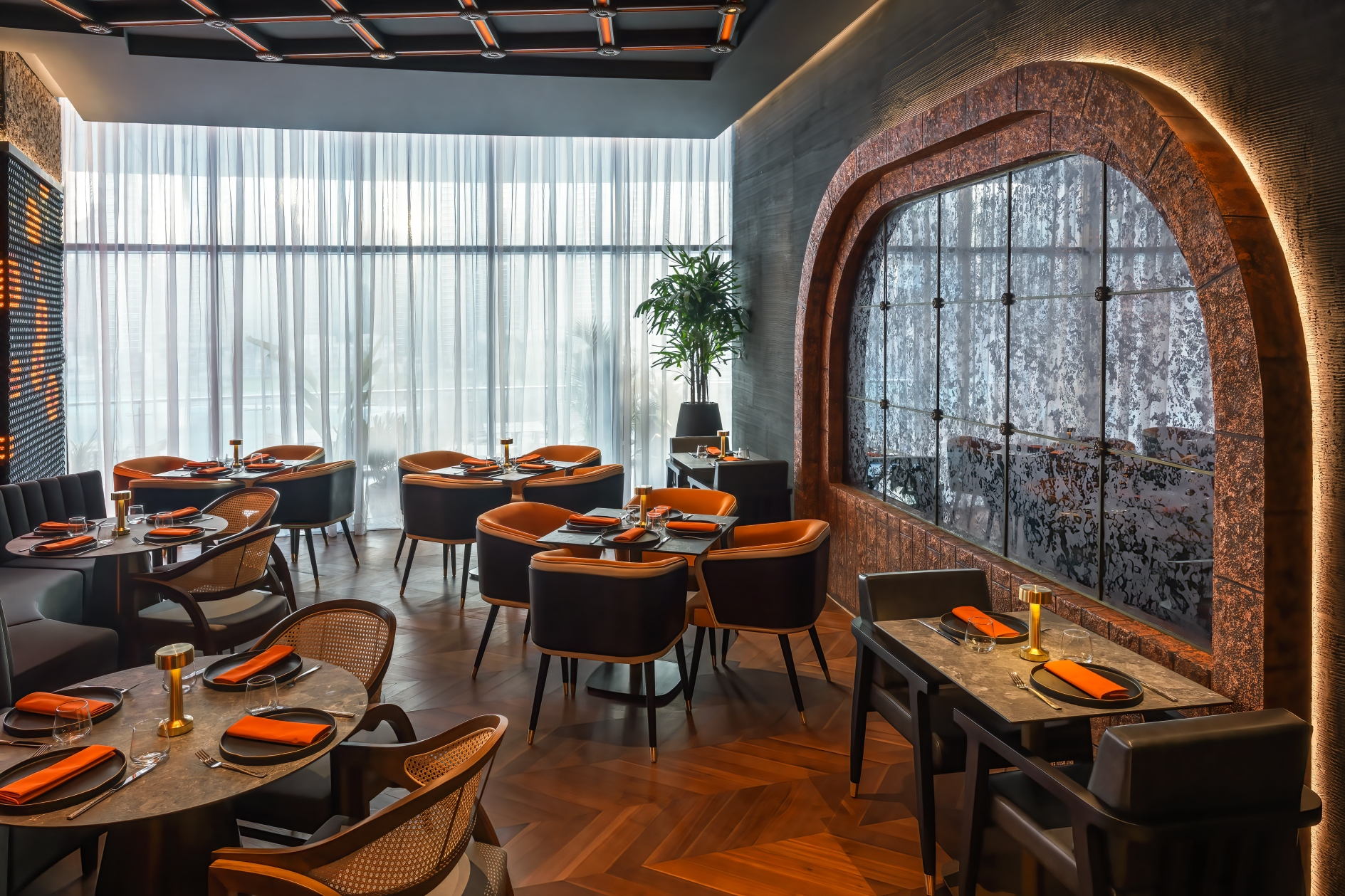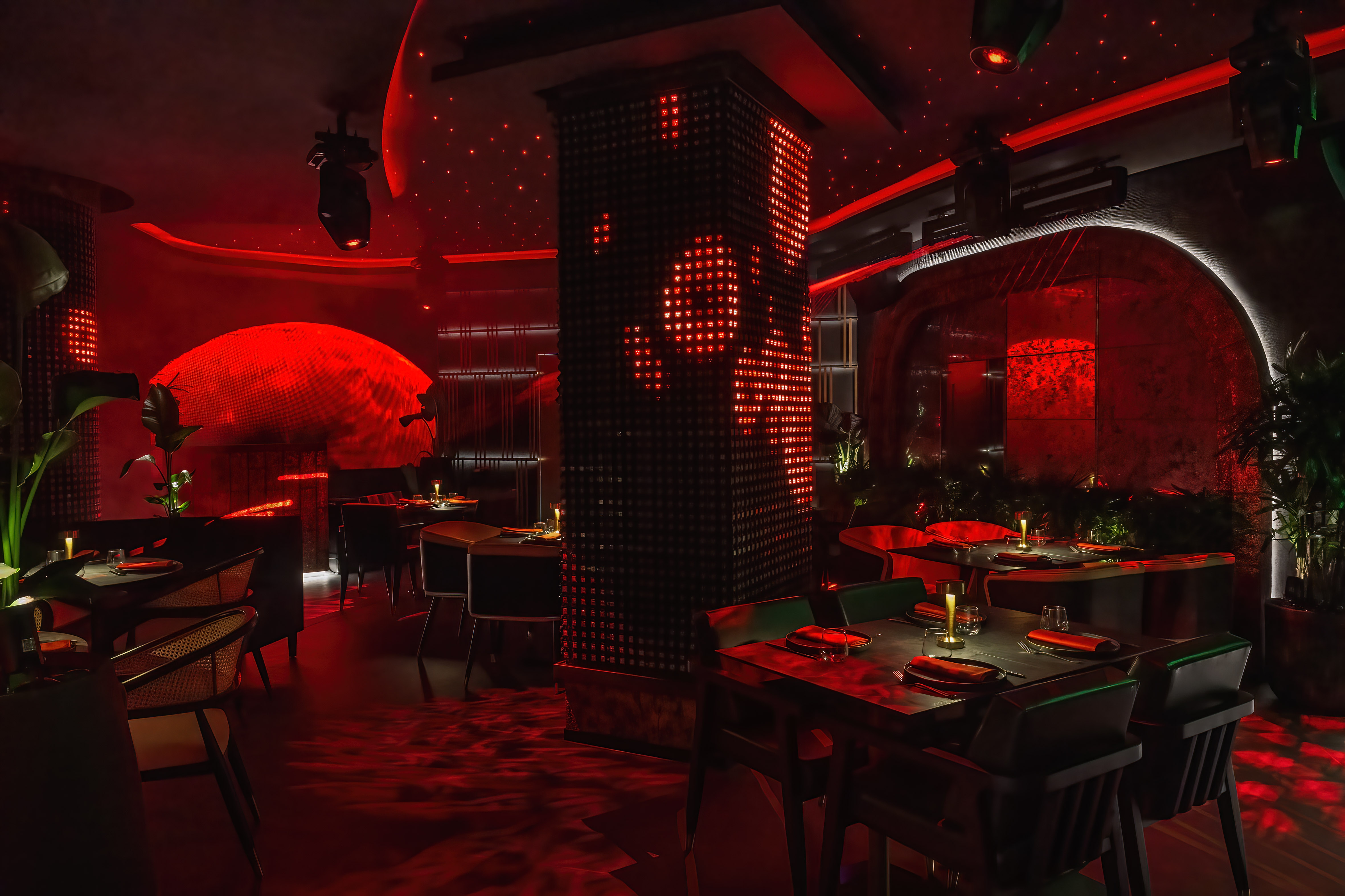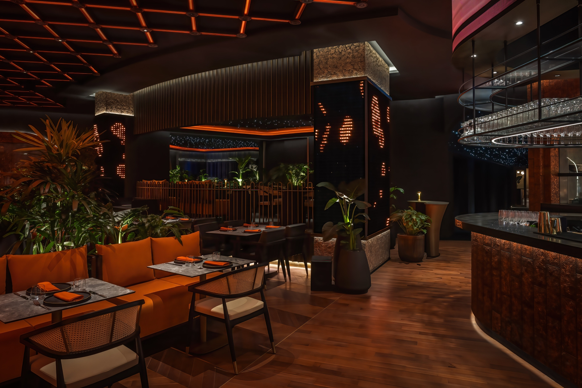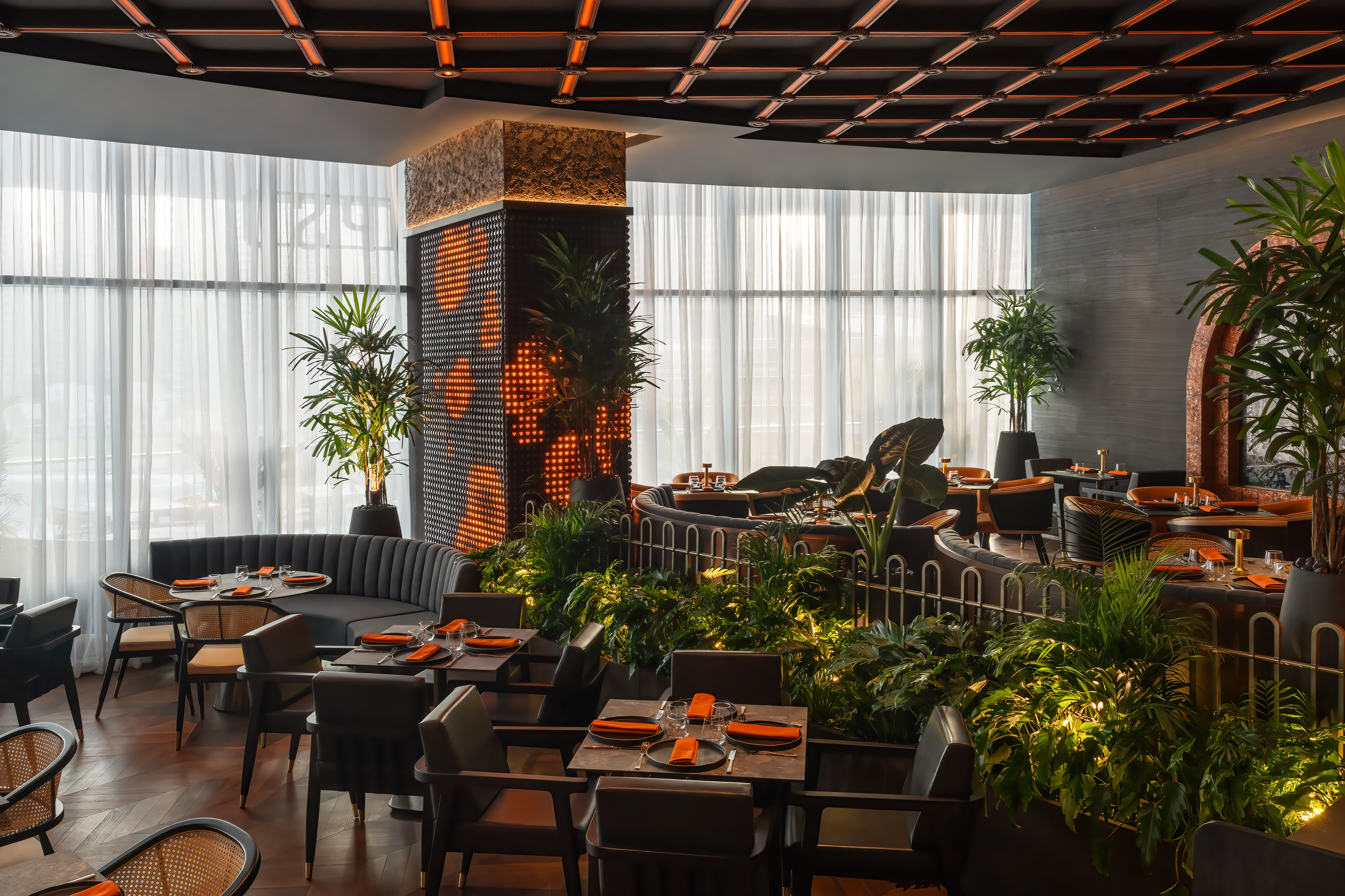 In the restaurant, indirect illumination creates a subtle atmospheric glow to complement the interactive screens. A lattice-style ceiling is the main focal point and features integrated RGBW LEDs, which form a pulsating effect across the ceiling.