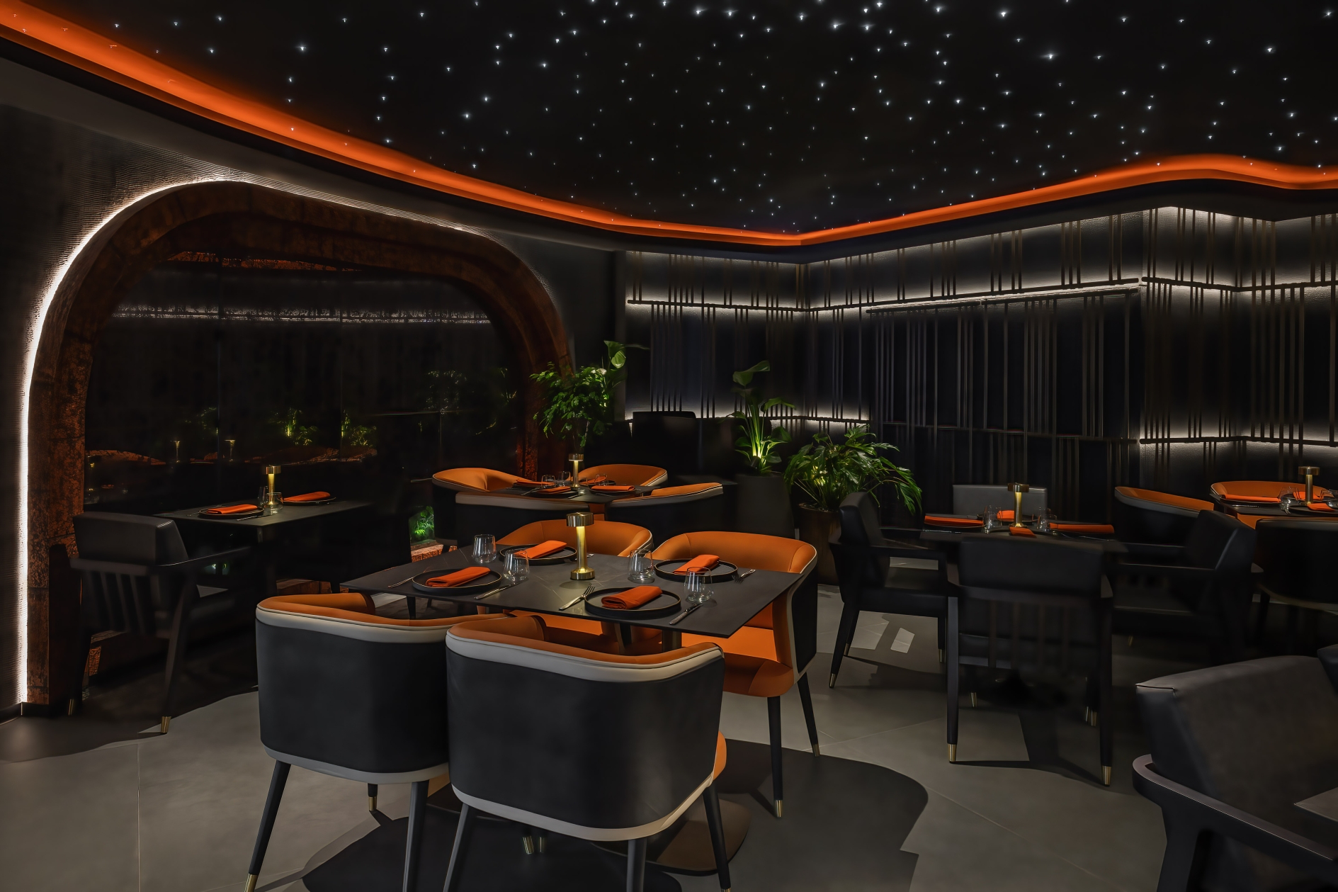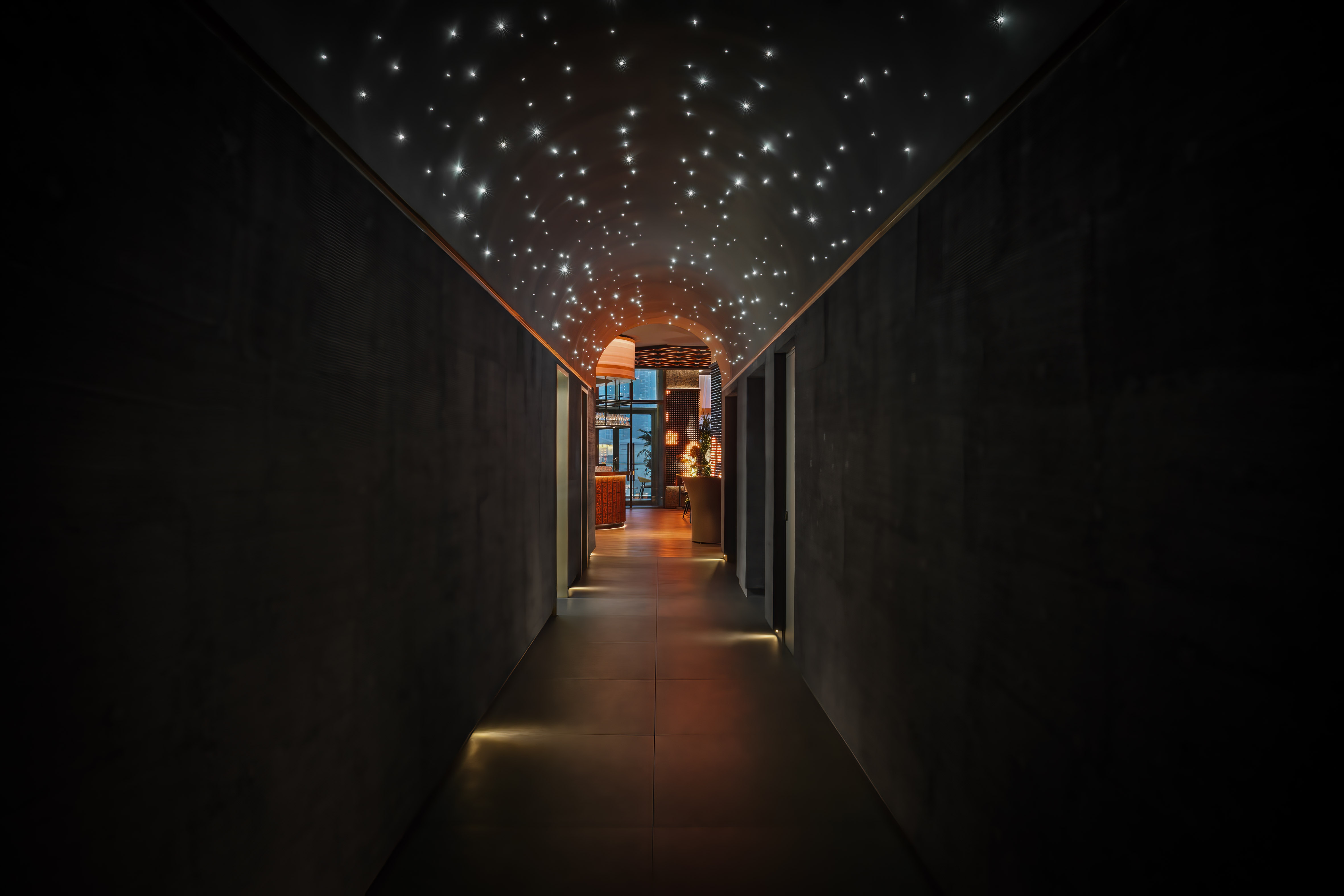 Guests access Opso via an immersive walkway featuring a starlit fibre optic ceiling. The ceiling is motion activated and creates an energetic play of light that pulls guests through to the bar.