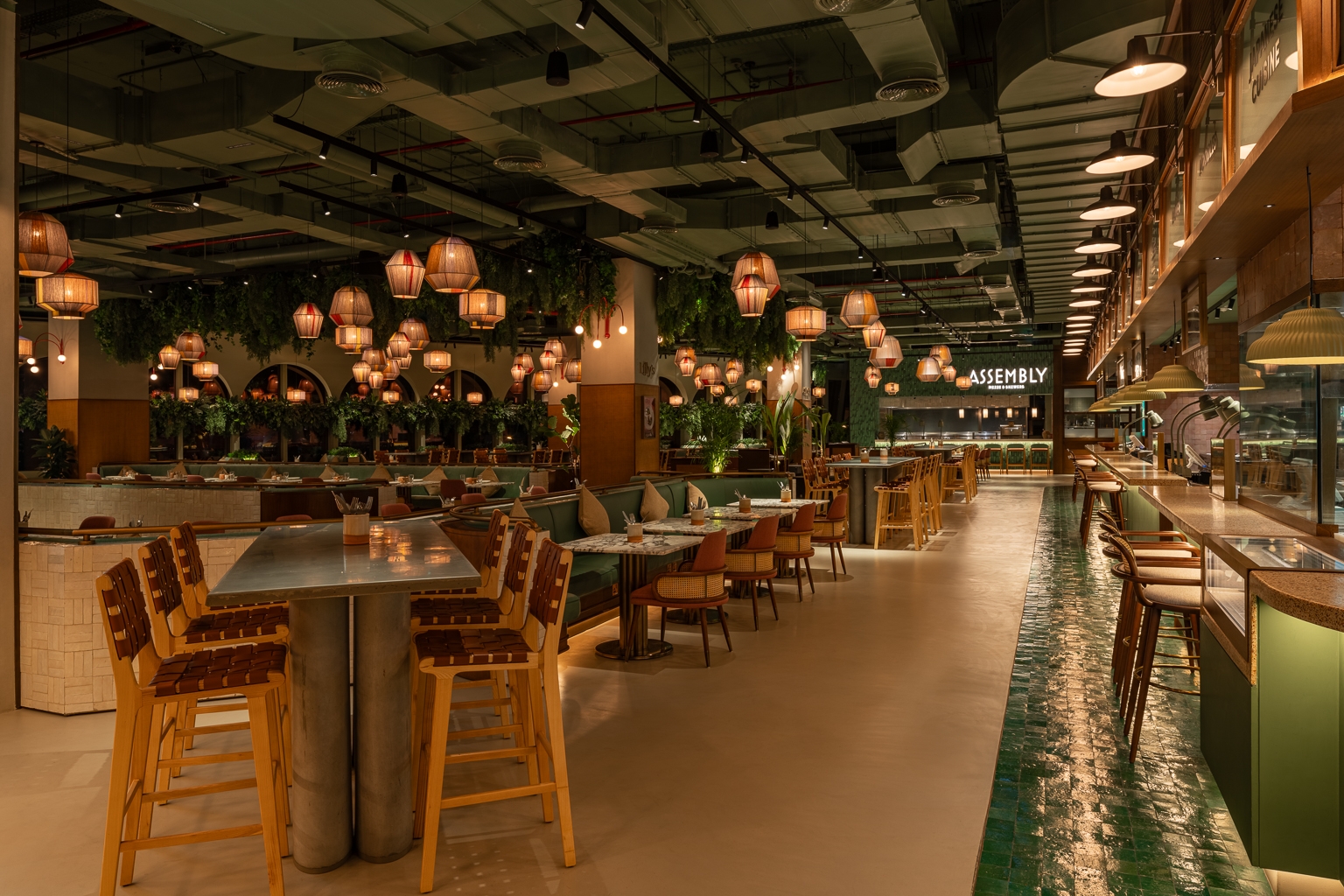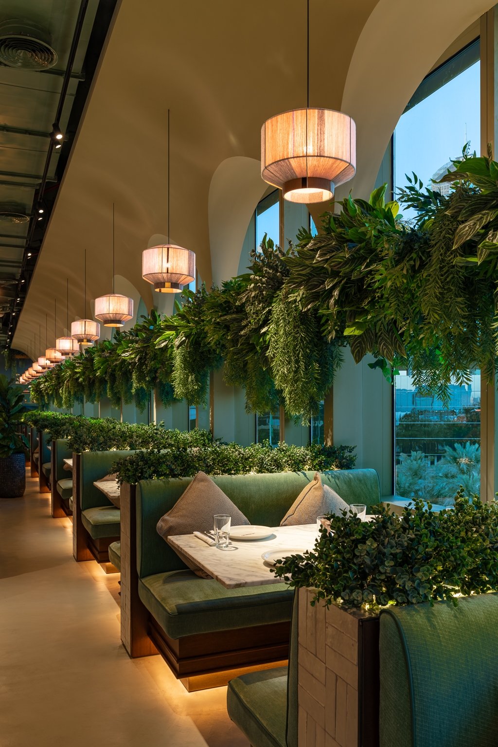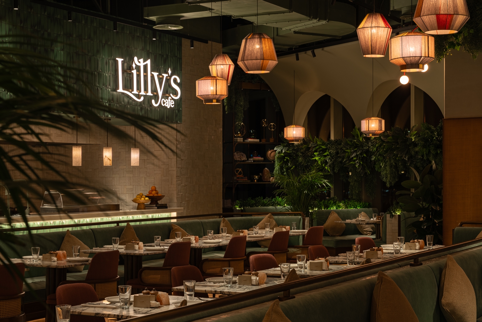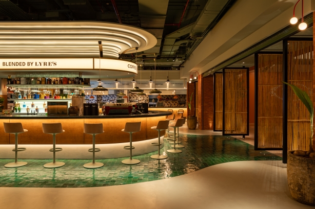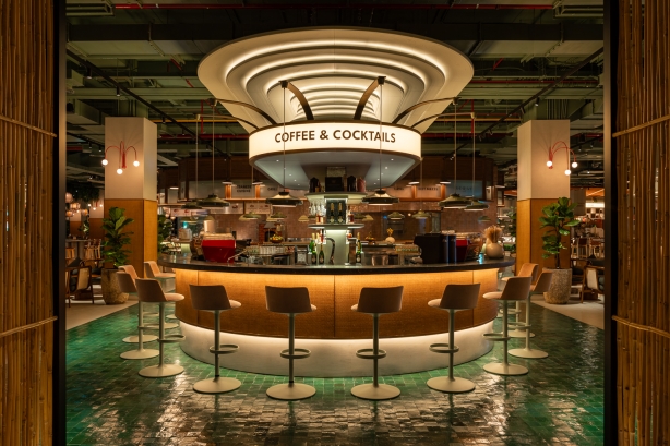 Linear lighting is installed around the canopy of the coffee counter, which offers a continuous ray of light, creating an impressive and stunning scene.