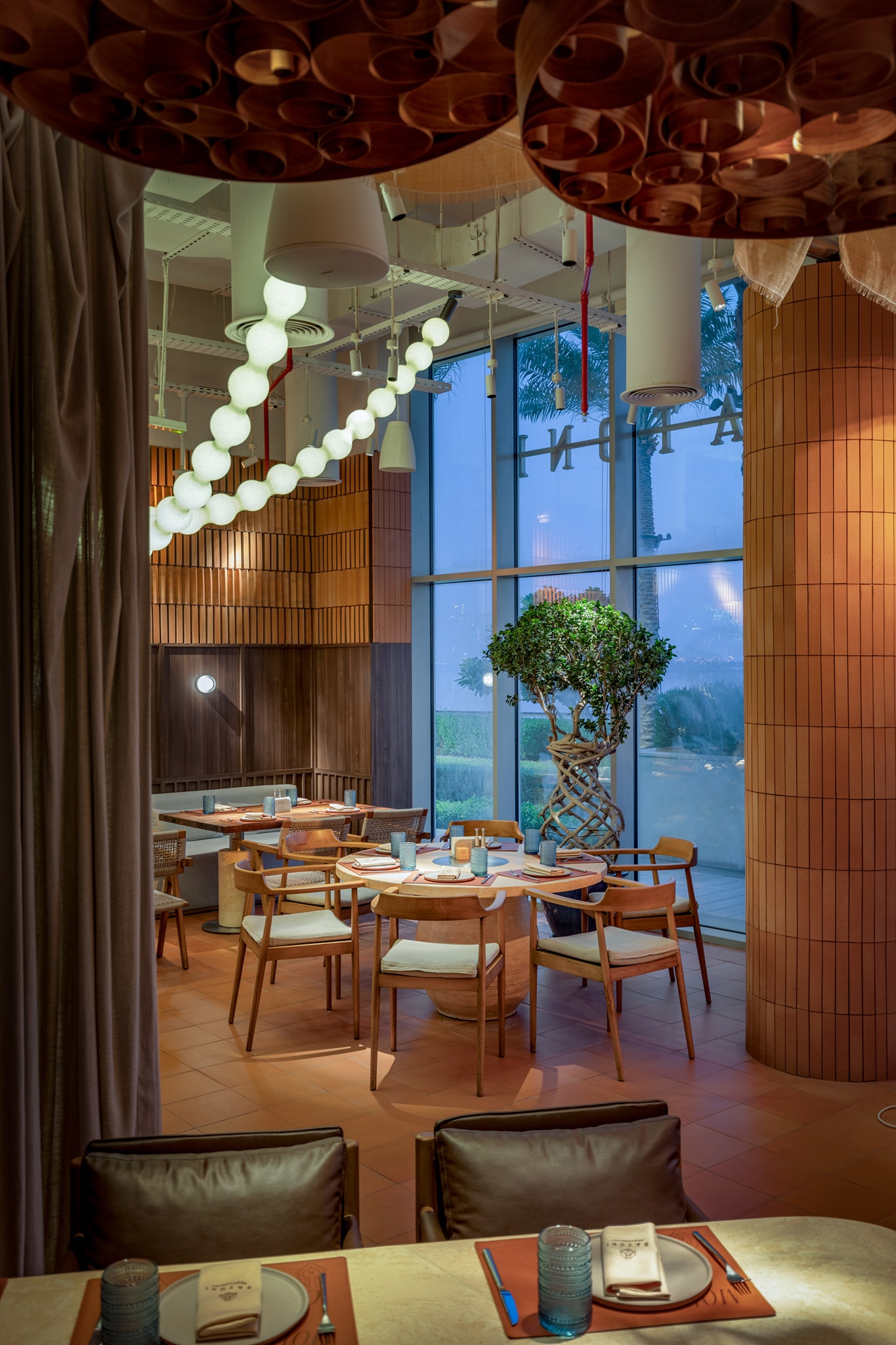 Custom-designed and manufactured light fixtures were developed for this project, distinguished by their high quality and aesthetic appeal. These fixtures not only align with the design concept but also enhance the overall lighting experience, providing optimal brightness and light distribution throughout the restaurant.