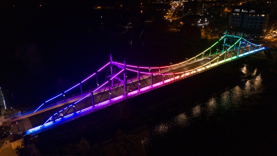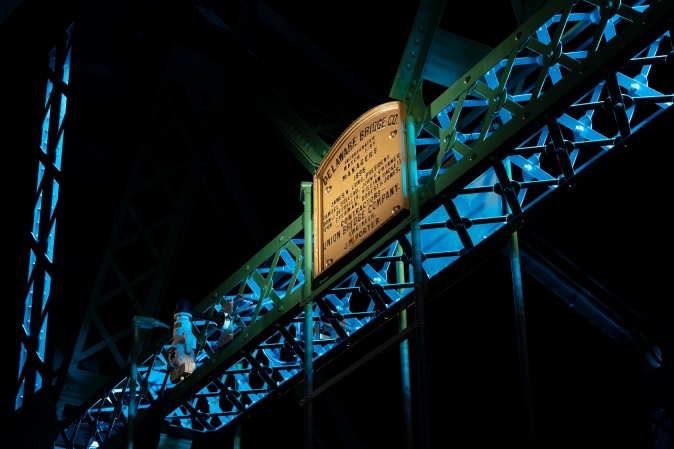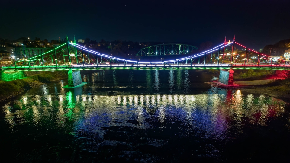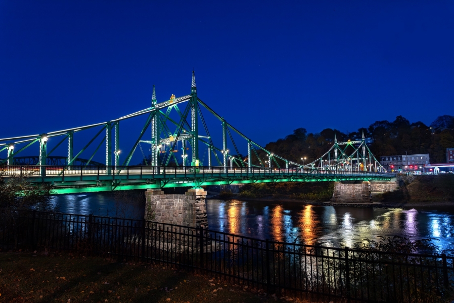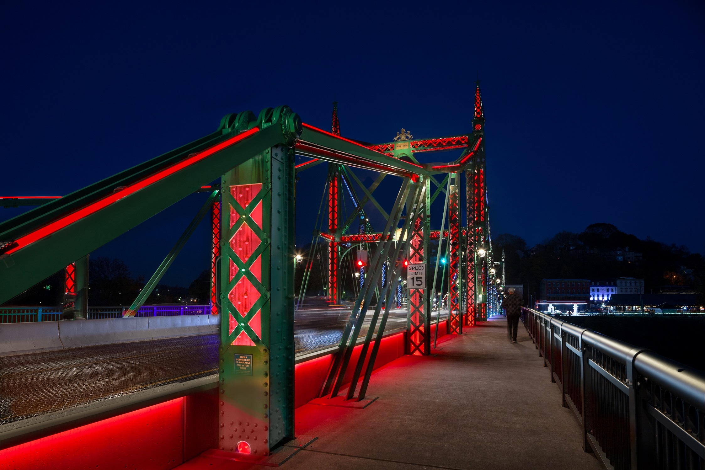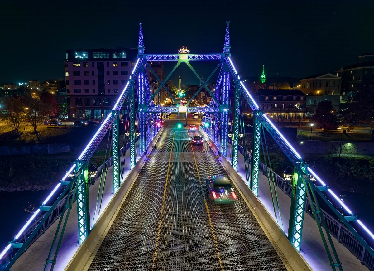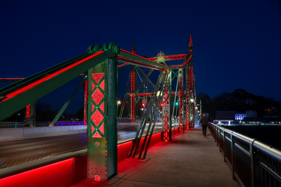 Replacing 20-year old legacy lighting, this comprehensive new design showcases a bridge spanning two states and 127 years of civic pride. One of only two versions in the world, this unique structure required lighting to be historically sensitive while establishing a precedent for its owner. Cantilevered but designed to mimic suspension, the 550-foot bridge is a national historic civic engineering landmark. Virtually all surfaces were washed or outlined, meeting with “resounding public approval” according to a local publication.