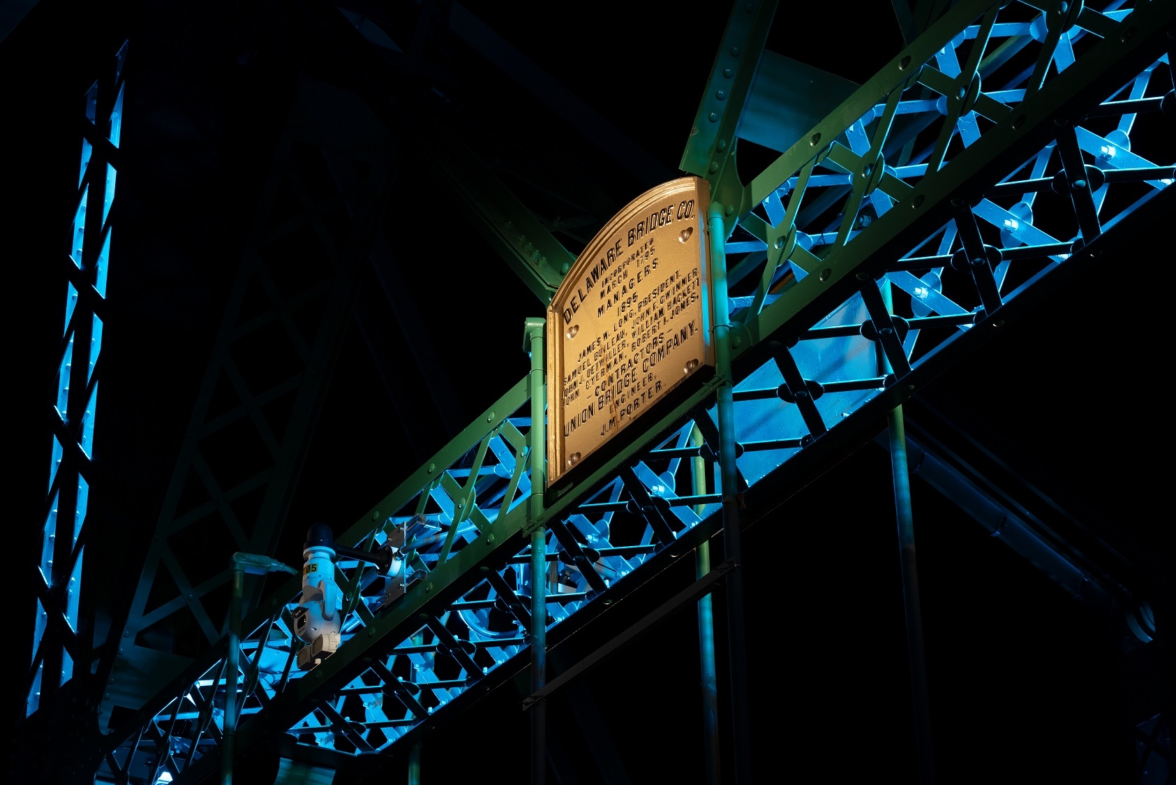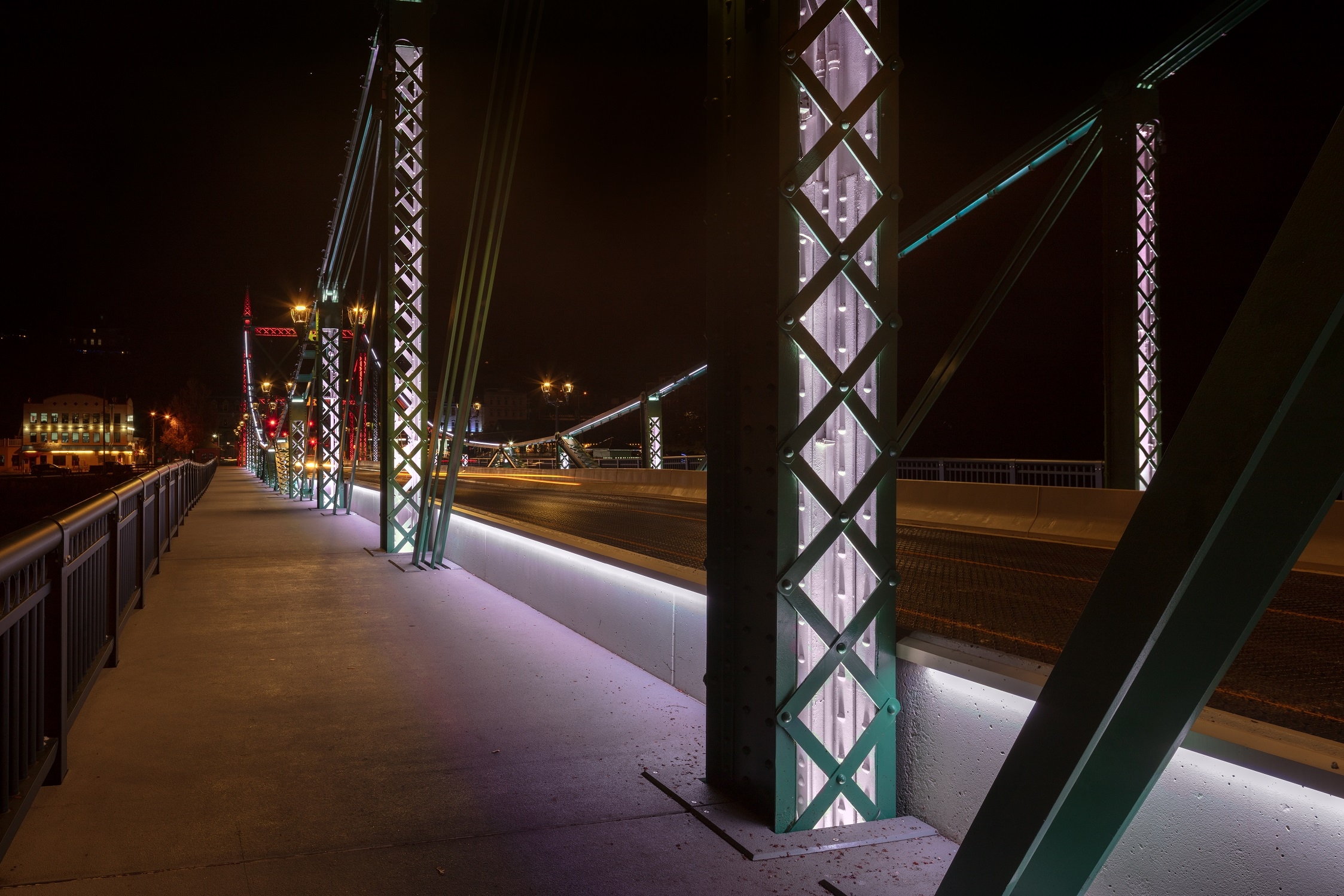 Internally illuminated trusses accentuate the bridge’s lacy structure, seen adjacent to continuous linear RGBW cove lighting. A curfew setting dims all but roadway and walkway lighting after midnight. Historic piers are gently washed with cross-aimed floodlights, dimmed in response to marine and avian neighbors. An “every night white” scene that reveals the bridge’s signature green paint runs most evenings. Community organizations can request temporary color schemes via a dedicated website.