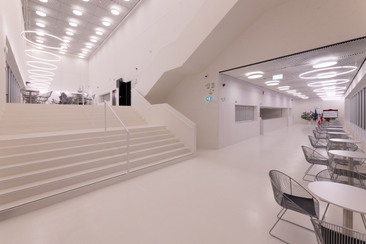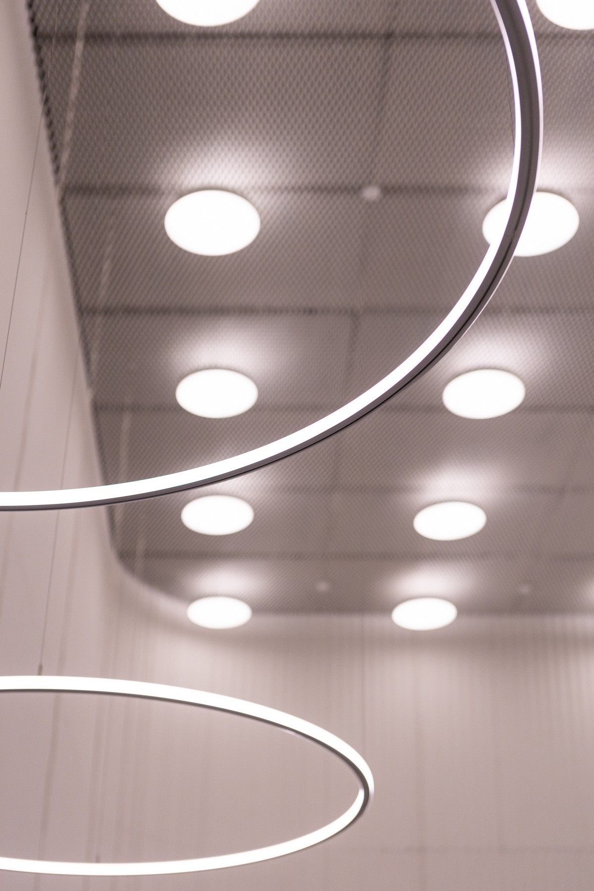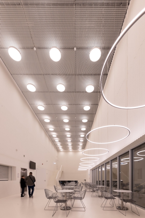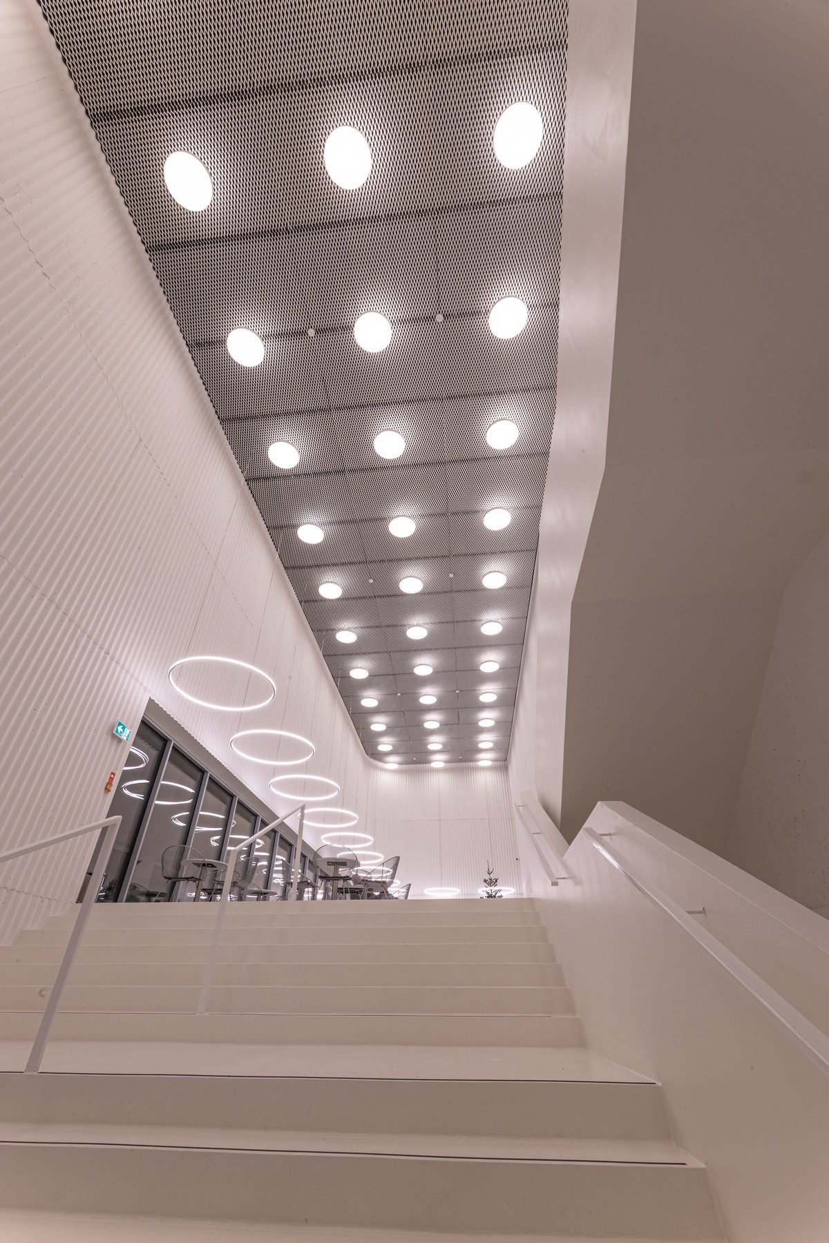 Entry DescriptionThe synthetic and strictly contemporary volume with slightly rounded corners and few but large glazings at the ground floor level has a very expressive façade. The corrugated metal cladding acts like a mirror, reflecting the light - both during the day and the city lights at night. The minimalist, white interiors called for an equally minimalist handling of light, and the form of a luminous circle - like a theme in a piece of music - runs through the building in many scenes.