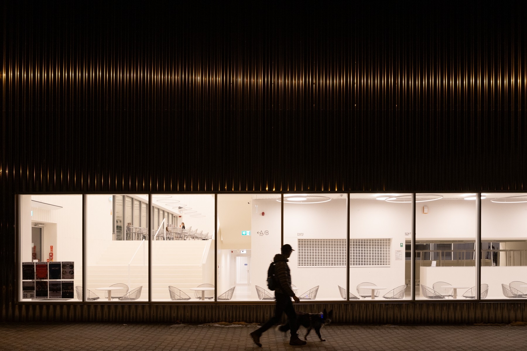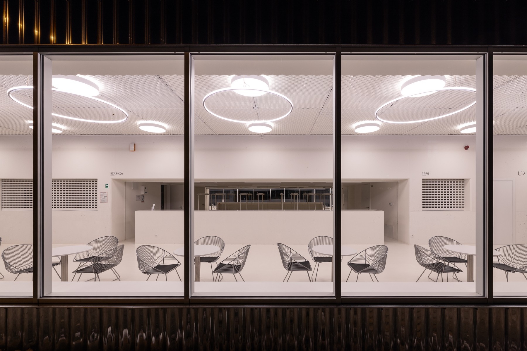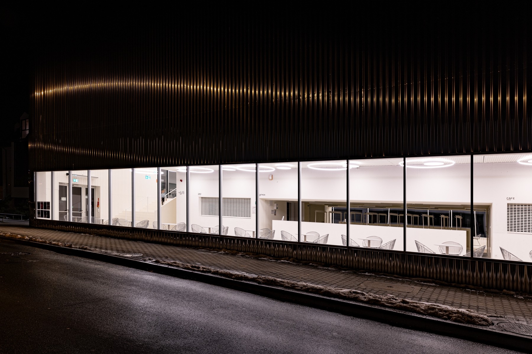 Entry DescriptionThe synthetic and strictly contemporary volume with slightly rounded corners and few but large glazings at the ground floor level has a very expressive façade. The corrugated metal cladding acts like a mirror, reflecting the light - both during the day and the city lights at night. The minimalist, white interiors called for an equally minimalist handling of light, and the form of a luminous circle - like a theme in a piece of music - runs through the building in many scenes.