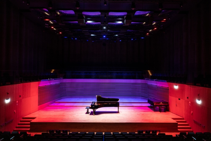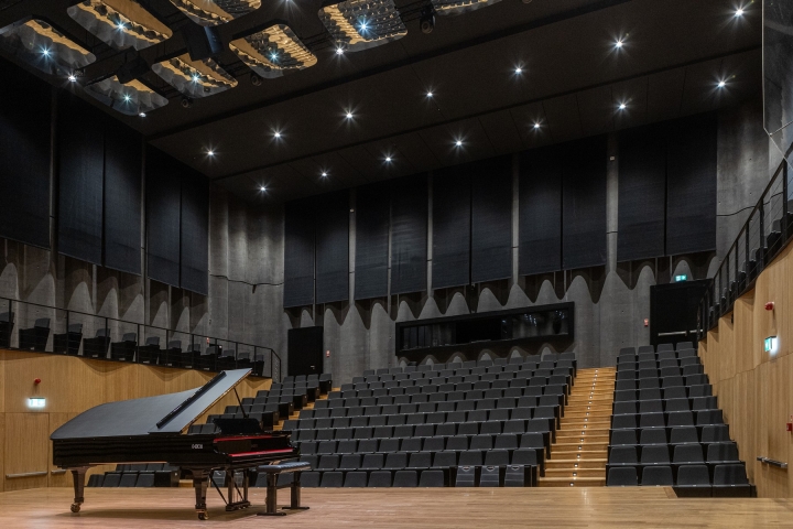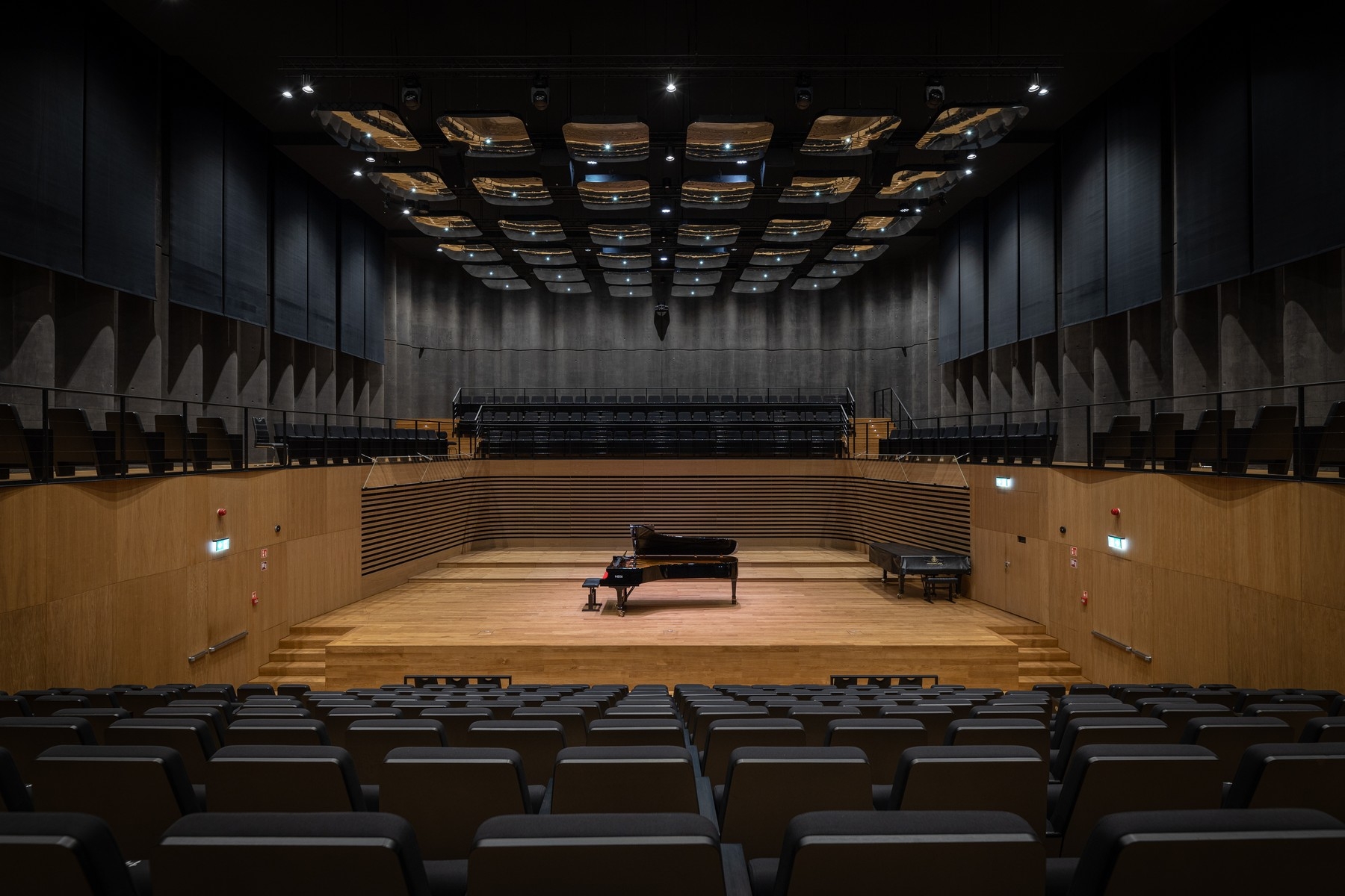 The interior of the concert hall contrasts with the other spaces of the building. Black and the warm colour of wood dominate here. It is like a black Yin surrounded by a white Yang - symbolising contrast and balance, whether in music, nature or life.