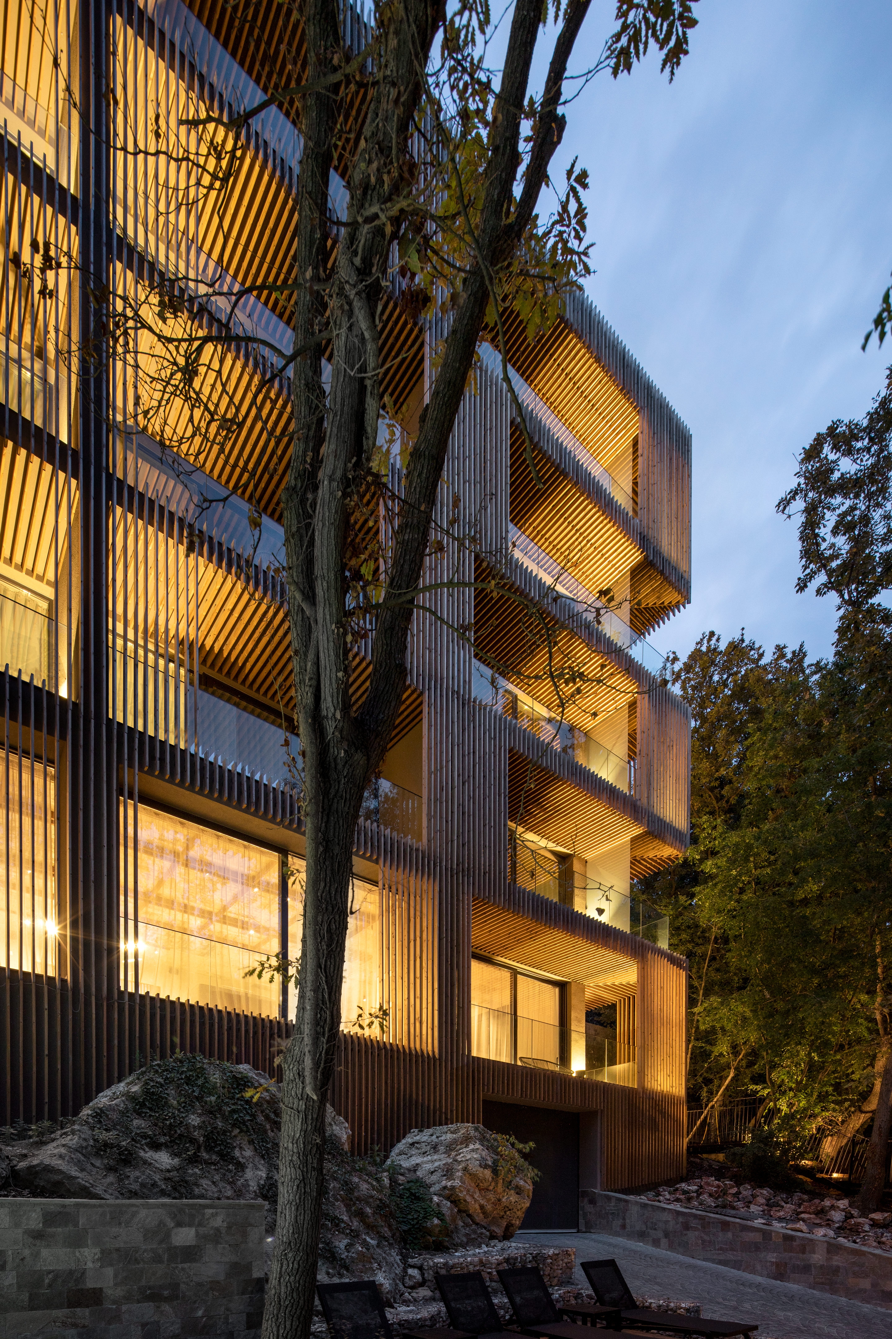 Entry DescriptionUmani Hotel is located in close proximity to Golden Sands Nature Park near Varna and looks over directly towards the Black Sea. The plot of land is significantly sloped from west to east, surrounded by a pristine landscape with valuable tree species and natural rock formations. The concept of the project is to create a contextual building that fits easily into the natural environment, that looks light, airy and unobtrusive, as well as to work together with all elements of the surroundings without being dominant.