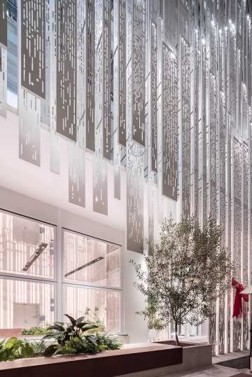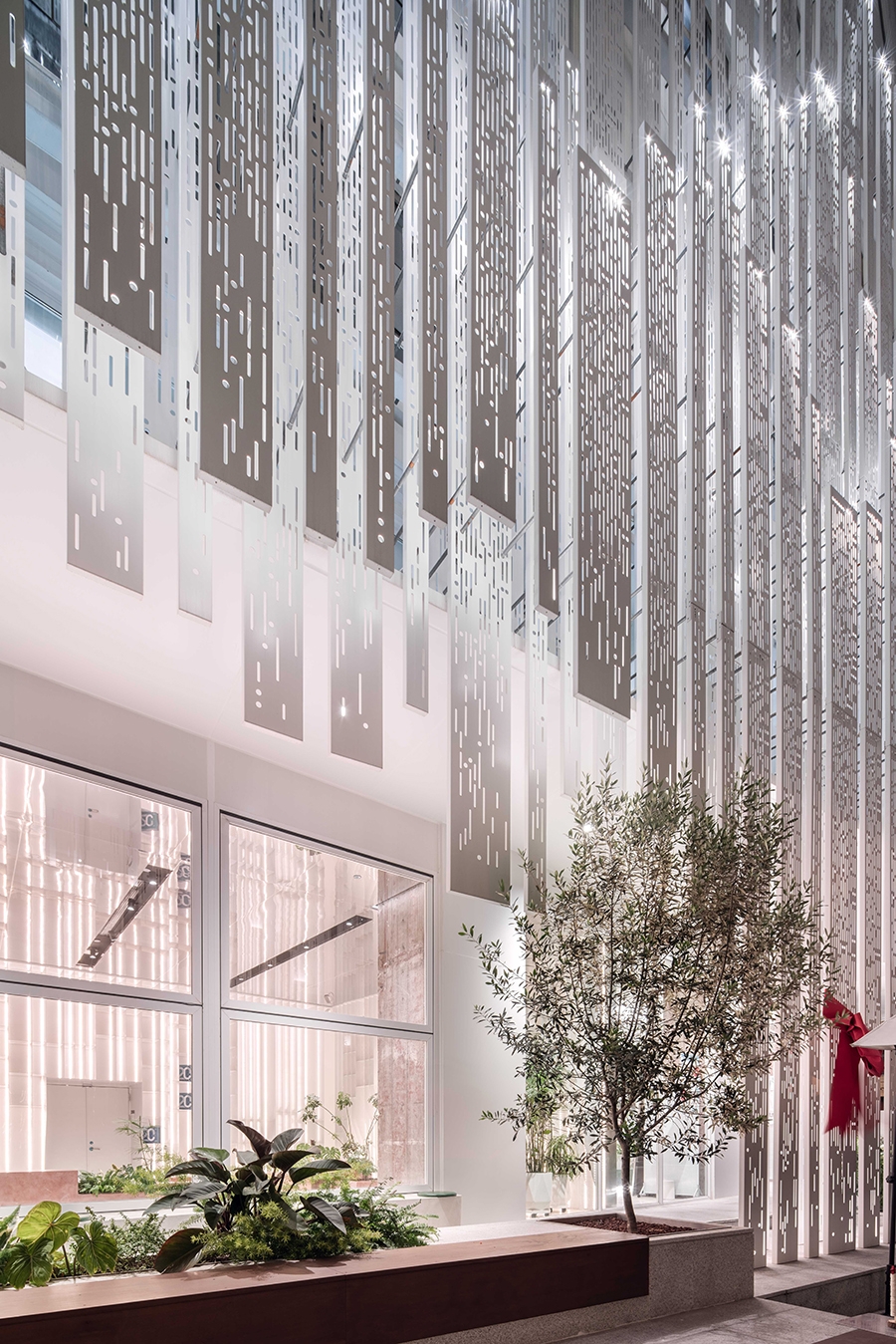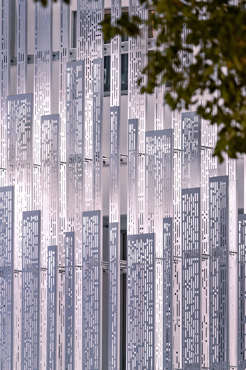 In the exterior design, Yu Ting used a perforated texture representing binary code across the entire facade, creating a "digital stream and electronic rain" effect with a rhythm reminiscent of a symphony. Light emanates through the perforations like shimmering auroras, while the cascading metal bookshelves form a "waterfall of knowledge." In the lighting design, the clever use of light contrast techniques achieves a play of light and shadow, creating a unique "rain of light."