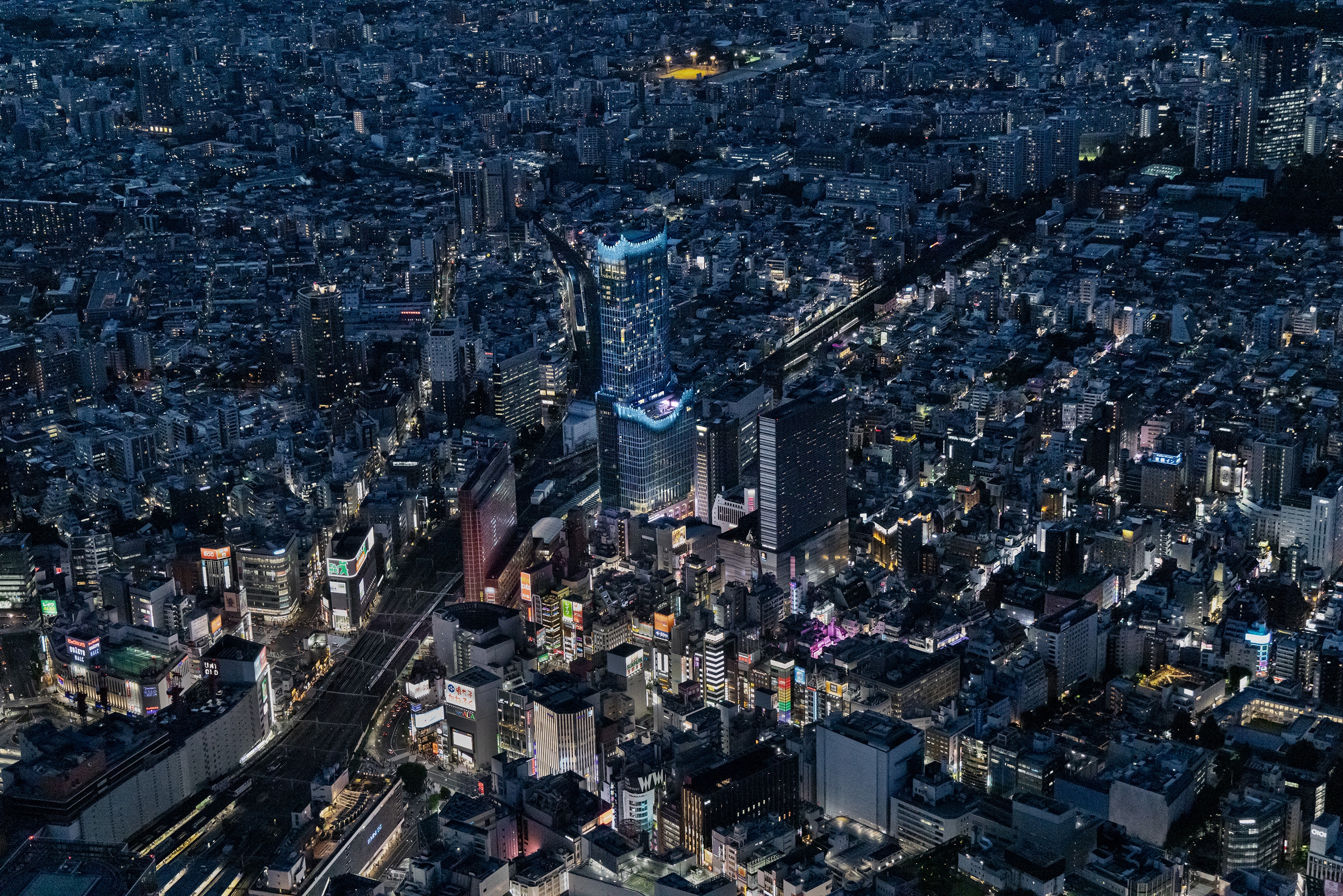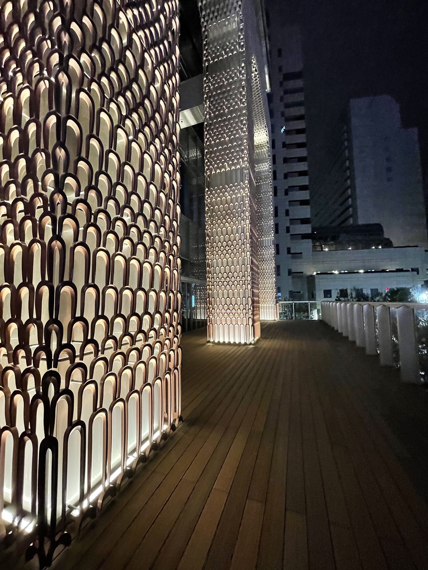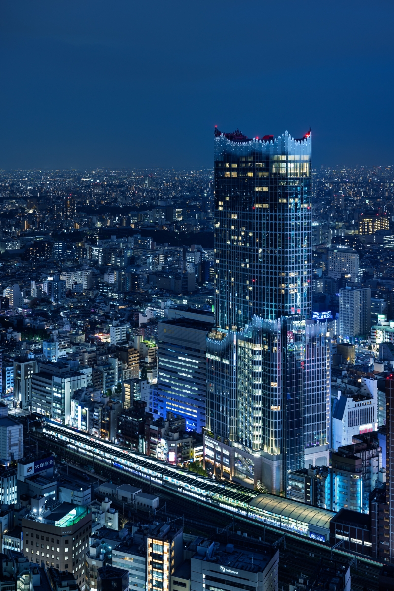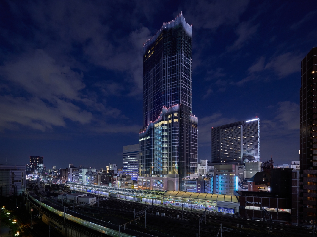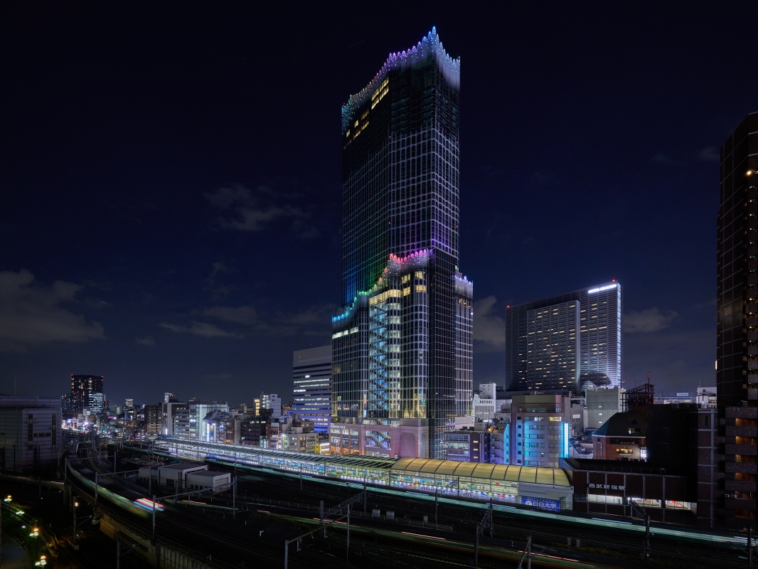 The lighting plan involves 2,800 full-color LED point light sources of about 1W, placed at the top and middle of the 225m-high building to ensure brightness and visual impact from mid- and long-distance views. Each LED is addressed to enable the movement of light like a fountain, rain, or wave. Combining colors and light movements, 16 preset patterns are utilized to create a night facade that can be changed with the seasons and events. Lighting fixtures are installed inside for easier maintenance, rather than outside. Meanwhile, an aluminum-cast facade with a traditional Japanese wave motif, called seigaiha, was planned for the base of the building.The design of the aluminum casting considering the way it receives light and the extremely narrow angle of the upward light creates a sparkling effect.