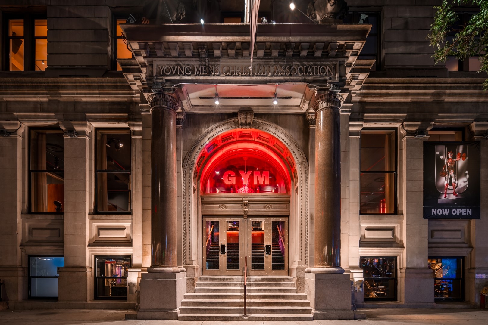 Each machine is lit dramatically with warm accent lights. Theatrical spots create steep angles, enhancing muscle definition as guests exercise.