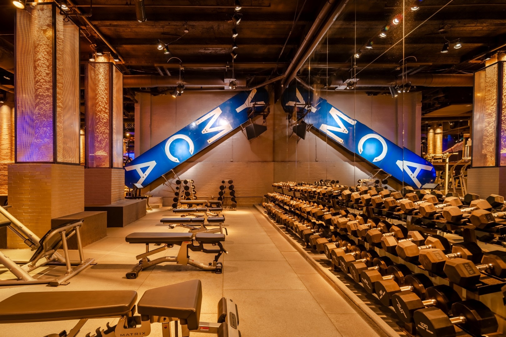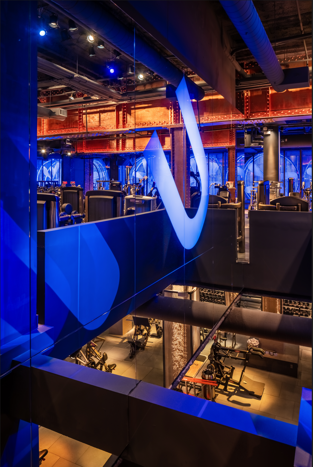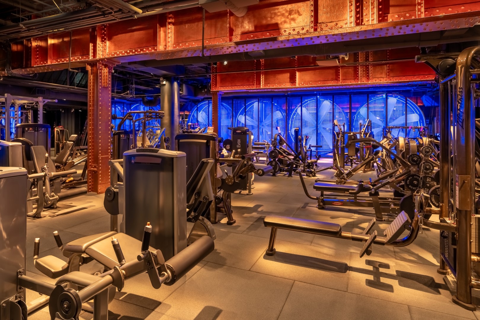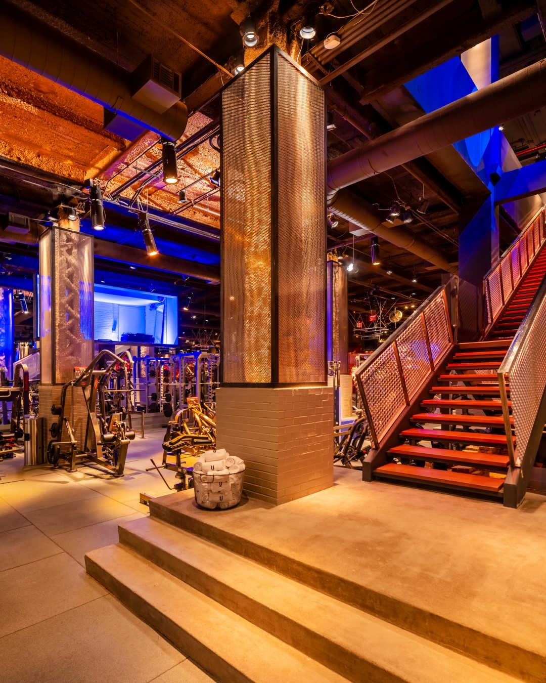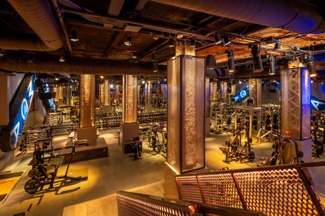 The designer worked with an artist on a large art piece by testing materials to select a translucent acrylic for fan blades and adding rings of light programmed to blue to create strong contrast to amber tones throughout the gym. Copper-painted structural elements shimmer thanks to linear amber LED uplights along the beams.