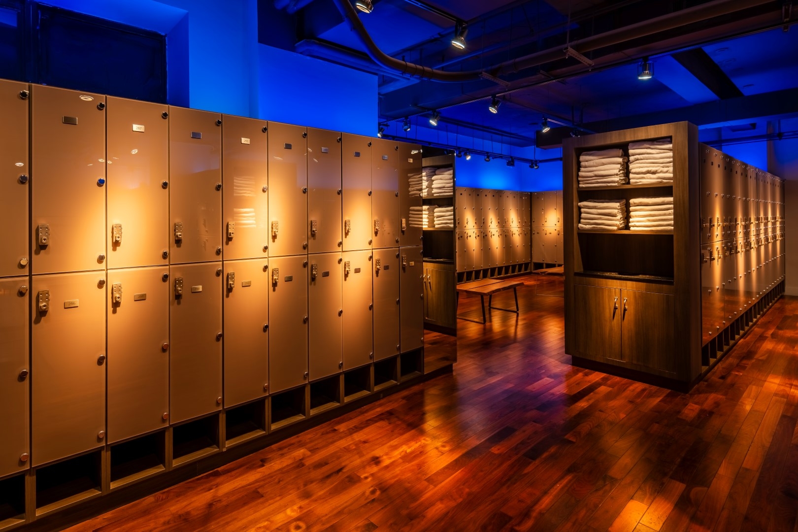 Slashes of light on reflective lockers create an energetic pattern; the bounce light provides general lighting in the room. Blue gel on Linear LED uplights create contrast above.