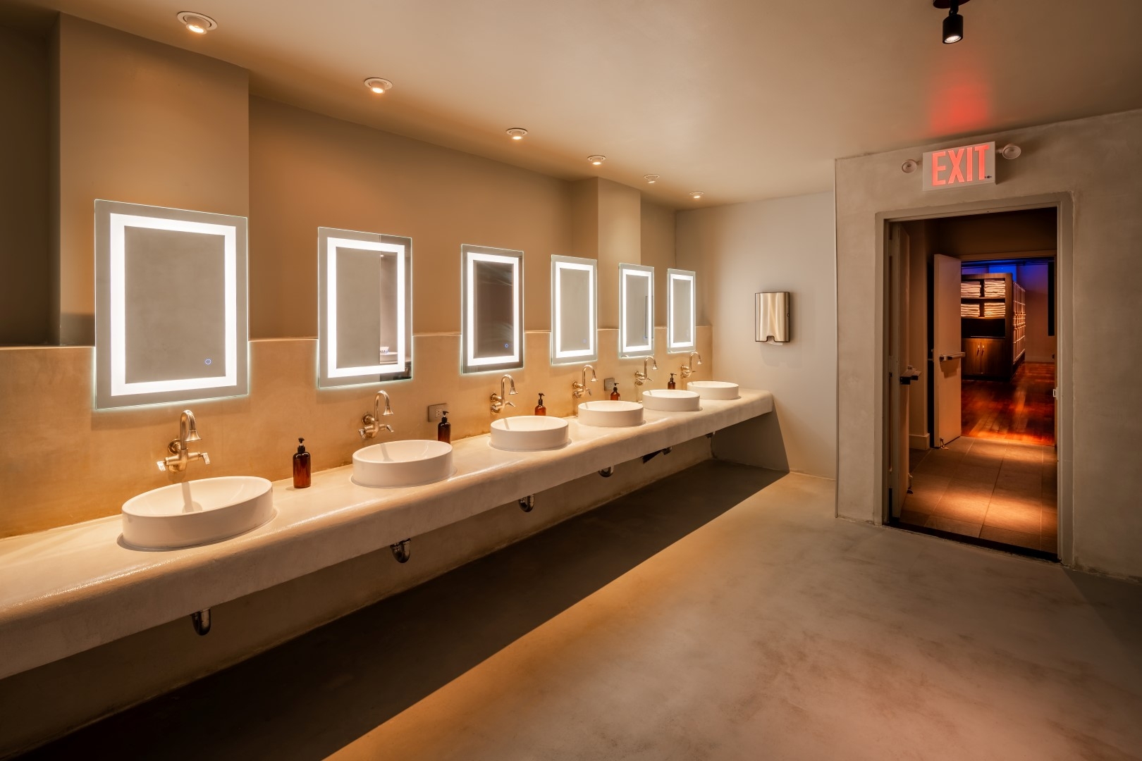 Unlike the theatrical interiors, backlit mirrors and vanity task lighting create a soft glow.