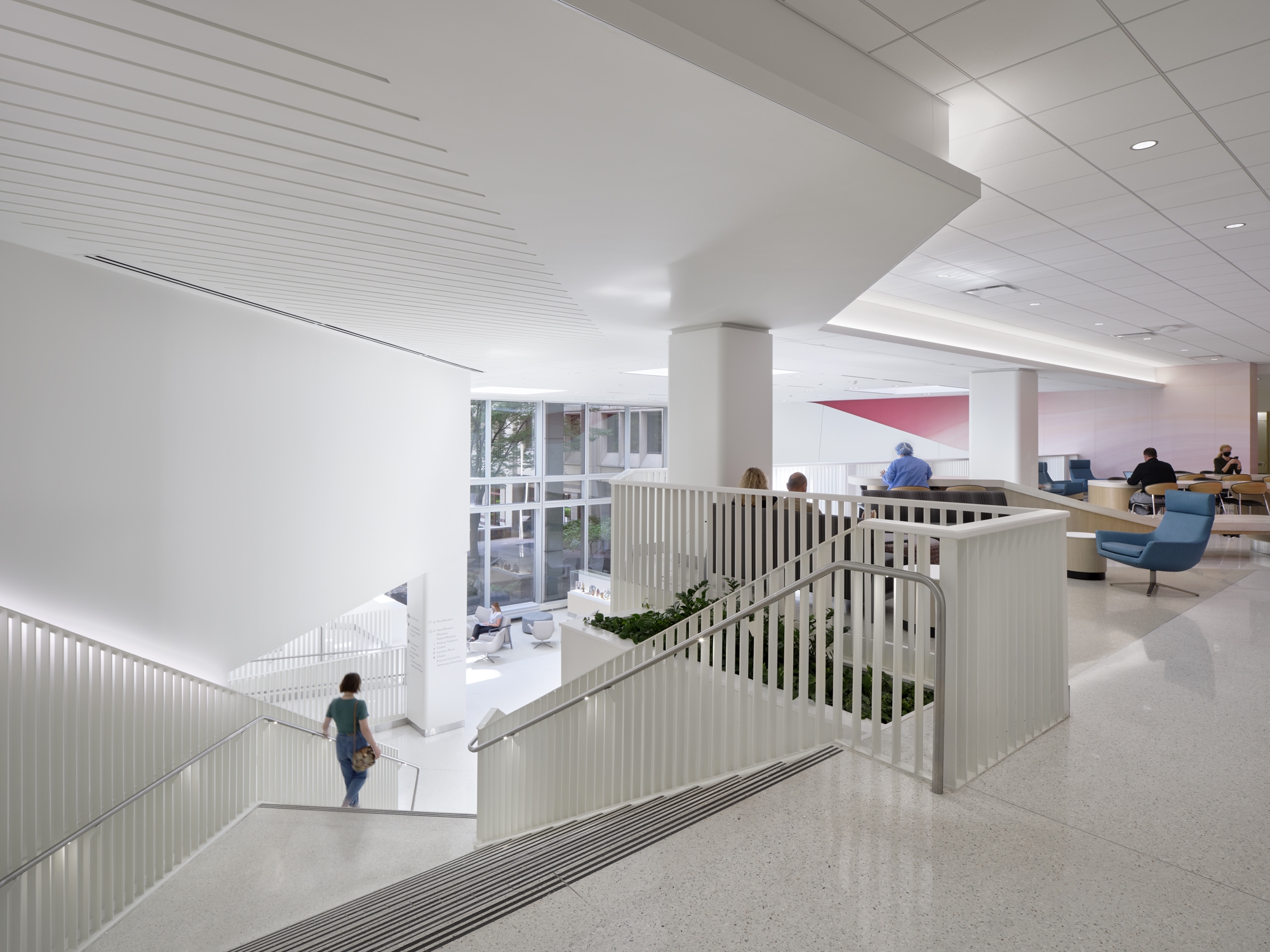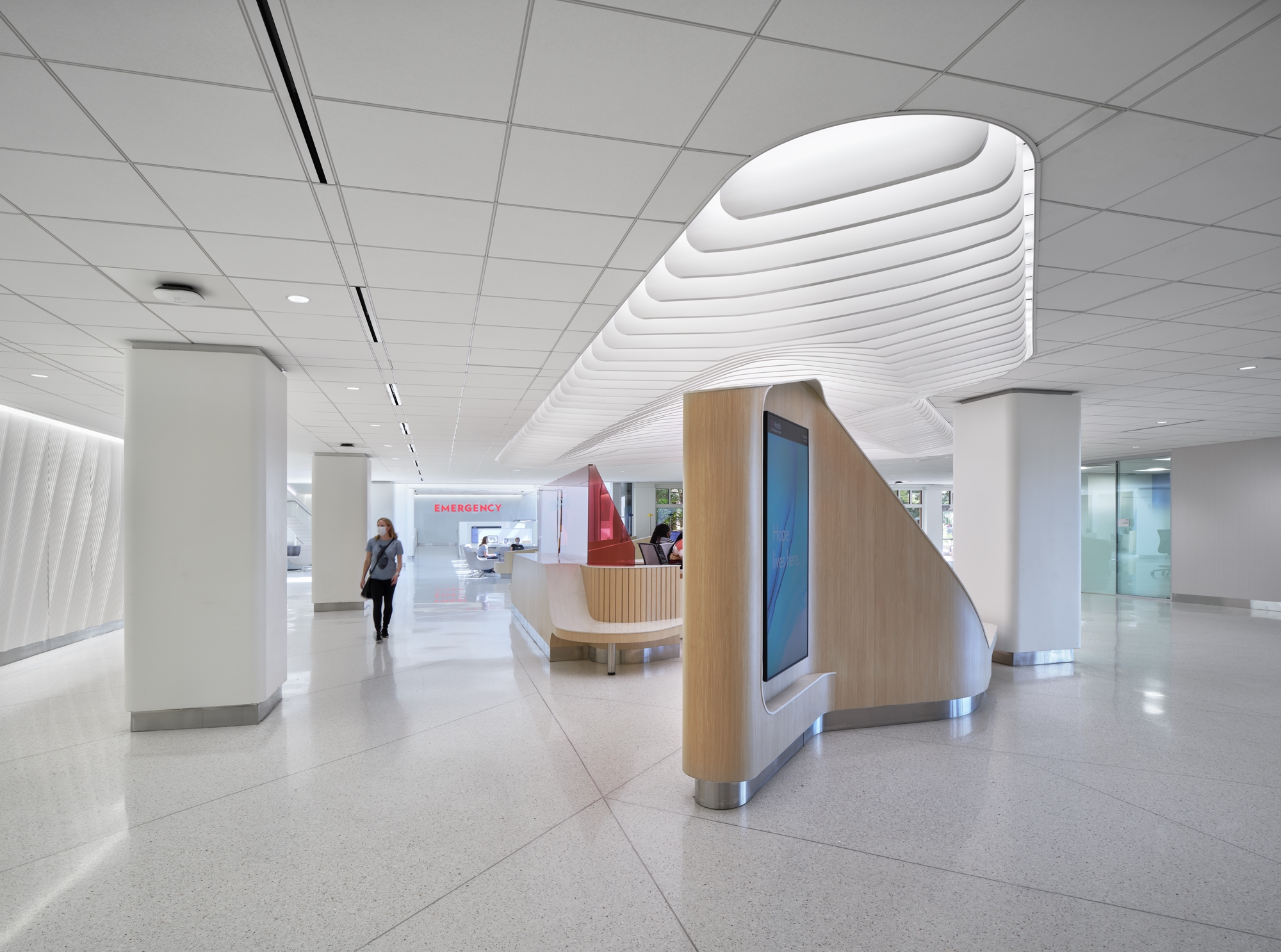 Lighting designers closely collaborated with the architect and design team to develop a solution to backlight the baffle ceiling system above the information desk. This approach reinforced a sense of arrival while making the space feel less cavernous, giving the illusion of a daylight-filled space.