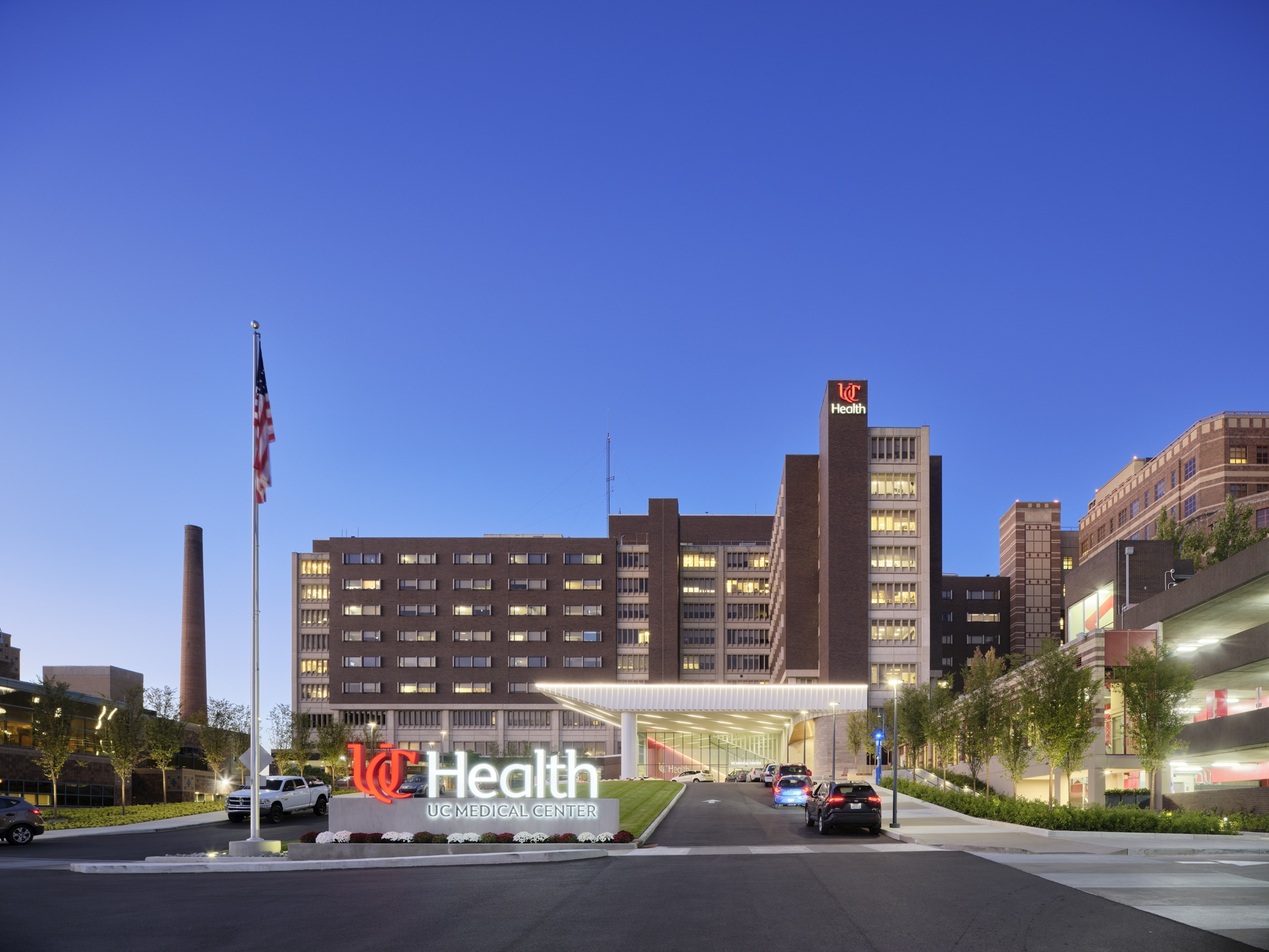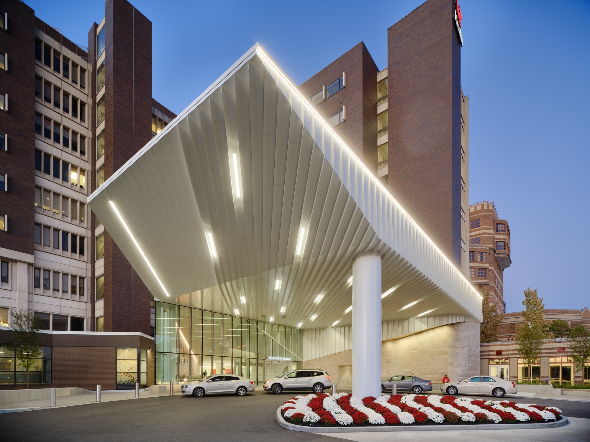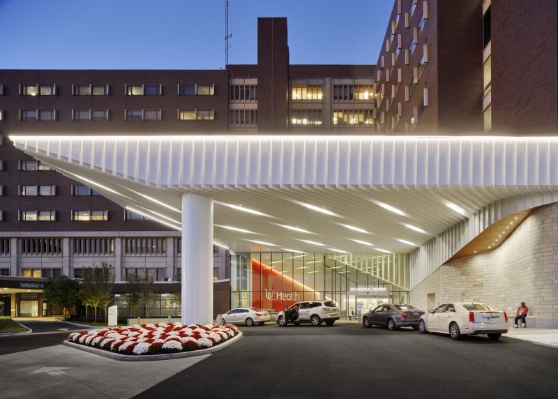 Entry DescriptionThis national ranked healthcare system engaged the design team to reimagine their patient and visitor arrival experience. Linear fixtures recessed into the entry canopy draws visitors into the lobby and provides efficient light to the site for improved safety and function. Geometric architectural enhancements add visual movement and texture to the main entry canopy.