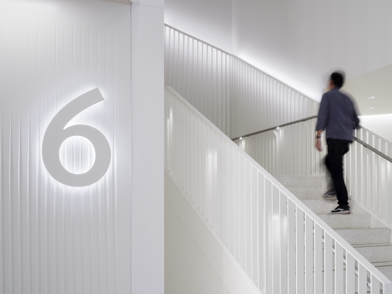Lighting designers seamlessly integrated 4000K LED luminaires, softening the modern architectural elements while emphasizing materiality and directionality of the forms. The linear luminaire originating from the exterior canopy moves its way into the interior lobby, creating visual interest.