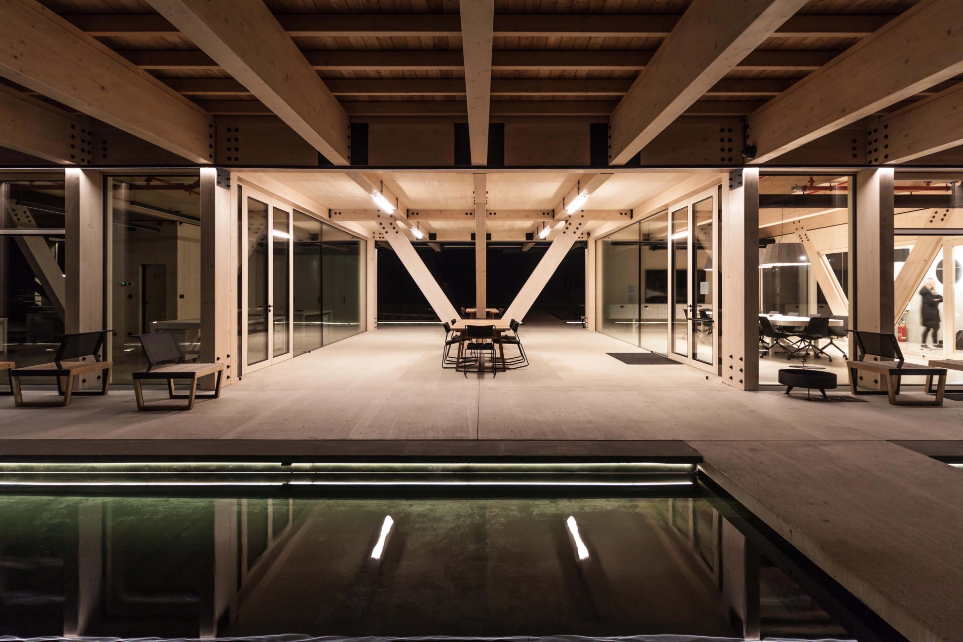 In the exterior, linear fixtures play an important role. The facade lines, where the light source and diffuser are recessed deep in the profile, so the undesired glare effect is minimized, emphasize the building structure. The water surfaces are gently lit by hidden linear light modules and a few elements of greenery are highlighted by reflectors in the adjacent garden.