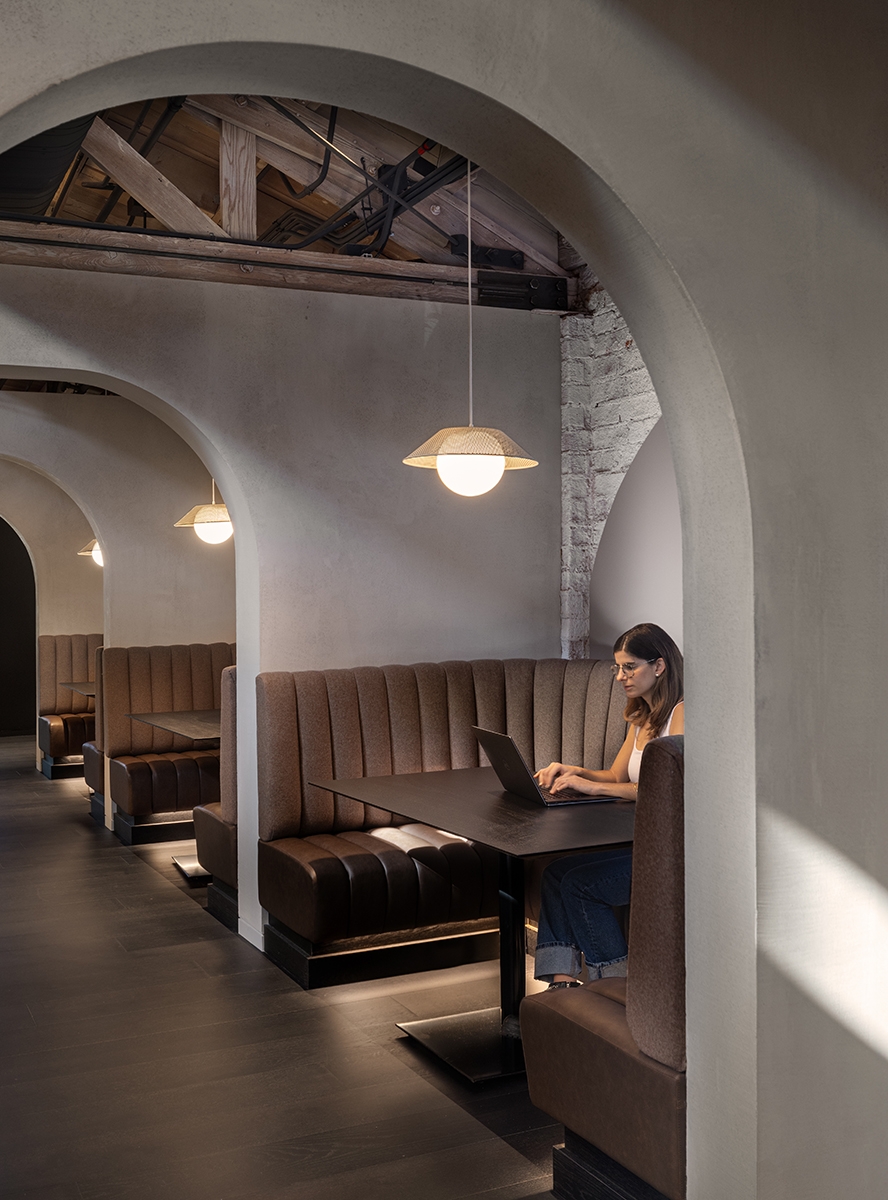 Visitors are greeted by a custom fixture in the reception area, where the elevation of the suspended pendant heads mimic the client’s logo shape, showcasing the brand in an impressionistic way.