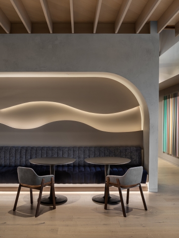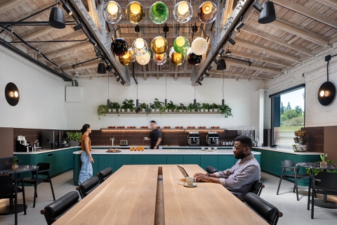 To create an intriguing atmosphere in the seating area, wall cove lighting incorporates enchanting curves. Task lighting ensures that workspaces are well-lit for productivity, while ambient lighting offers comfort. A semi-custom color glass pendant cluster revitalizes the café, making the space intimate & cozy.