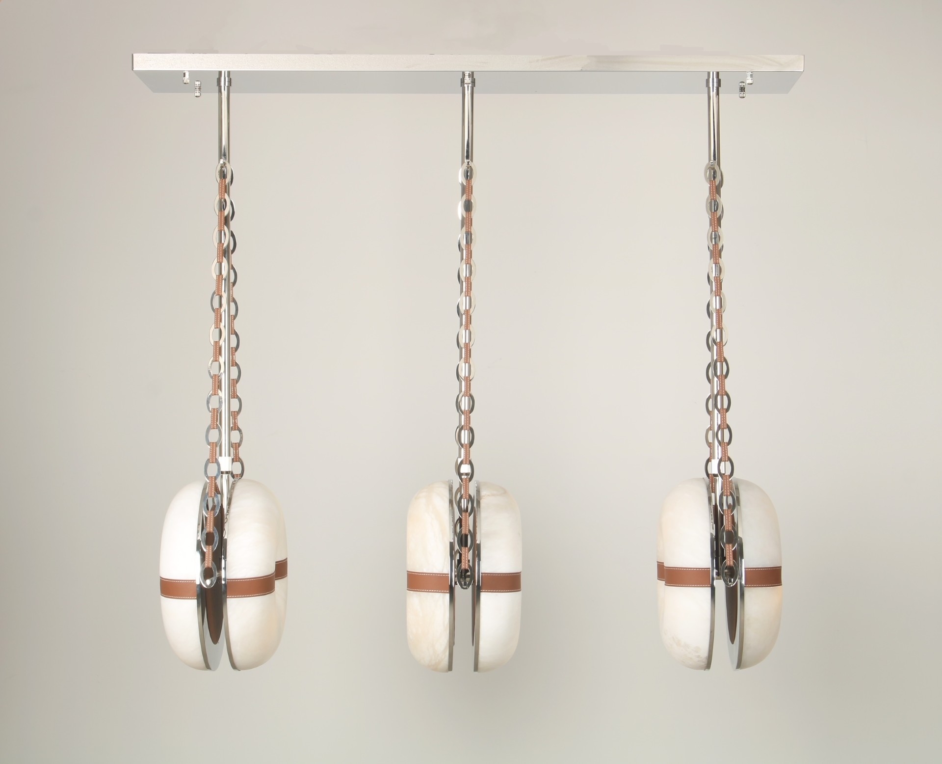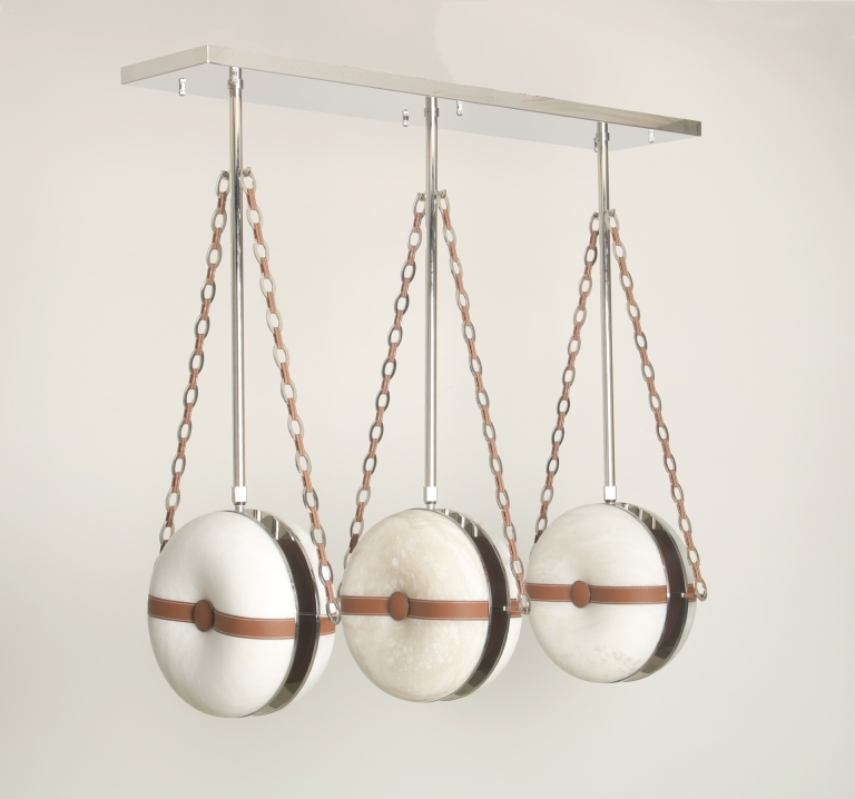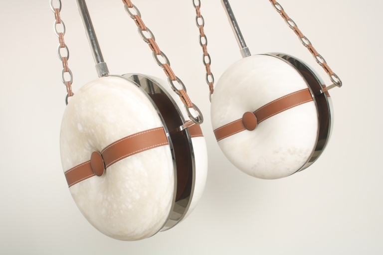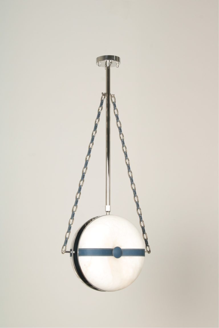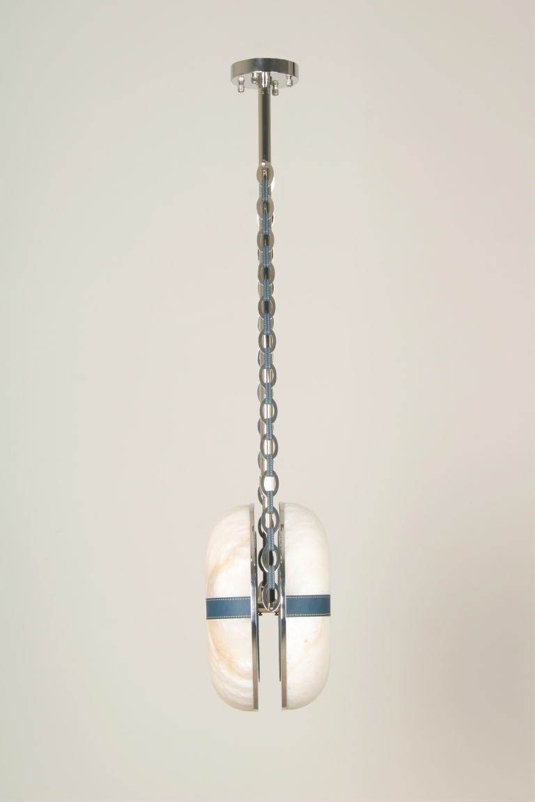 The main element of the fixture itself appears to be magically suspended by the fine leather and metal chain links, which themselves were inspired by luxury designer jewelry and handbags. The same leather is recessed into the hand carved alabaster or glass lens to further accentuate the shape of the inner bend.