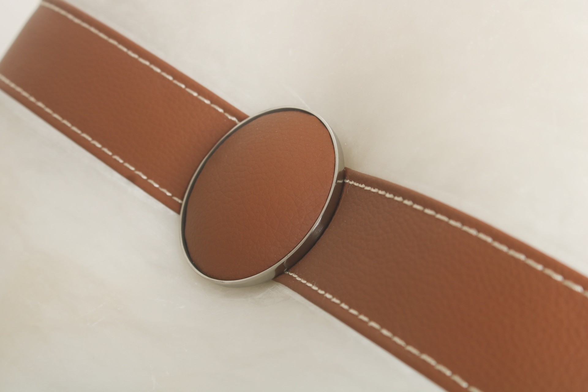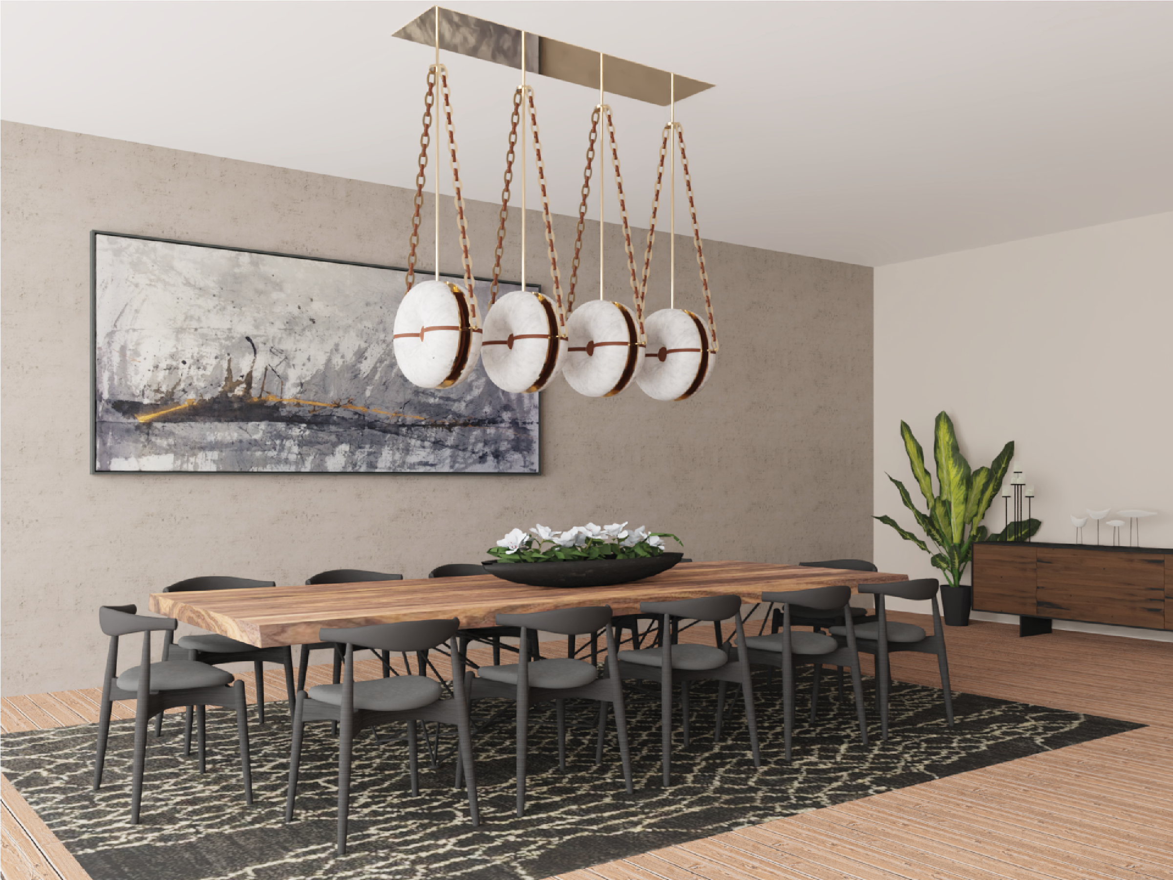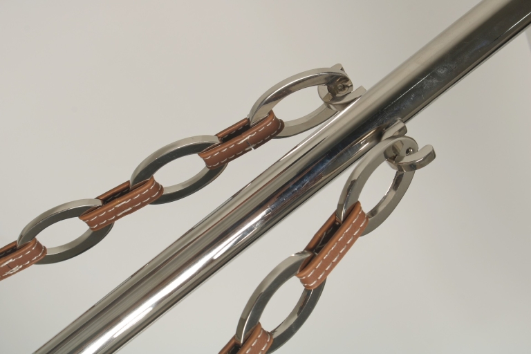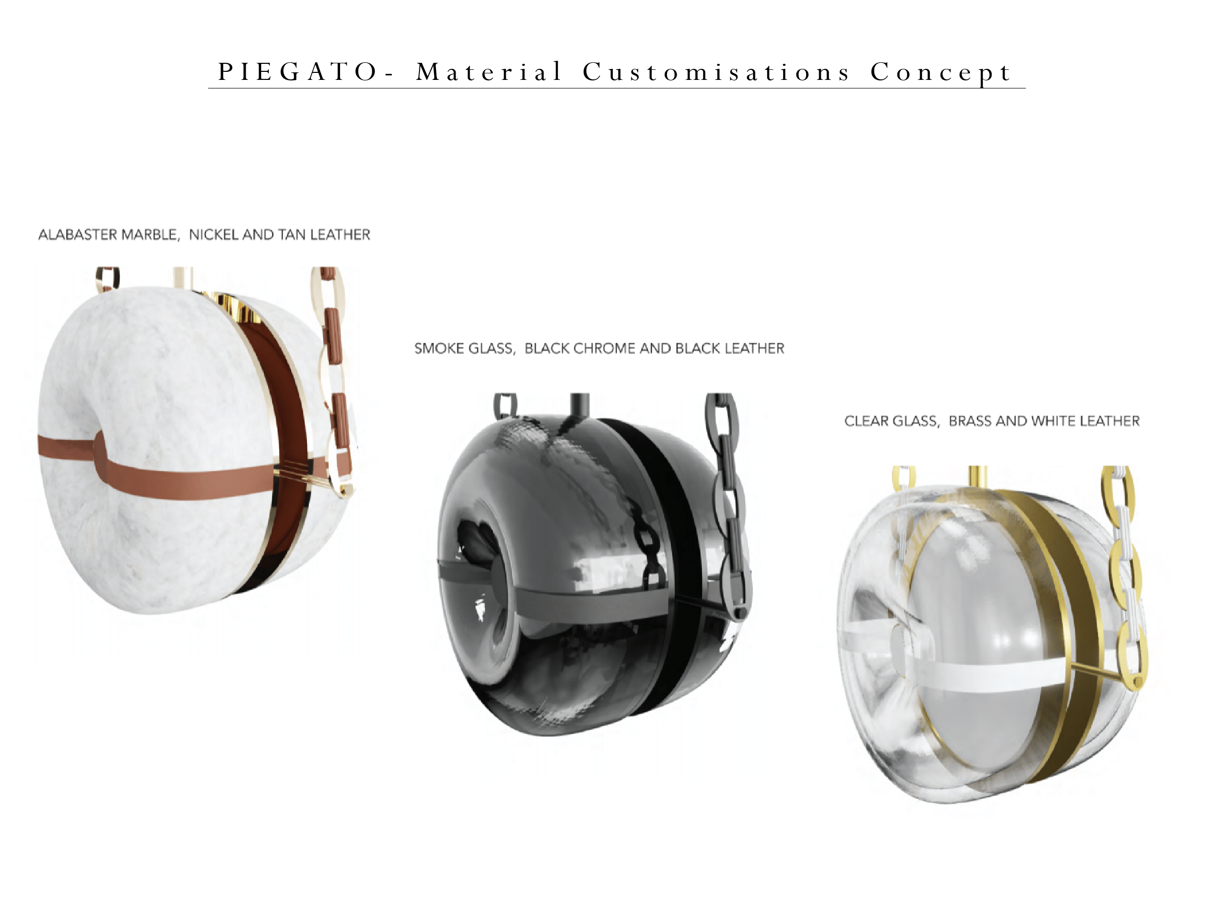 The main element of the fixture itself appears to be magically suspended by the fine leather and metal chain links, which themselves were inspired by luxury designer jewelry and handbags. The same leather is recessed into the hand carved alabaster or glass lens to further accentuate the shape of the inner bend.